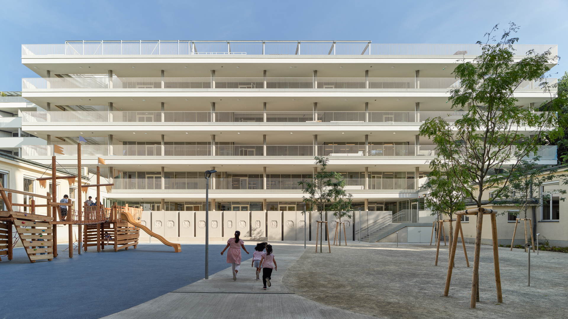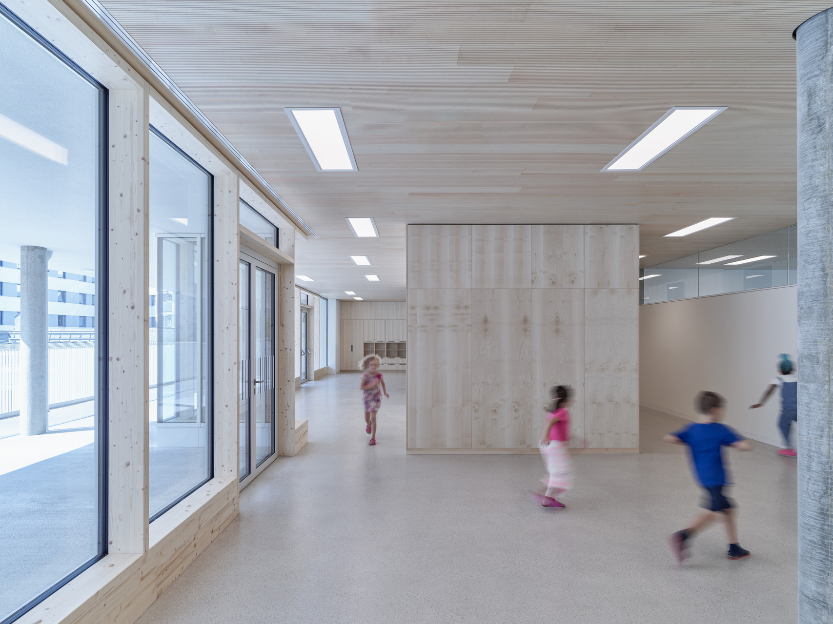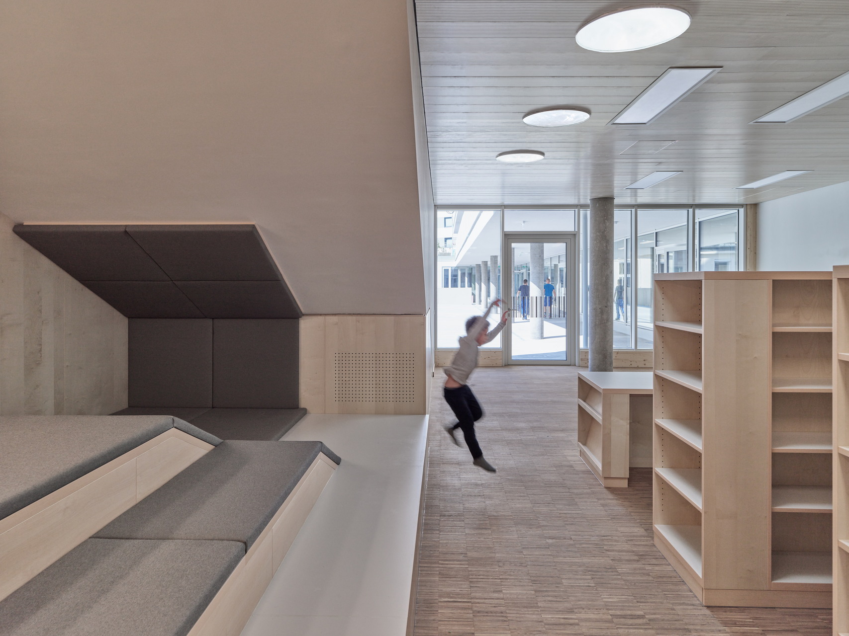 Die Eingangssituation ist straßenseitig ein wenig in den Baukörper hineingezogen, bildet eine überdachte Vorzone und schafft somit einen angemessenen, verkehrssicheren Vorplatz. Das gesamte Erdgeschoss ist offen gestaltet und zeigt einen beinahe öffentlichen Charakter. Es vermittelt zwischen Straße und Innenhof und bietet Raum für die Mensa. Die Raumstimmung in den Obergeschossen ist von kleinteiligen und intimeren, v.a. übersichtlichen Situationen geprägt. Nach dem Clustersystem organisiert, orientiert sich jeder Bildungsraum zu einer gemeinsamen Mitte mit flexibel nutzbaren Multifunktionsflächen hin, die sich wiederum zum Garten öffnen. Durch viel Licht und auffällig edel gefügte natürliche Materialien – vorwiegend Holzoberflächen – entsteht eine frische und angenehme Lernatmosphäre. Allen Geschossen sind zum Hof hin große Terrassen vorgelagert und entschädigen ein wenig für die fehlende Aussicht in den Matznerpark hinüber, mit dem der Altbau gegenüber trumpfen kann. Außentreppen bieten direkten Zugang hinab in den Innenhof und auch hinauf zur Dachterrasse mit Dachgarten und Sportplatz. (Autor: Achim Geissinger, nach einem Text der Architekten)