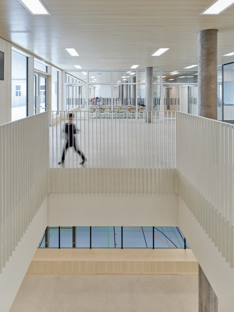 Die benötigte Turnhalle liegt, um die Pausenhoffläche nicht einzuschränken, eingegraben unter dem Gebäude und erhält Tageslicht über Oberlichter im Hof.