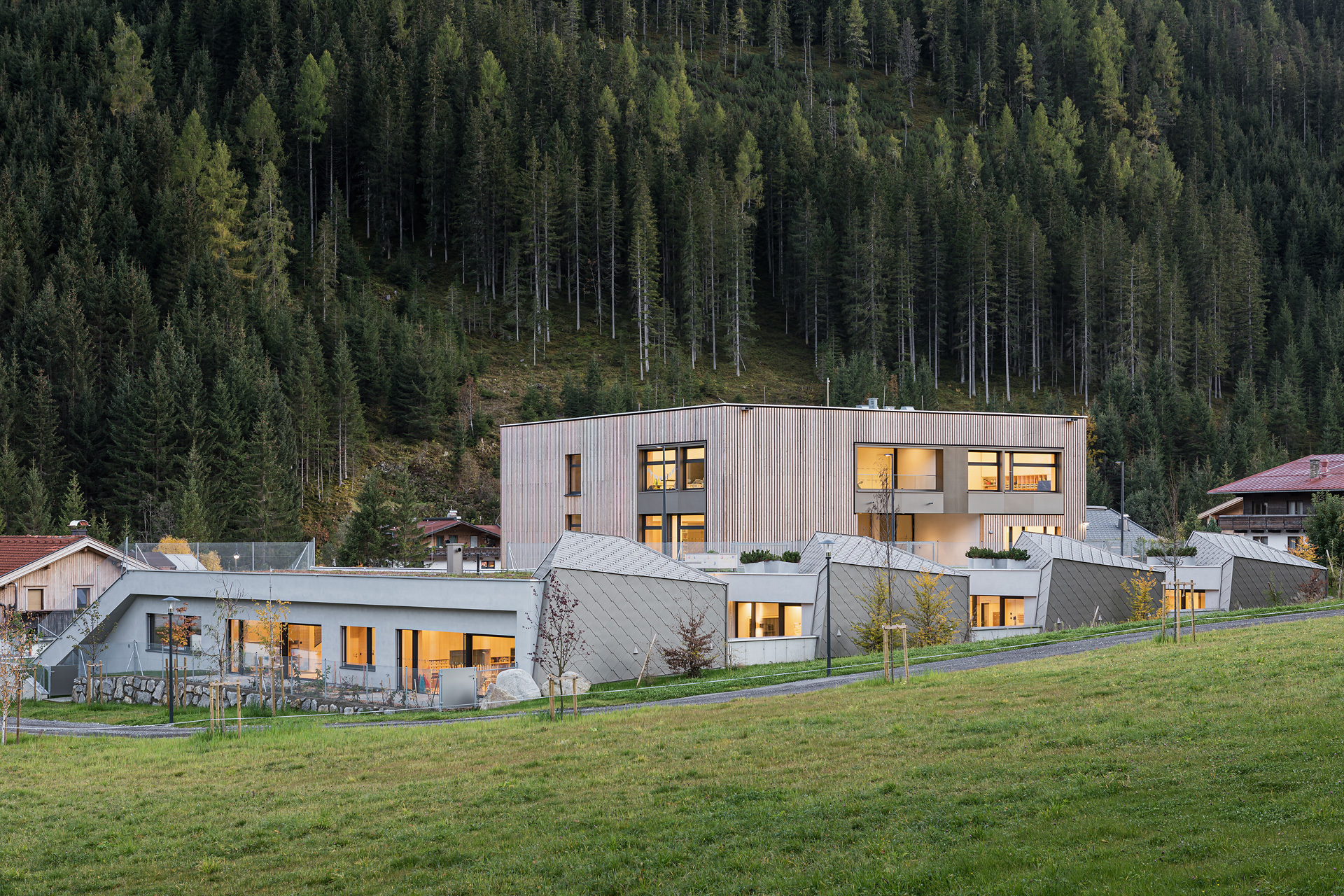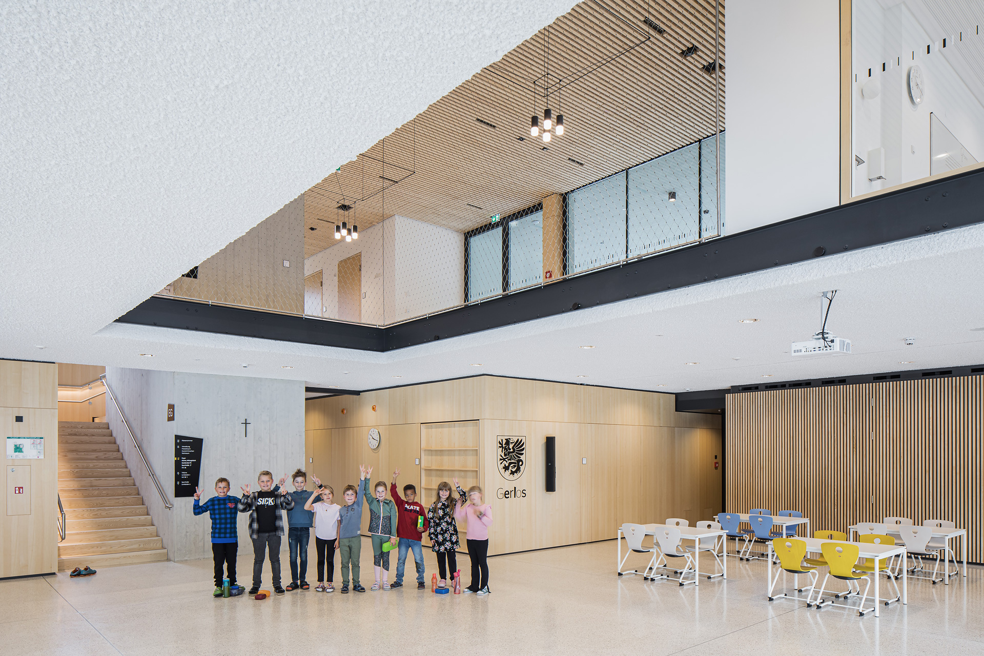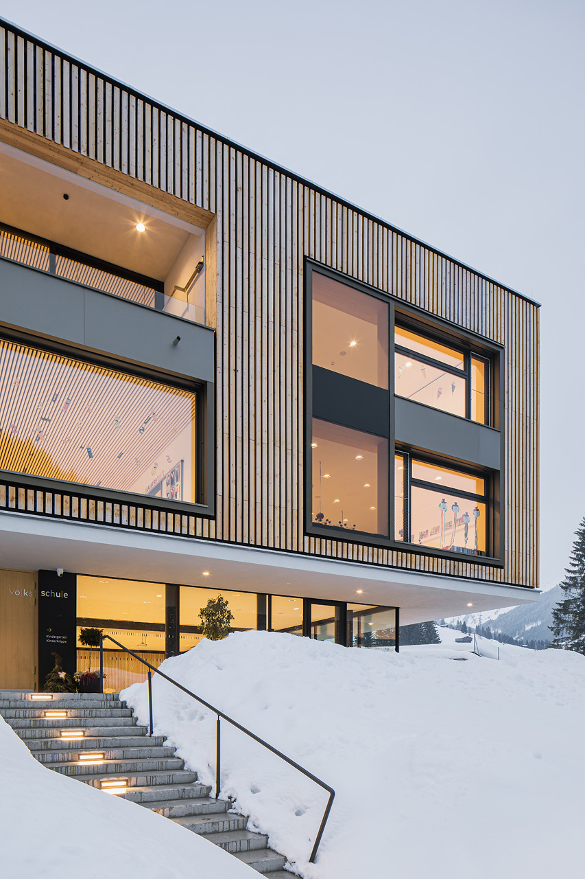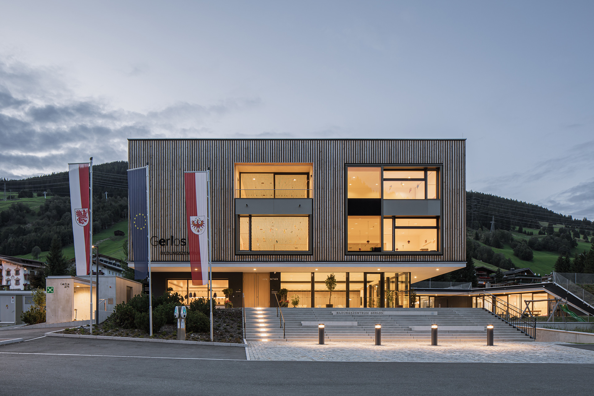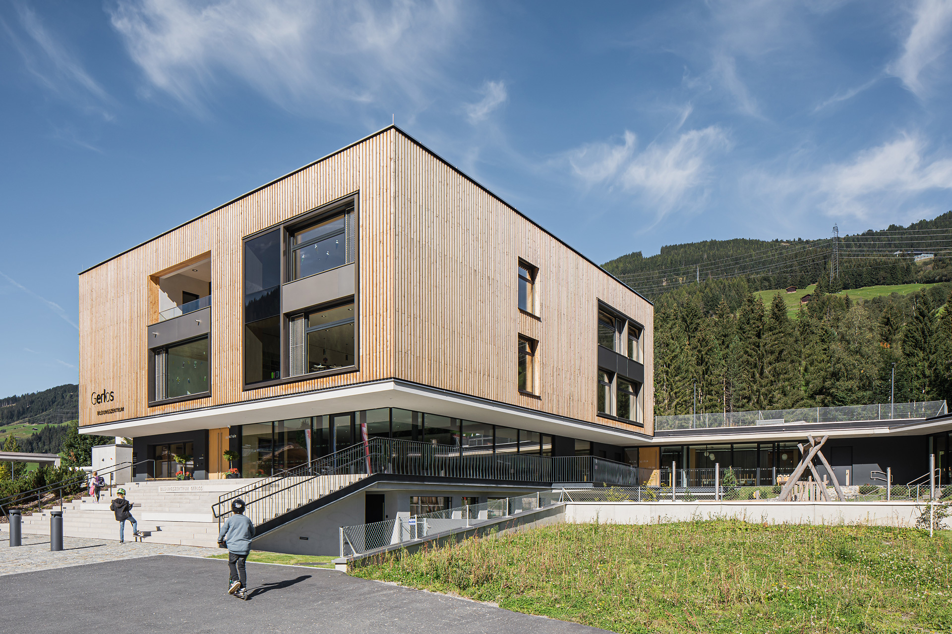 Unisono Architekten, die den von der Gemeinde in Zusammenarbeit mit der Dorferneuerung Tirol ausgeschriebenen EU-weit offenen Wettbewerb gewinnen konnten, schufen dafür am Ortsrand von Gerlos eine vielfältige Welt für Kinder, die das Potenzial des Ortes mit den Anforderungen einer zeitgemäßen Pädagogik verbindet. Das Projekt besteht aus zwei unterschiedlichen Baukörpern – der eher städtisch ausformulierten Volksschule und dem landschaftlich konzipierten Kindergarten –, die gemeinsam einen Spielhof umrahmen.