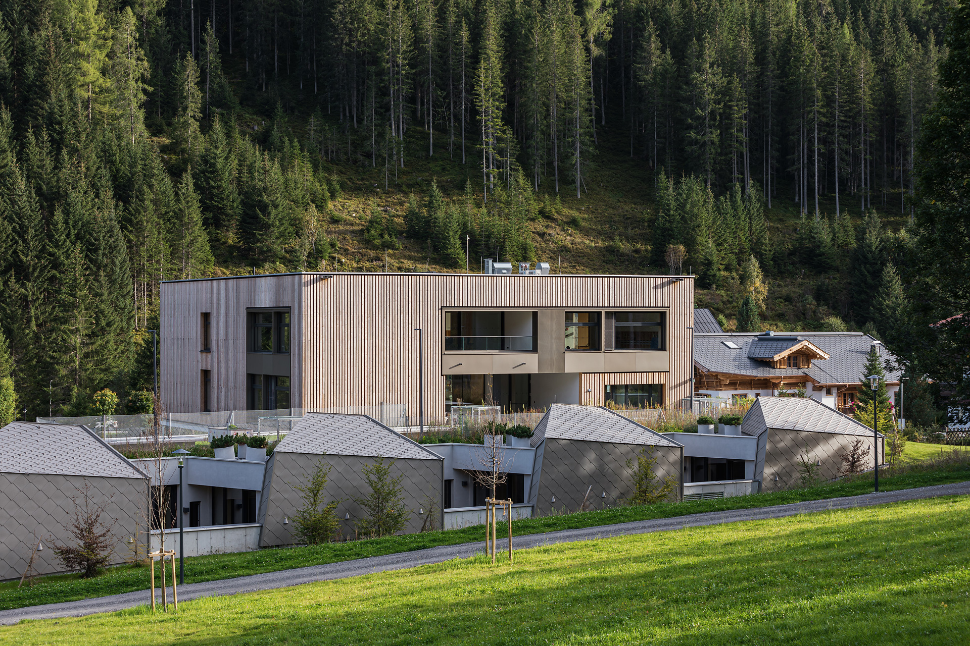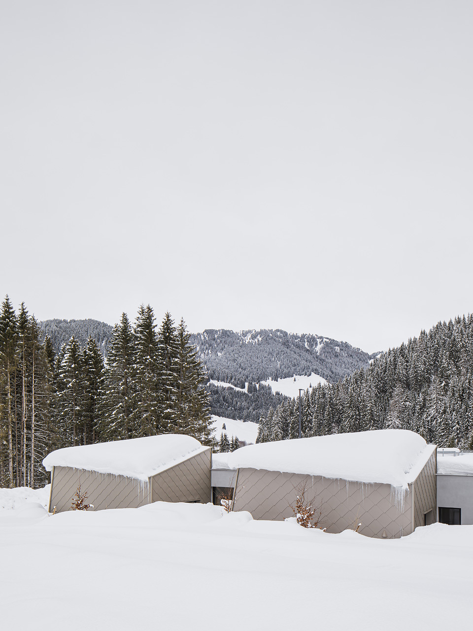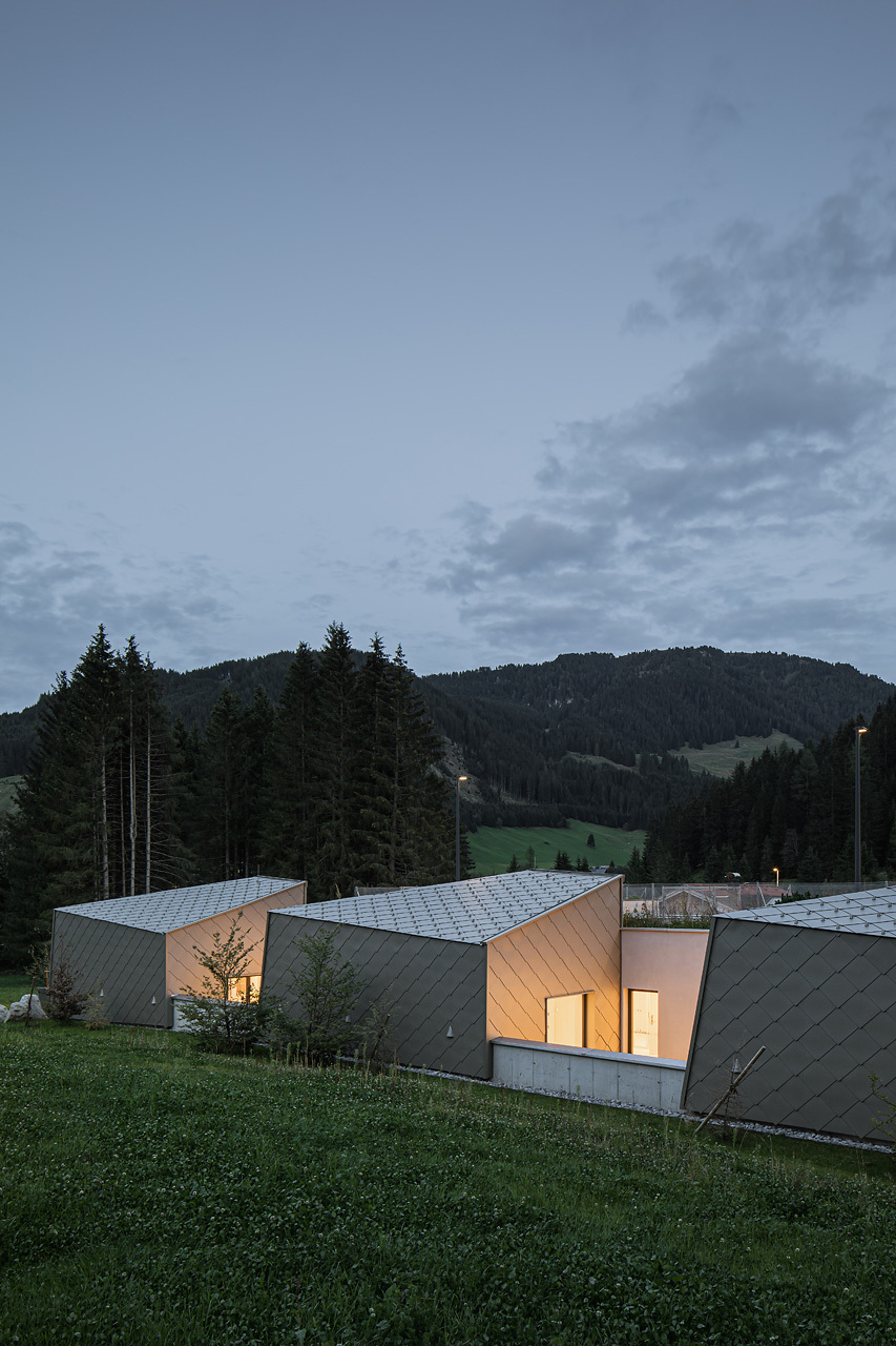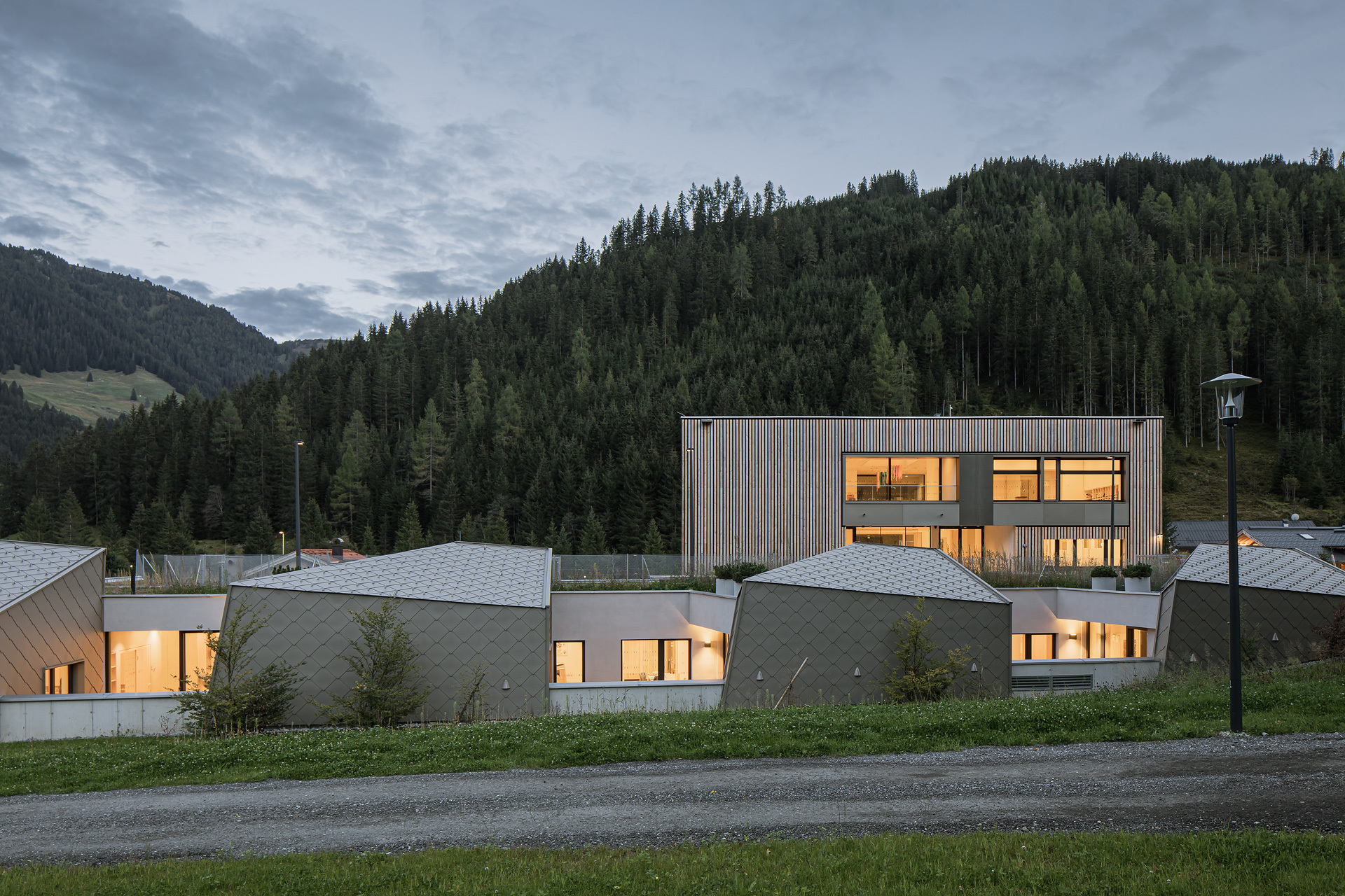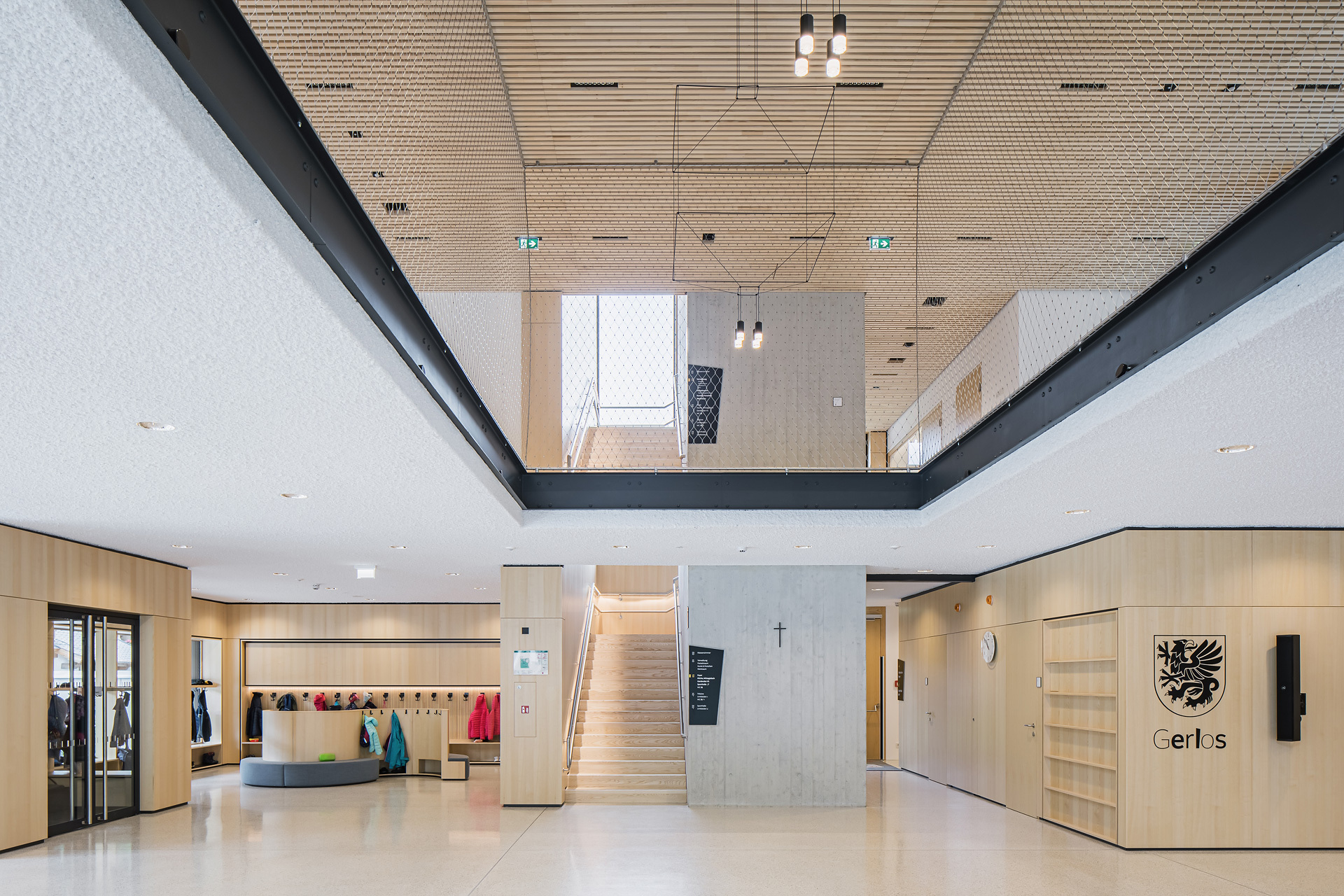 Unisono Architekten, die den von der Gemeinde in Zusammenarbeit mit der Dorferneuerung Tirol ausgeschriebenen EU-weit offenen Wettbewerb gewinnen konnten, schufen dafür am Ortsrand von Gerlos eine vielfältige Welt für Kinder, die das Potenzial des Ortes mit den Anforderungen einer zeitgemäßen Pädagogik verbindet. Das Projekt besteht aus zwei unterschiedlichen Baukörpern – der eher städtisch ausformulierten Volksschule und dem landschaftlich konzipierten Kindergarten –, die gemeinsam einen Spielhof umrahmen.
