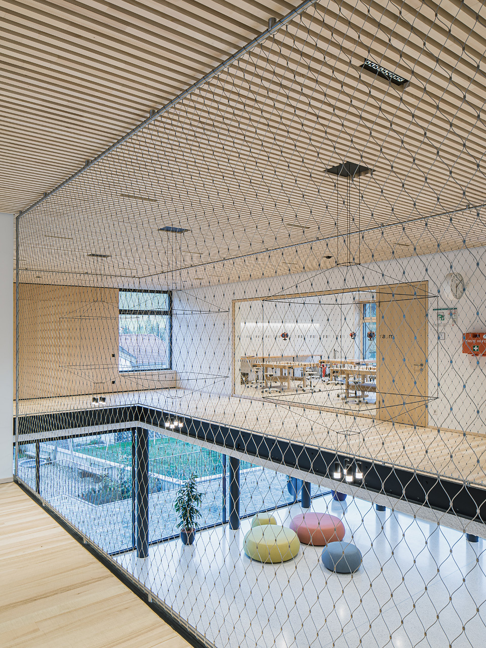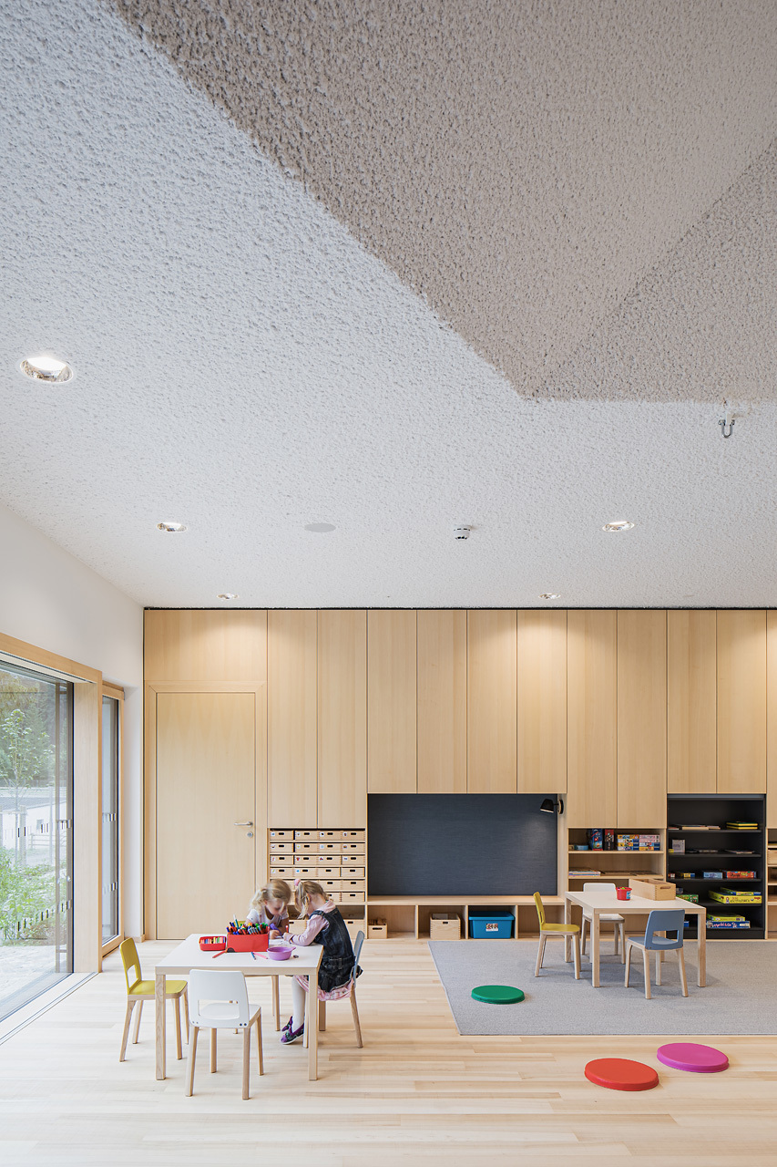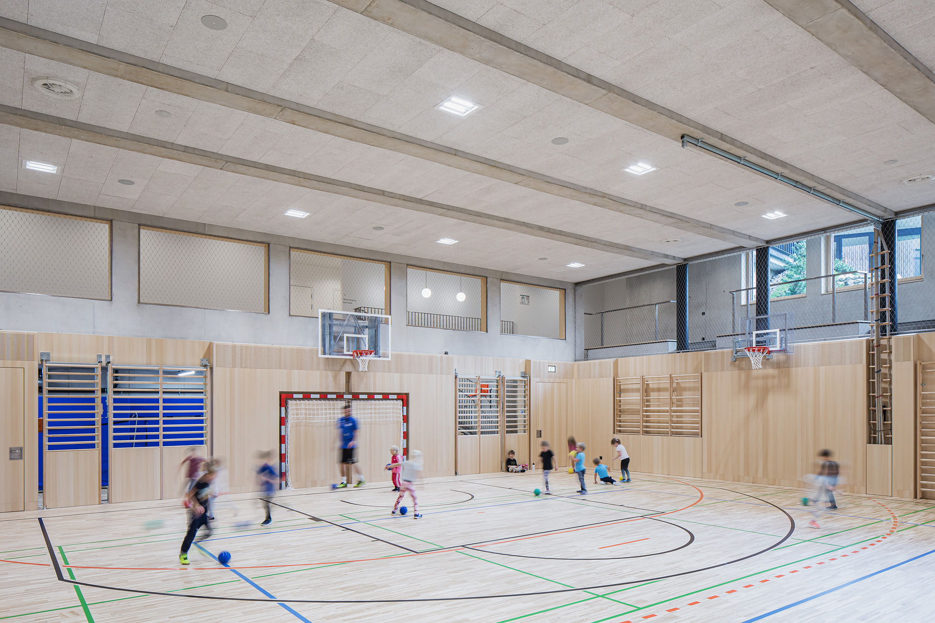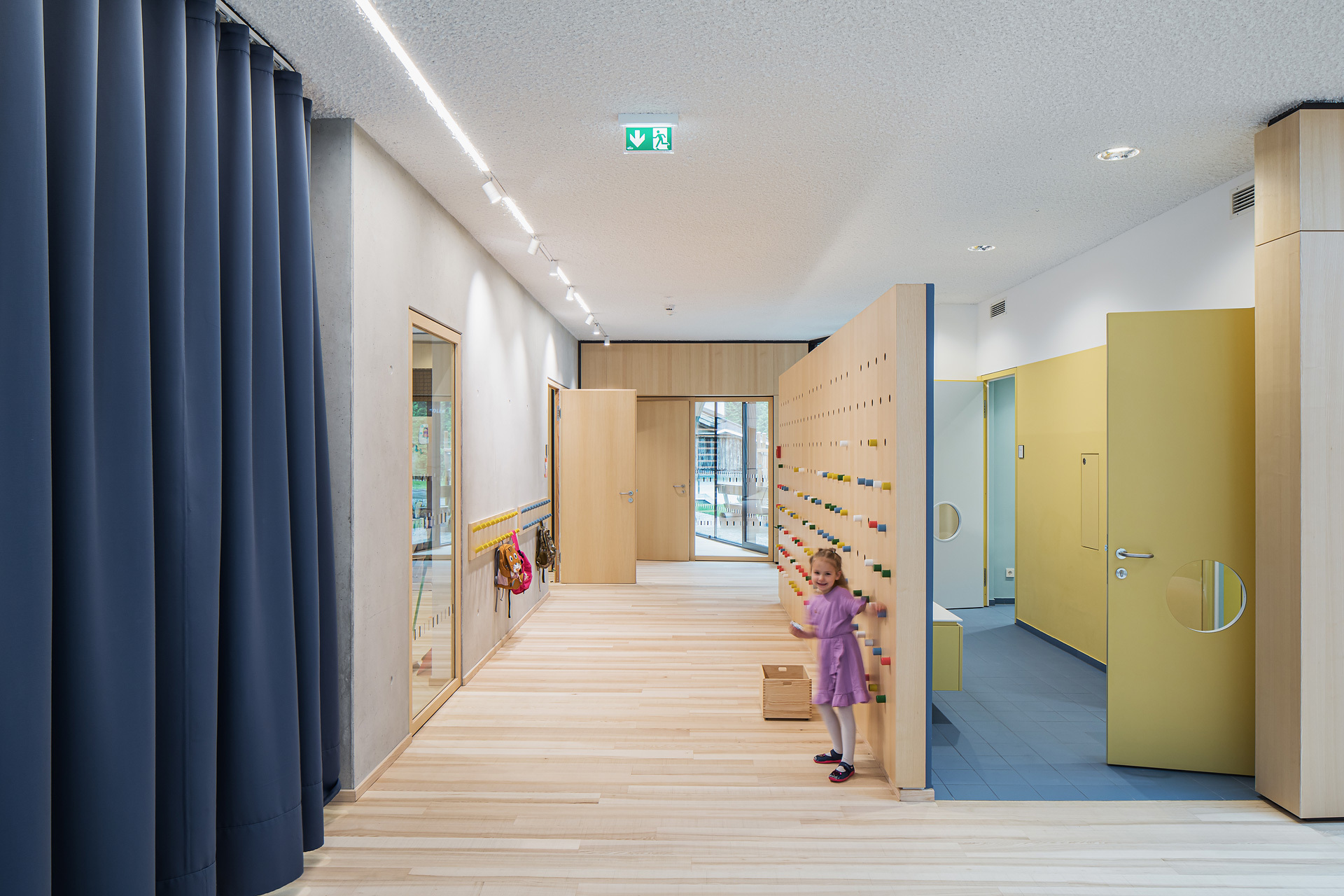Nicht unwesentlich ist auch die Entflechtung der Verkehrsströme durch einen Parkplatz mit Kiss & Ride, der ein geschütztes Kommen und Gehen der Kindergarten- und Volksschulkinder ermöglicht. Der angrenzende Vorplatz mit seinen großzügig überdachten Bereichen wird so zur Begegnungszone für Kinder aller Altersgruppen. (Text: Claudia Wedekind)