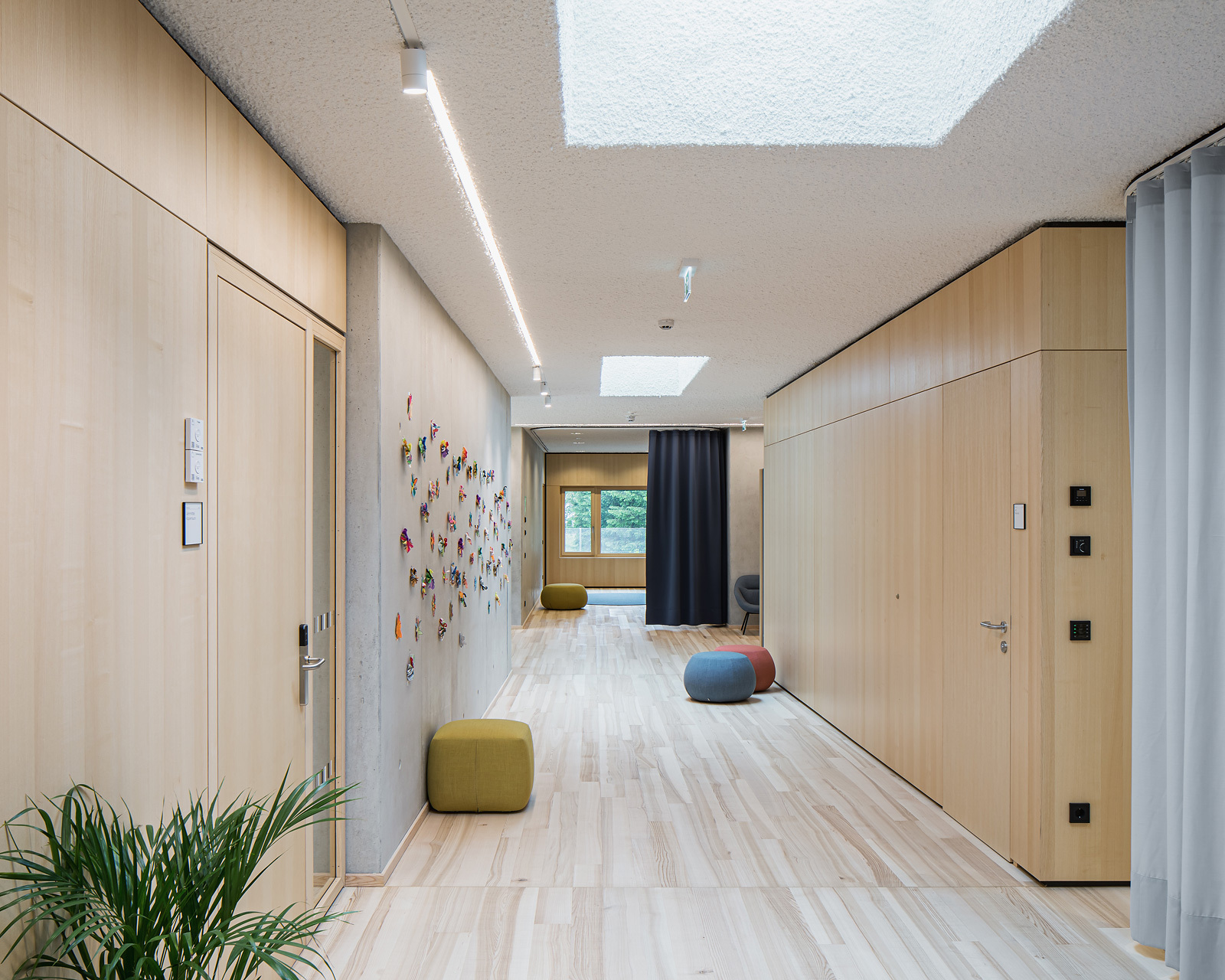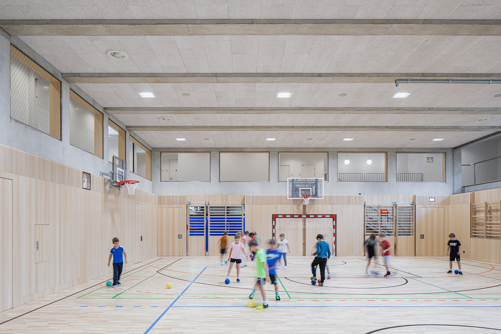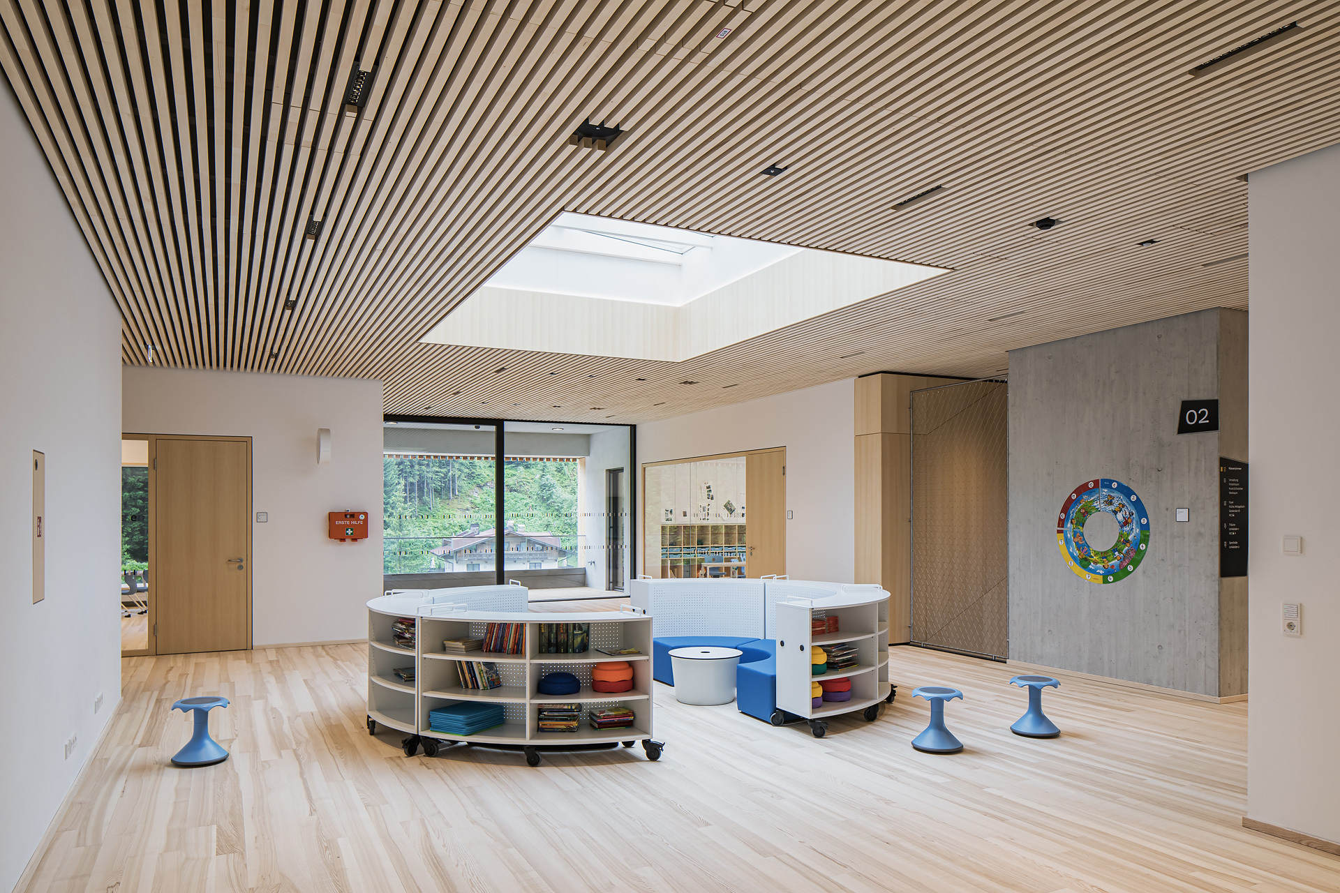 Nicht unwesentlich ist auch die Entflechtung der Verkehrsströme durch einen Parkplatz mit Kiss & Ride, der ein geschütztes Kommen und Gehen der Kindergarten- und Volksschulkinder ermöglicht. Der angrenzende Vorplatz mit seinen großzügig überdachten Bereichen wird so zur Begegnungszone für Kinder aller Altersgruppen. (Text: Claudia Wedekind)
