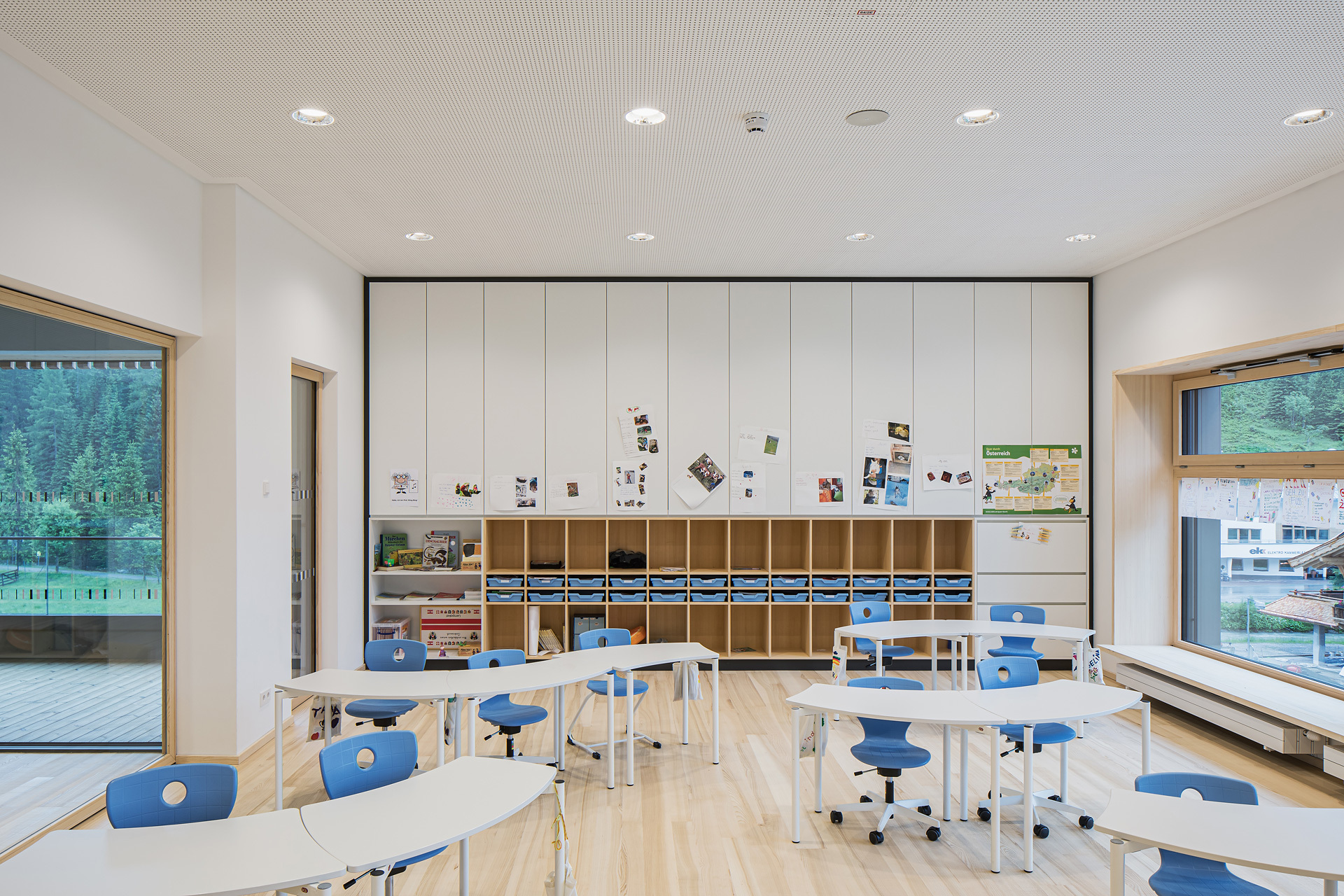 Für die Volksschule wurde ein dreigeschoßiges, kubisches Volumen entwickelt, das sich wie alle Gebäude im Ort zur Gerlos Straße hin orientiert. Herzstück im Erdgeschoß ist ein großer, zum Vorplatz hin öffenbarer Multifunktionsraum, der zugleich Foyer, Marktplatz und Essbereich ist. Im ersten Obergeschoß liegen rund um einen zentralen Luftraum die Kreativräume, die Nachmittagsbetreuung und die Verwaltung, im zweiten Obergeschoß die vier Klassenräume sowie zwei Gruppenräume mit Terrassen.