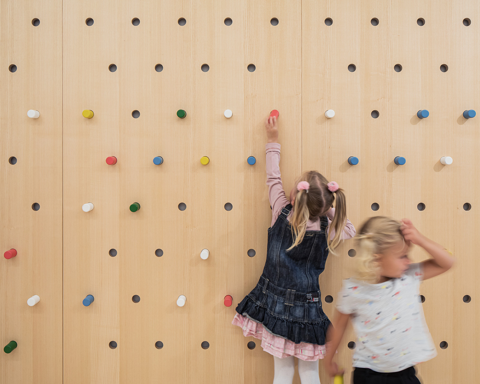 Angebunden an diesen Hochpunkt entstand für Kindergarten und Kinderkrippe ein eingeschoßiger, horizontal in die Landschaft eingebetteter Baukörper, der sich im Norden entlang der Hangkante kammartig mit der Umgebung verzahnt. An die gemeinsam genutzten Flächen für Garderobe, Küche und Essraum schließen sich die beiden abtrennbaren Einheiten für die jeweils 2-gruppigen Kinderbetreuungseinrichtungen an, denen jeweils eigene Freiflächen zugeordnet sind.