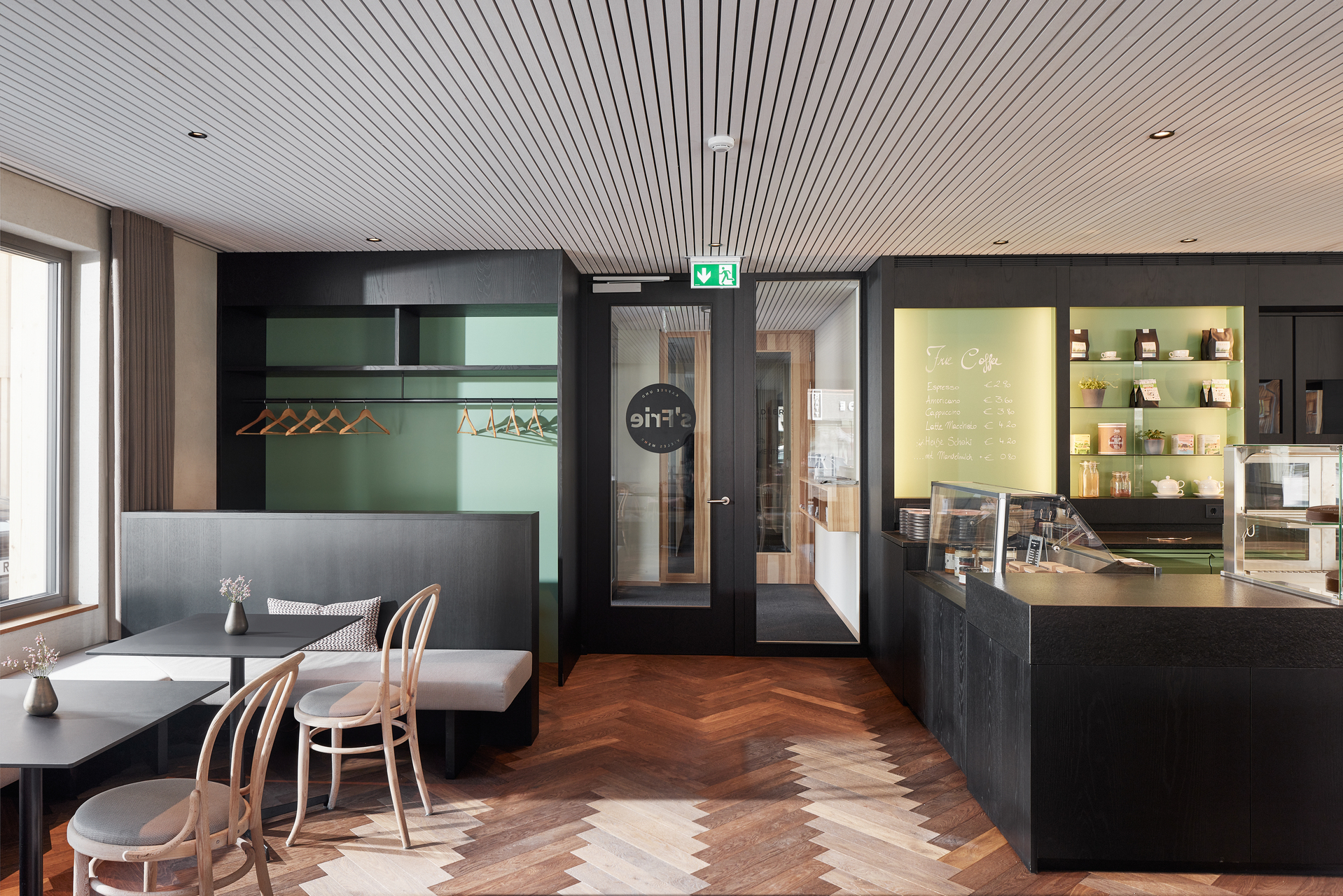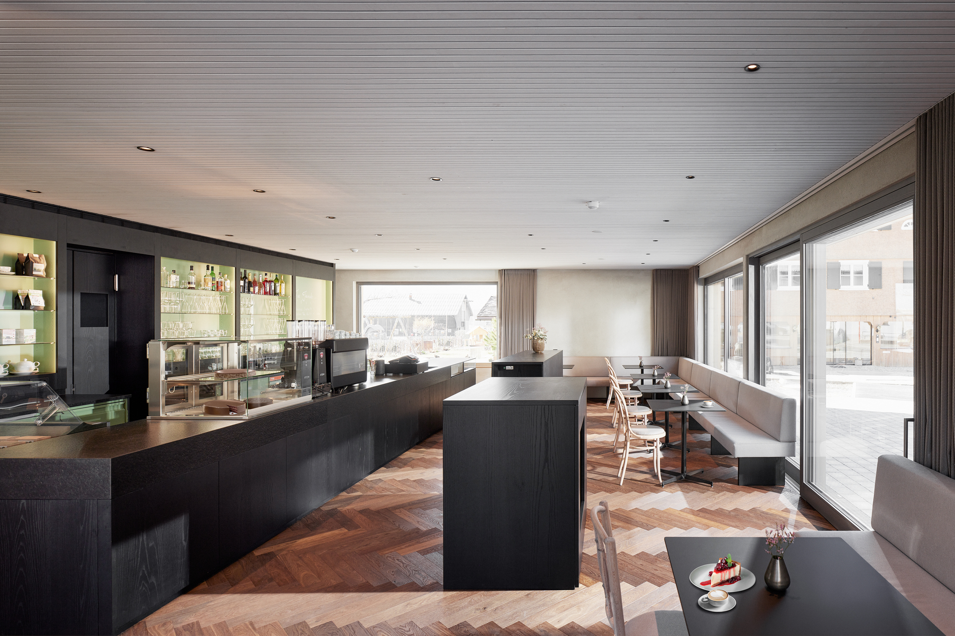 Die hohe Frequenz an der Selbstbedienungstheke galt es zu berücksichtigen, zugleich eine angenehme Aufenthaltsqualität an den Tischen zu schaffen. Schwarzer Stein und in Schwarz getauchte Hölzer halten sich im Hintergrund. Die weiß gekalkte Holzakustikdecke und wolkige Kalkputzwände mit dezenten Vorhängen schaffen Atmosphäre. Auch finden die aufgefrischten Bugholzstühle des benachbarten Hotel Adler hier eine neue Verwendung. Hohe Aufmerksamkeit galt der Akustik und Beleuchtung. (Text: Architekten, bearbeitet)