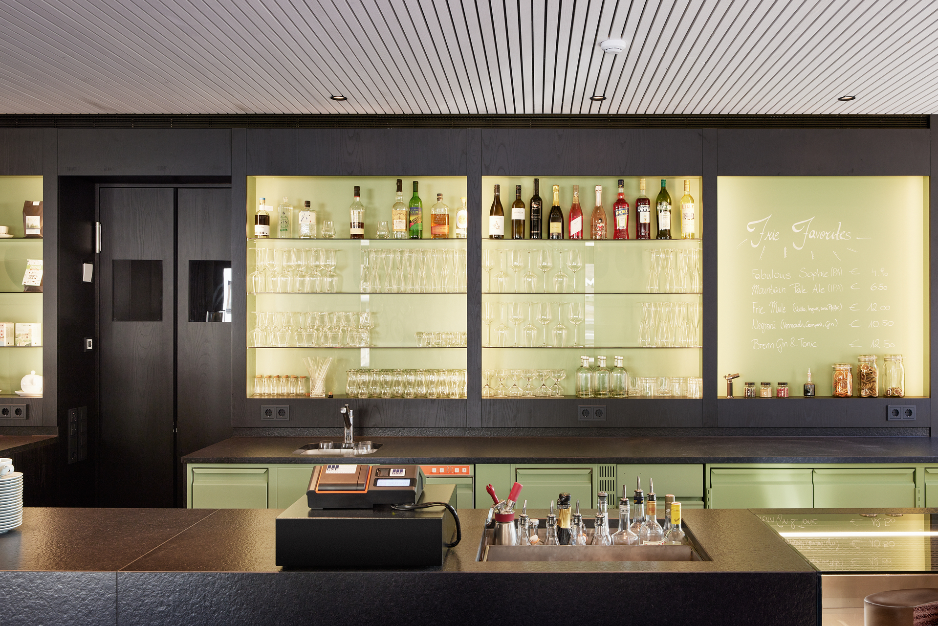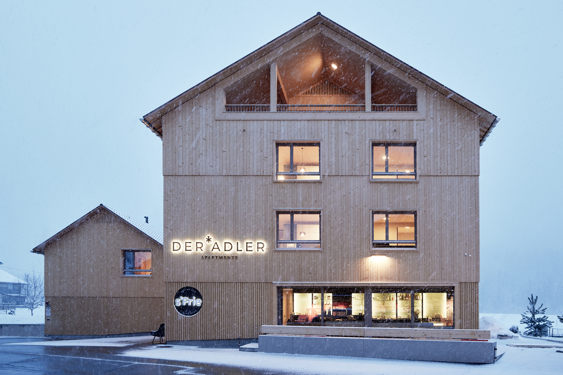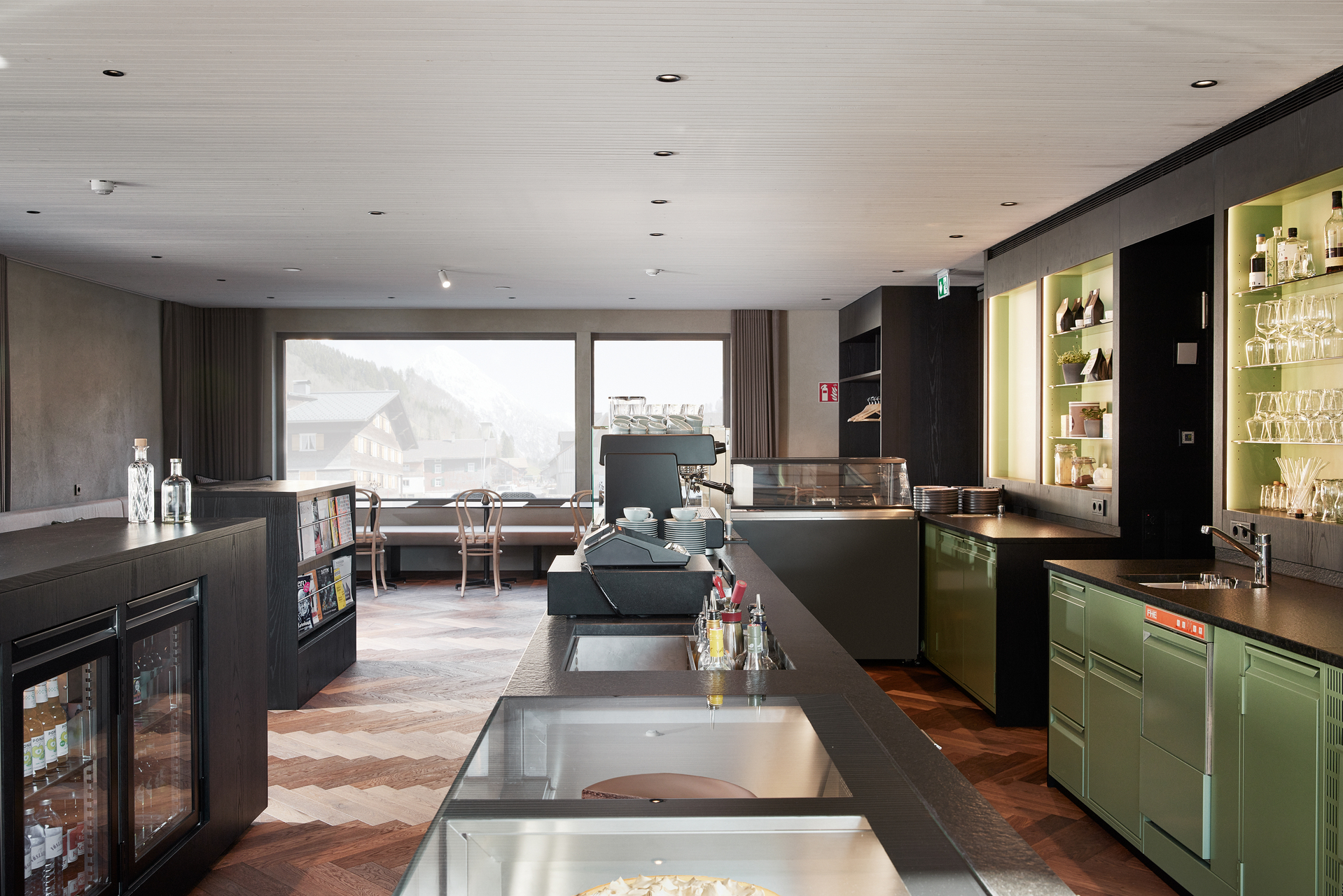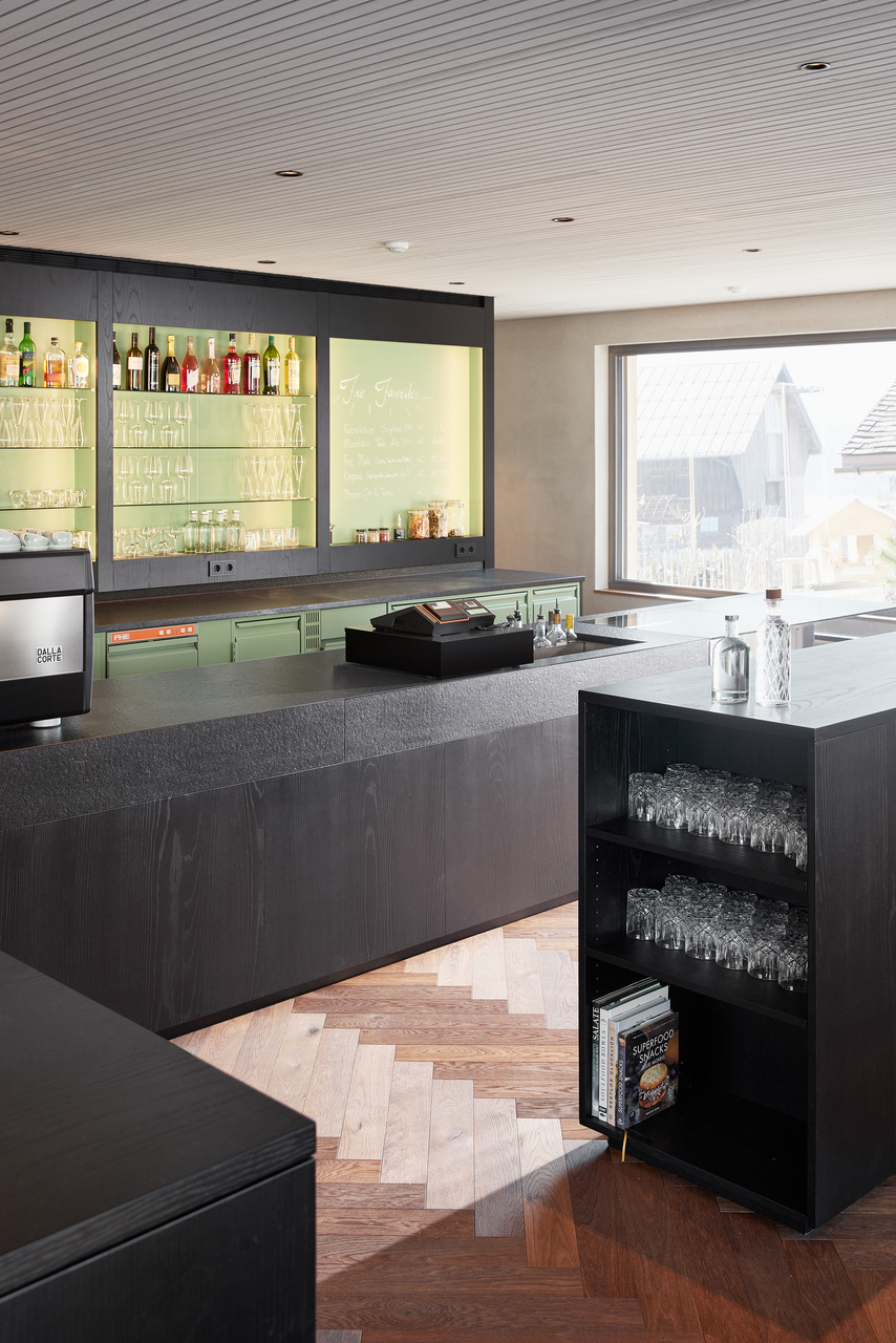 Die Innenarchitektur orientiert sich an den Gegebenheiten, da der Rohbau des Objektes zu Planungsbeginn schon fertiggestellt war. Das Frühstückslokal für hauseigene Apartmentgäste, für Gäste aus Ferienwohnungen im Dorf und für Einheimische sollte untertags Café-Betrieb mit kleinen Speisen ermöglichen und sich abends in eine Cocktailbar verwandeln können, wo auch Veranstaltungen möglich sind. Die gewünschte Vielseitigkeit stellte funktionell hohe Anforderungen. Eine vollwertige Gastronomieküche wurde eingerichtet, die auch Platz für die Herstellung hauseigener Konditoreiwaren bietet. Im Gastraum wurde eine schwarze Ausgabentheke platziert, wo Getränke und Speisen von den Gästen ausgewählt werden.