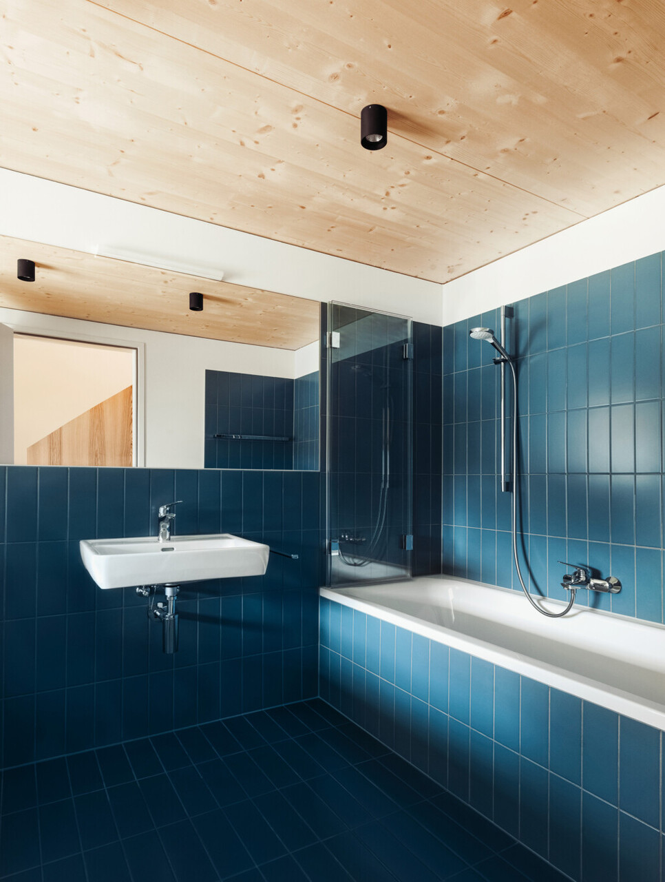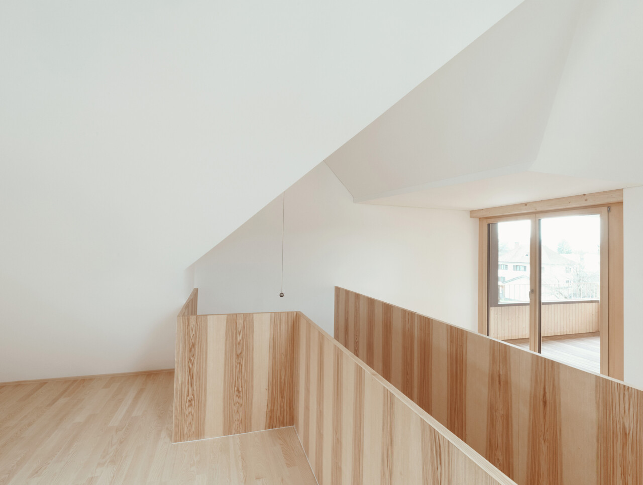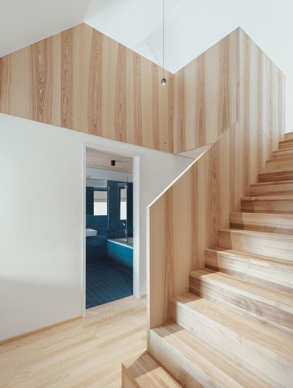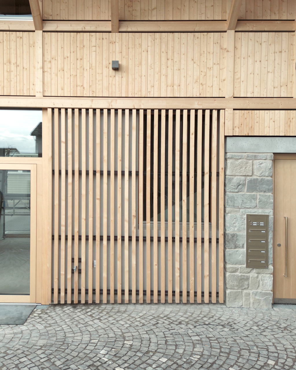 Das Gebäude besteht aus drei Wohneinheiten, davon zwei Maisonettes mit Loggien, und einer Gewerbeeinheit mit einem überhohen, durchgesteckten Eingangsbereich. Die Einheiten werden durch ein Sichtbetonstiegenhaus erschlossen. Der neu gestaltete Innenhof mit Pflasterung und Bepflanzung wertet das Gebäudeensemble zusätzlich auf. Hofseitig kann das Haus durch das wiedererrichtete Sandsteinmauerwerk betreten werden. (Text: Architekt:innen, bearbeitet)