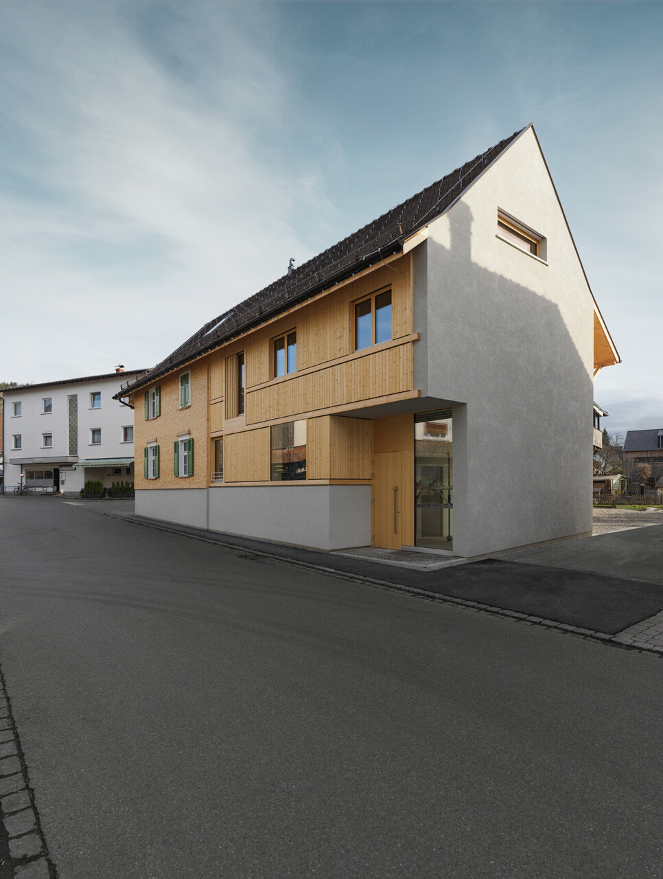 Der bauliche Auftakt dieses Vorhabens war die Sanierung des stark in die Jahre gekommenen sogenannten „Kolibri“-Stadels. In den Obergeschossen des markanten Eckhauses an der Kellhofstraße/Kreuzstraße sollten Wohnnutzungen entstehen, im Erdgeschoss hingegen war es wichtig, einen Beitrag zur gewerblichen Stärkung des Ortskerns zu leisten. Dass das Gebäude direkt mit einem bewohnten Bestandshaus verbunden ist und ein Teil der Erdgeschossfläche während der gesamten Umbauphase aktiv genutzt werden musste, war eine besondere Herausforderung der ersten Bauphase. Anschließend wurde der Mitteltrakt saniert und die dort bestehende Eisdiele wurde wiedereröffnet. Die Sanierung der Gewerbeeinheit des Hauptgebäudes Kreuzstraße 7 folgt als nächster Schritt, Hand in Hand mit der Neugestaltung des Straßenzugs durch die Gemeinde.