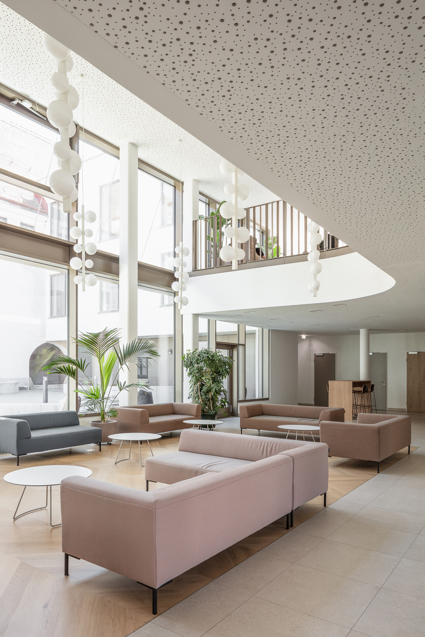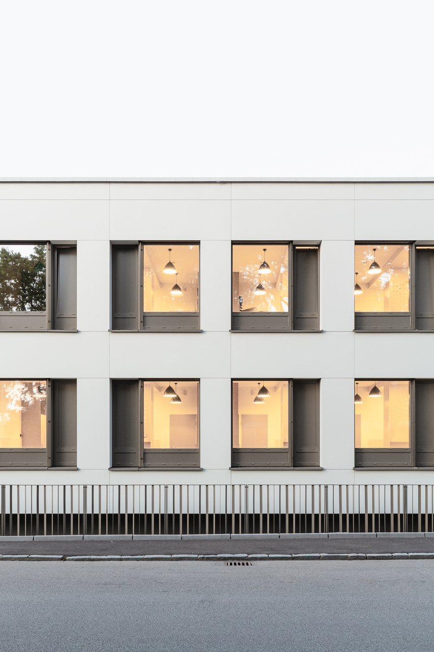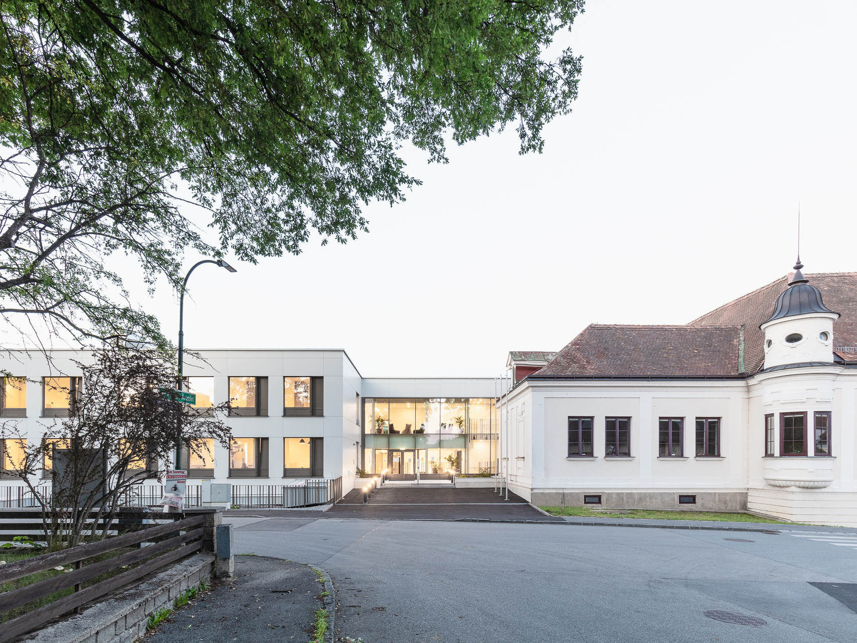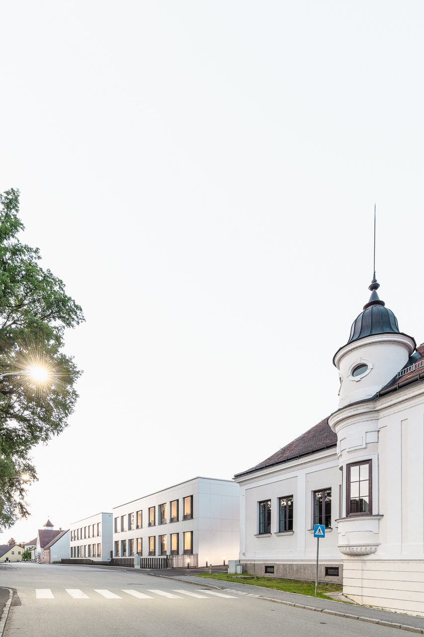 Im Ensemble mit dem Neubau formt sich ein kleiner Vorplatz zum straßenseitigen Haupteingang und vermittelt so zwischen Alt und Neu. Text: Architekt:innen bearbeitet
