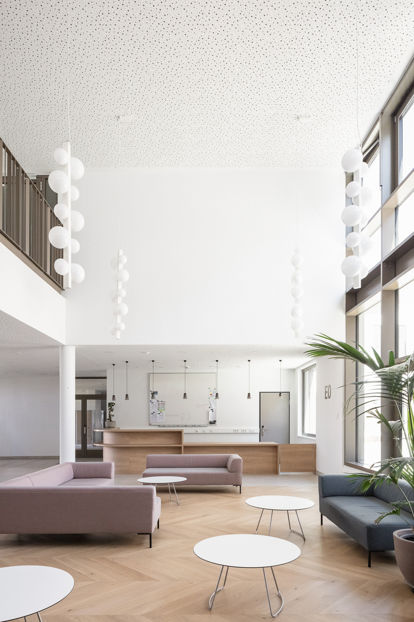Der Neubau wird von zwei Haupteingängen aus erschlossen: Einen an der Budweiser Straße im ersten Obergeschoss, der über einen Luftraum mit dem im Erdgeschoss befindlichen zweiten Eingang verbunden ist. Abgeleitet wird dies aus der topographischen Gegebenheit und aus der Logistik der Schulorganisation, da die meisten Schüler:innen zu Wochenbeginn mit einem PKW ankommen. Sie gelangen über einen offenen Innenhof zum Haupteingang im Erdgeschoss, der als zentrales Element im Erschließungssystem fungiert. Das ist der zentrale Treffpunkt der an den Speisesaal und direkt das Schüler:innenheim anschließt. Von hier gelangt man über ein Rampensystem zu den vielen Ebenen des Schlosses. So kann mit einem Aufzug eine lückenlose Barrierefreiheit im gesamten Gebäudekomplex geschaffen werden.