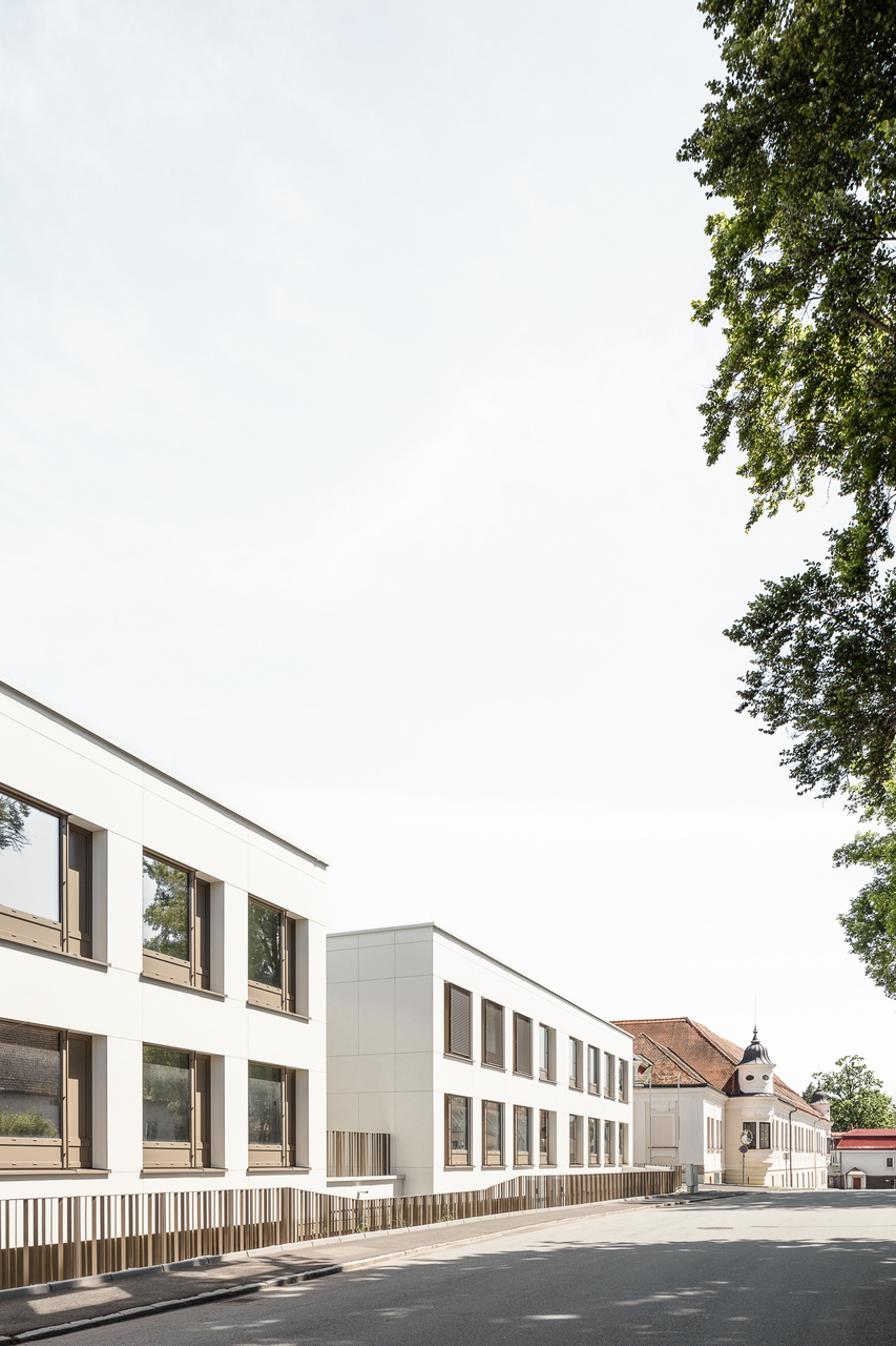 Die Höhenentwicklung geht von einem zweigeschossigen zentralen Bau in den dreigeschossigen Schülerheimtrakt über. Mit dem Neubau und dem Bestand werden Sequenzen von Innenhöfen geschaffen, die sich bis in den historischen Schlosshof hin fortsetzen.