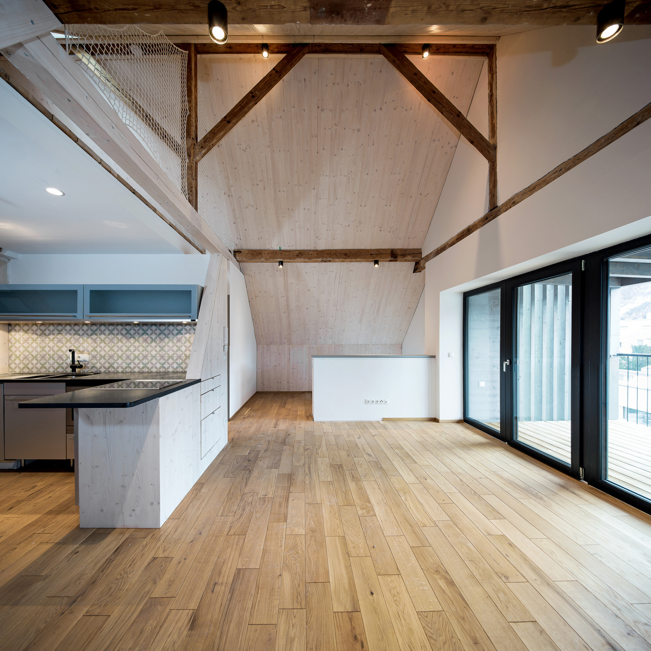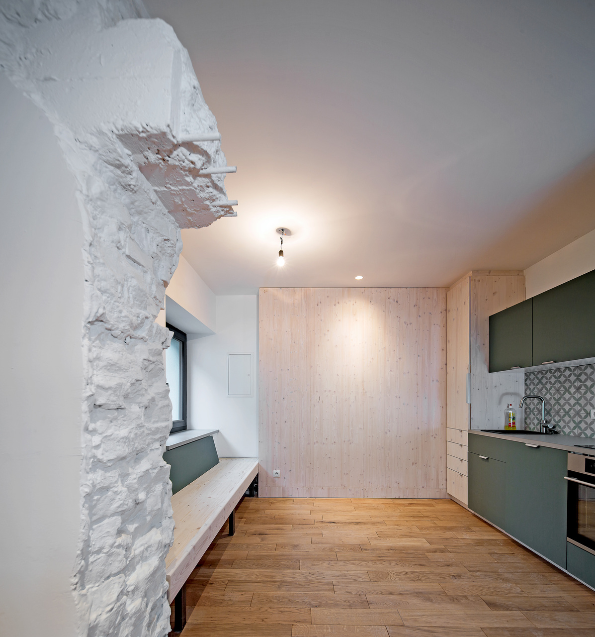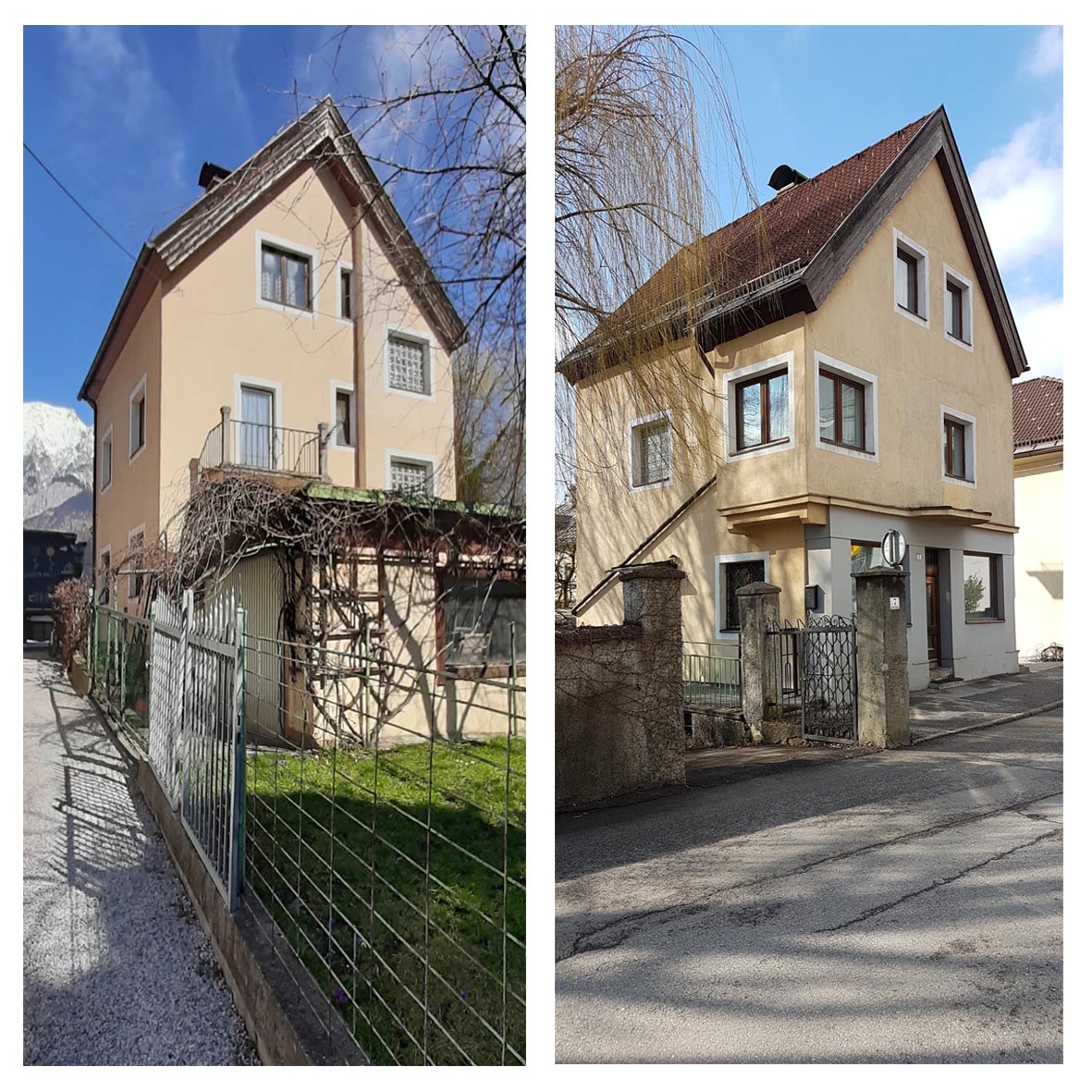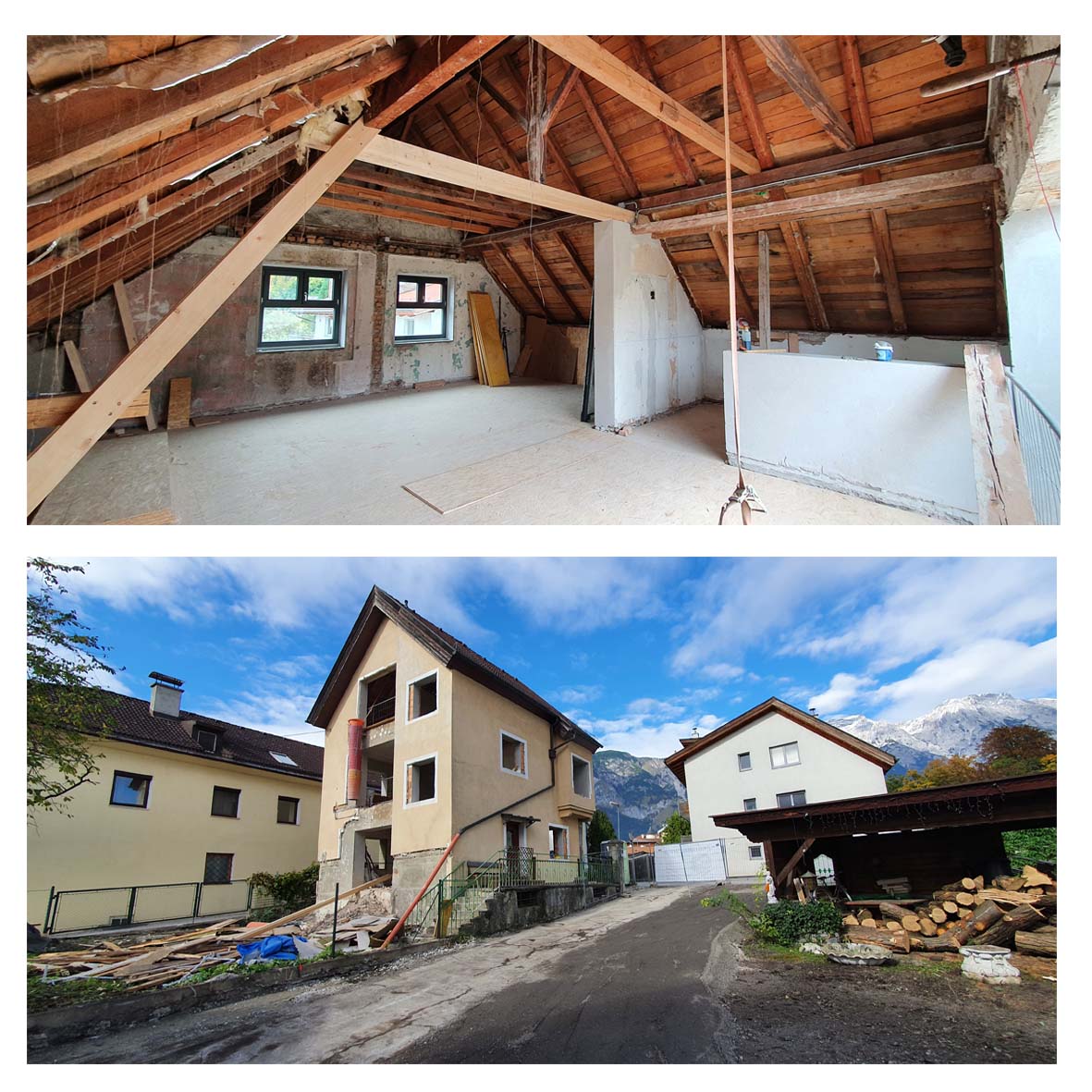 Nach einem Eigentümerwechsel wurden im Jahr 2020 gemeinsam mit den Nachbarn und dem Stadtbauamt Hall die Grundlagen für eine Generalsanierung und den Umbau in ein 3-Parteien-Mietshaus geschaffen. Zentrale Idee war es, die Südseite radikal zu öffnen und die Wohnungen mit großzügigen Loggien in Richtung der ruhigen Privatgärten zu erweitern. Um möglichst flexible Wohngeschoße zu erhalten, wurde der große zentrale Kamin samt Wand in der Hausmitte abgebrochen, was aufgrund der Bauweise in der Zwischenkriegszeit mit Ziegelwänden und Holztramdecken auch leicht möglich war.