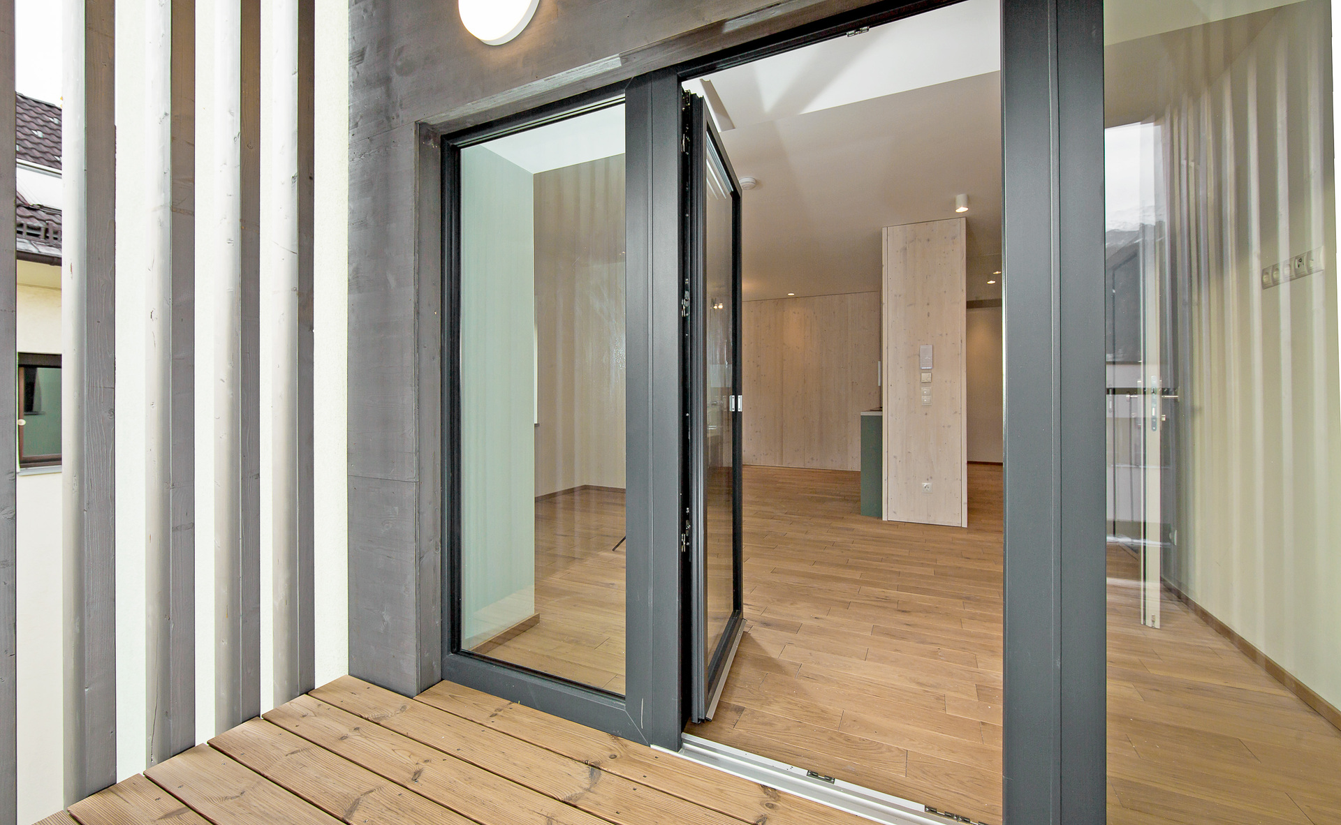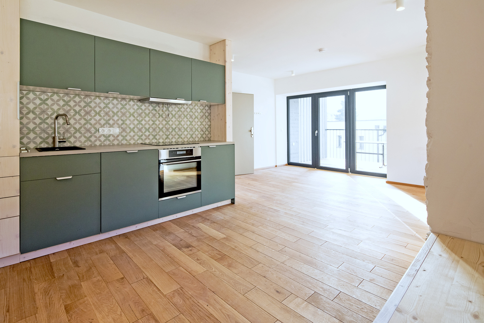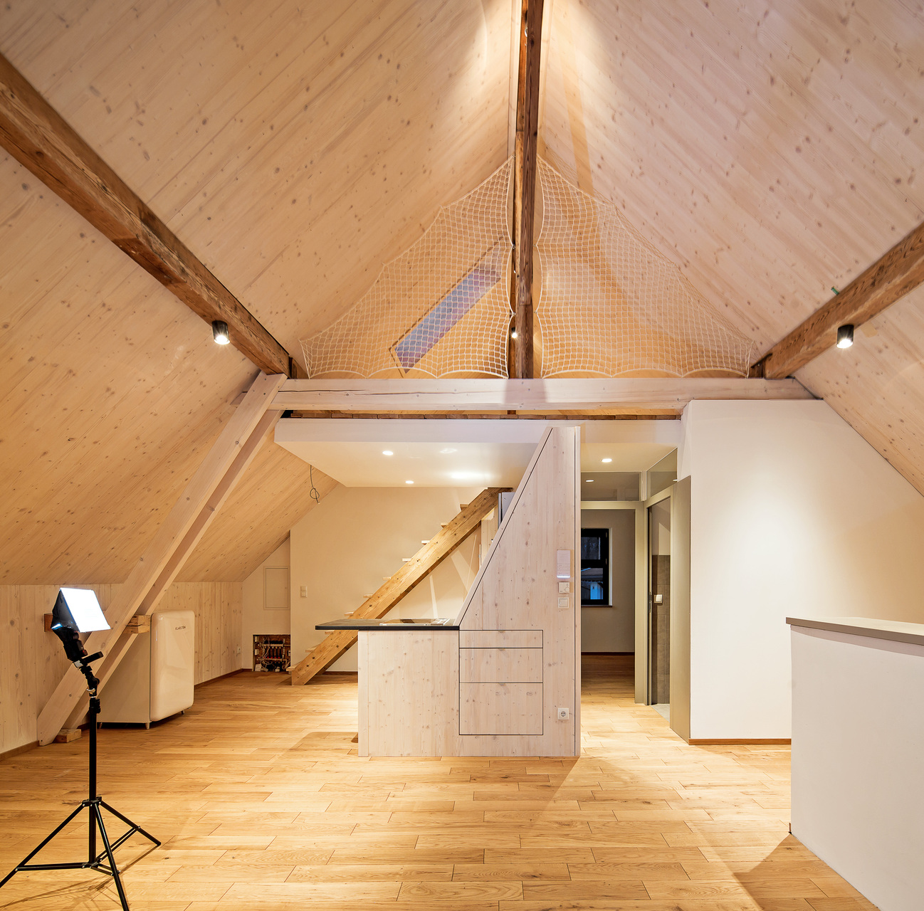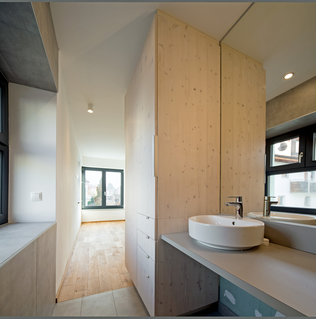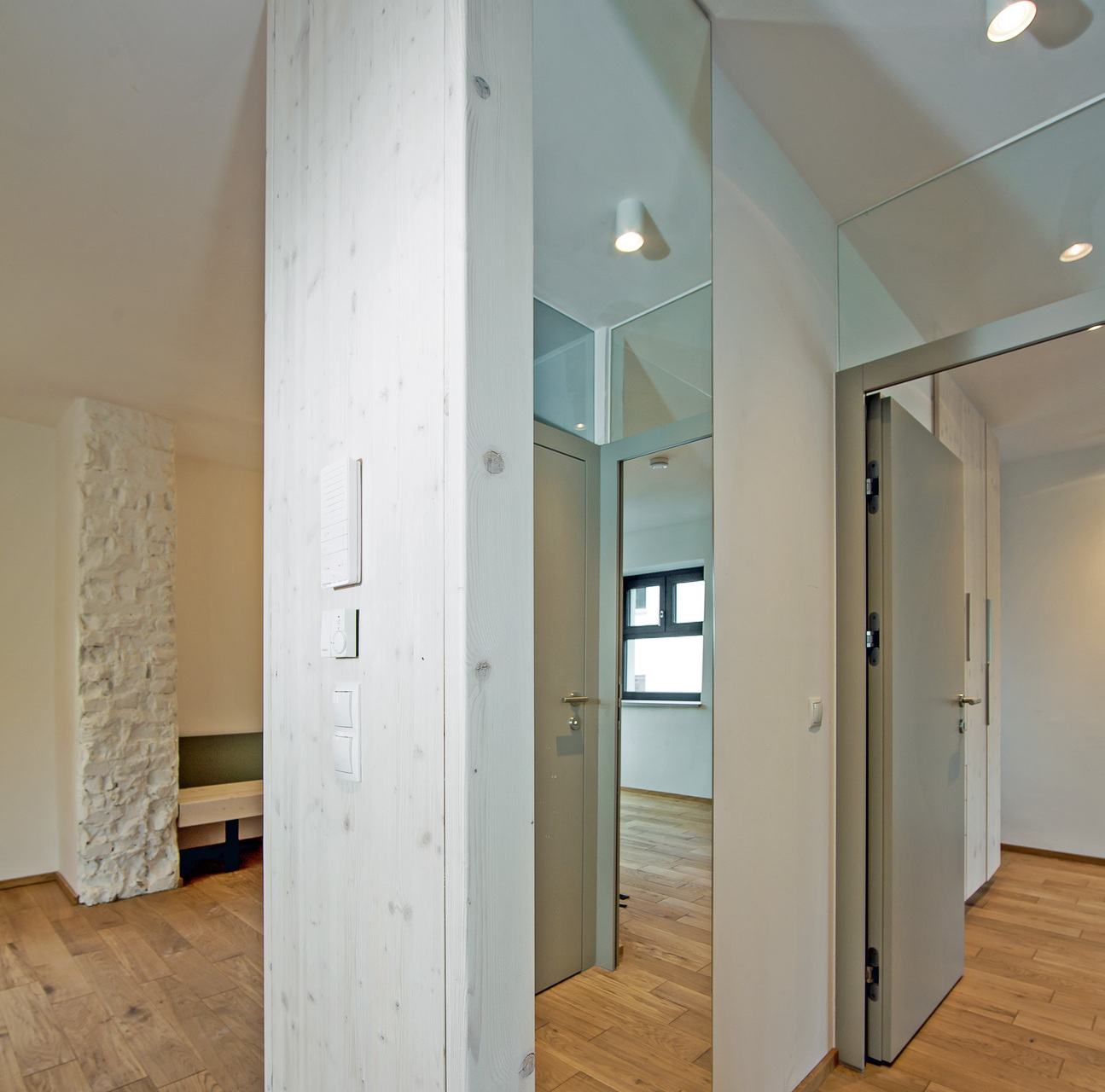 Alle drei, ca. 50 m² großen Wohnungen sind gleich konzipiert und bestehen aus einem rundum belichteten Wohnraum mit nur einem kleinen Wandelement zum Nassraum, in dem sich auch der Versorgungsschacht befindet. Gegliedert wird der Raum durch Möbeleinbauten, die jederzeit demontiert werden können. Im Norden liegen das Bad und Schlafzimmer, im Süden der großzügige Wohnbereich, der durch die über eine neue Wandöffnung zugängliche Loggia erweitert wird. Eine zentrale Küchenzeile trennt den Essbereich von der Garderobe mit WC und dem Eingang. Alle drei Wohnungen verfügen über ein Extra: die Erdgeschoßwohnung erhielt den kleinen Außenbereich im Süd-Osten als Garten, jene im Obergeschoß einen Erker und die Dachwohnung eine Galerie. Im gut belichteten, etwas aus dem Gelände hervortretenden Keller wurden Kellerabteile, ein Fahrrad- und Sportgeräteraum sowie der Technikraum untergebracht. (Text: Claudia Wedekind, nach einem Text des Architekten)