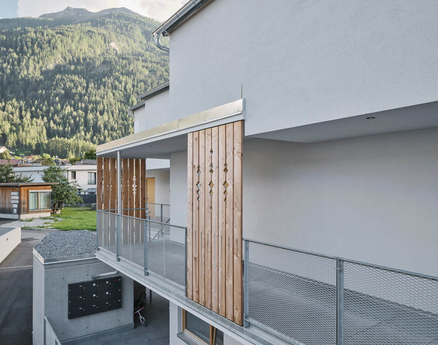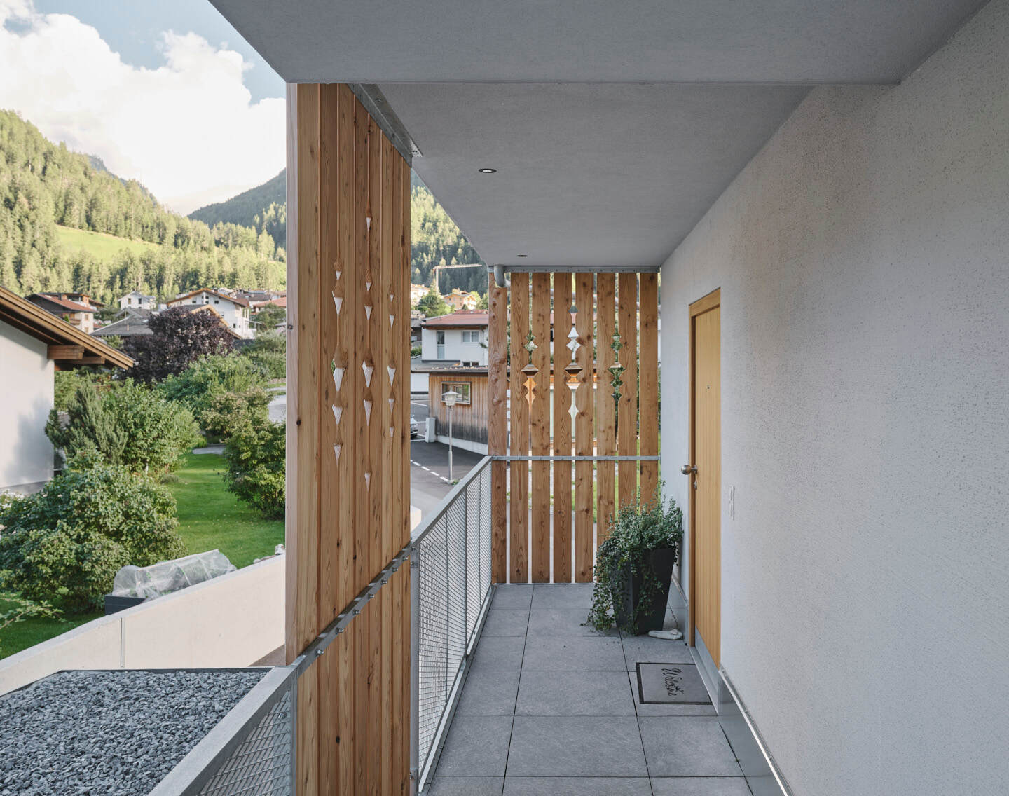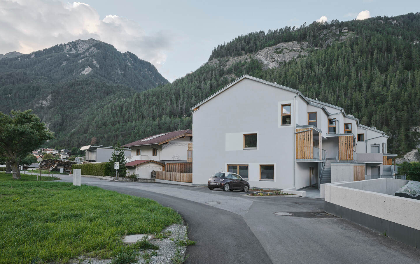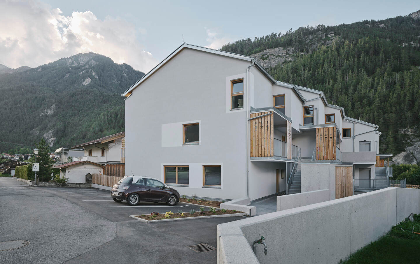 Ausgeführt wurde die Wohnanlage in einfachen und hochwertigen Materialien – Tiefgarage und Allgemeinbereiche in Sichtbeton, der eigentliche Wohnbau in strukturiert verputztem Dämmziegelmauerwerk. Durch das Satteldach und die mit schlichten Ornamenten versehenen Lärchenholzelemente fügt sich der Neubau wie selbstverständlich in die gebaute Dorflandschaft ein.
