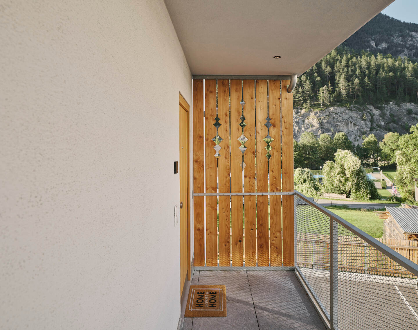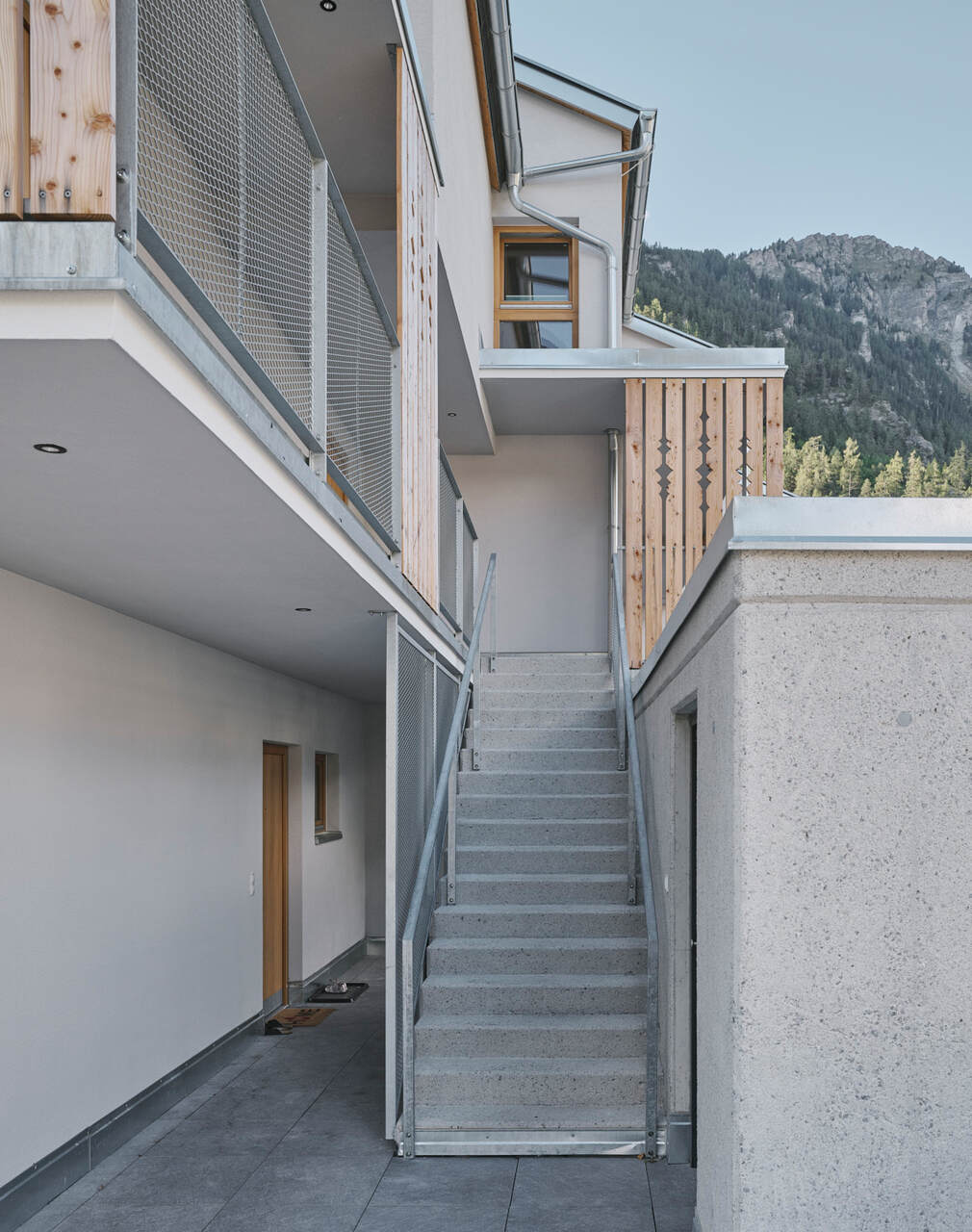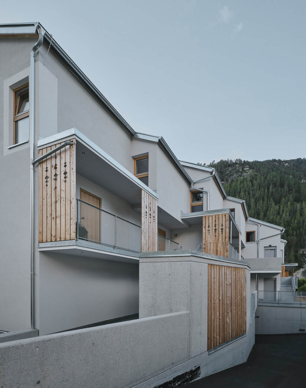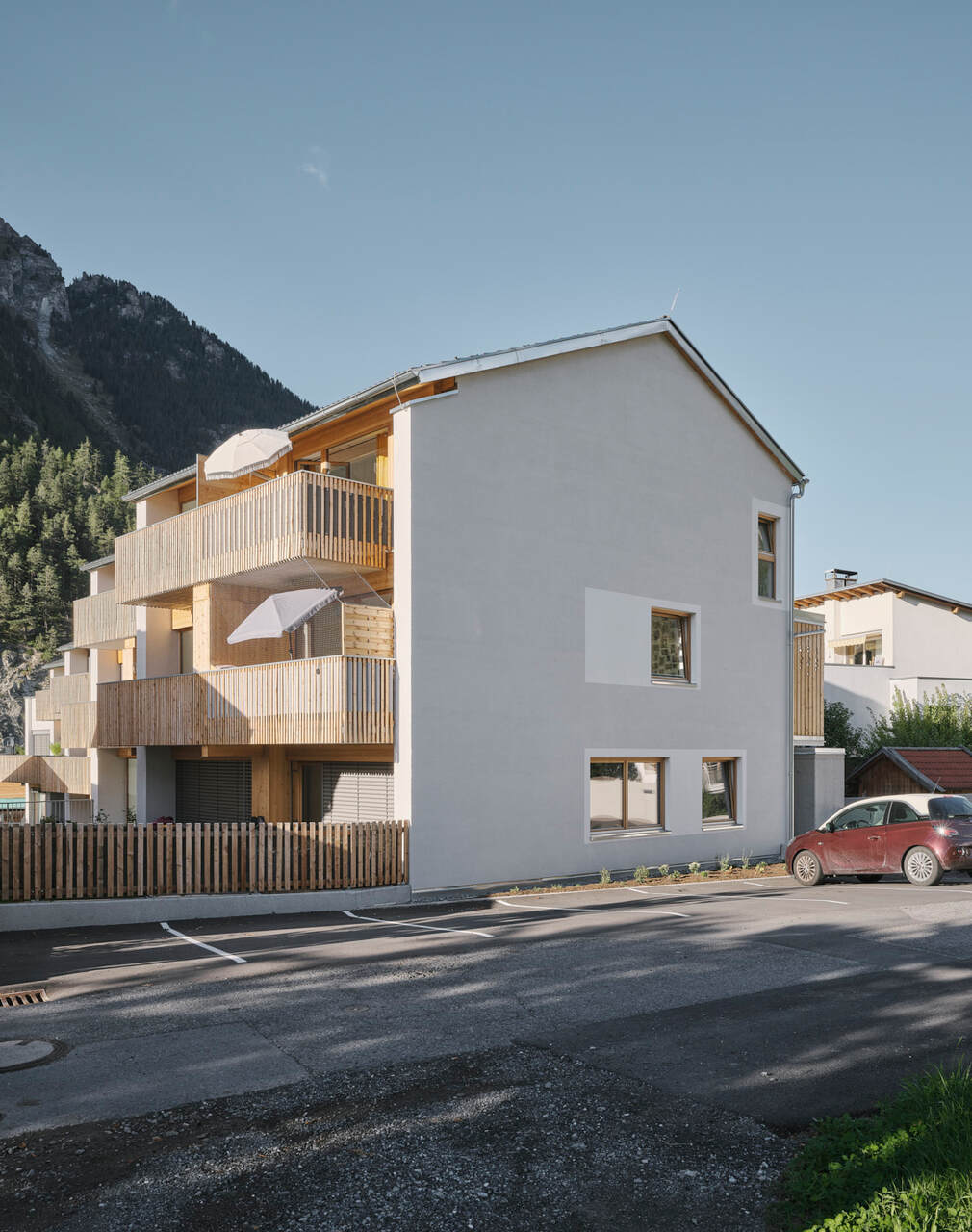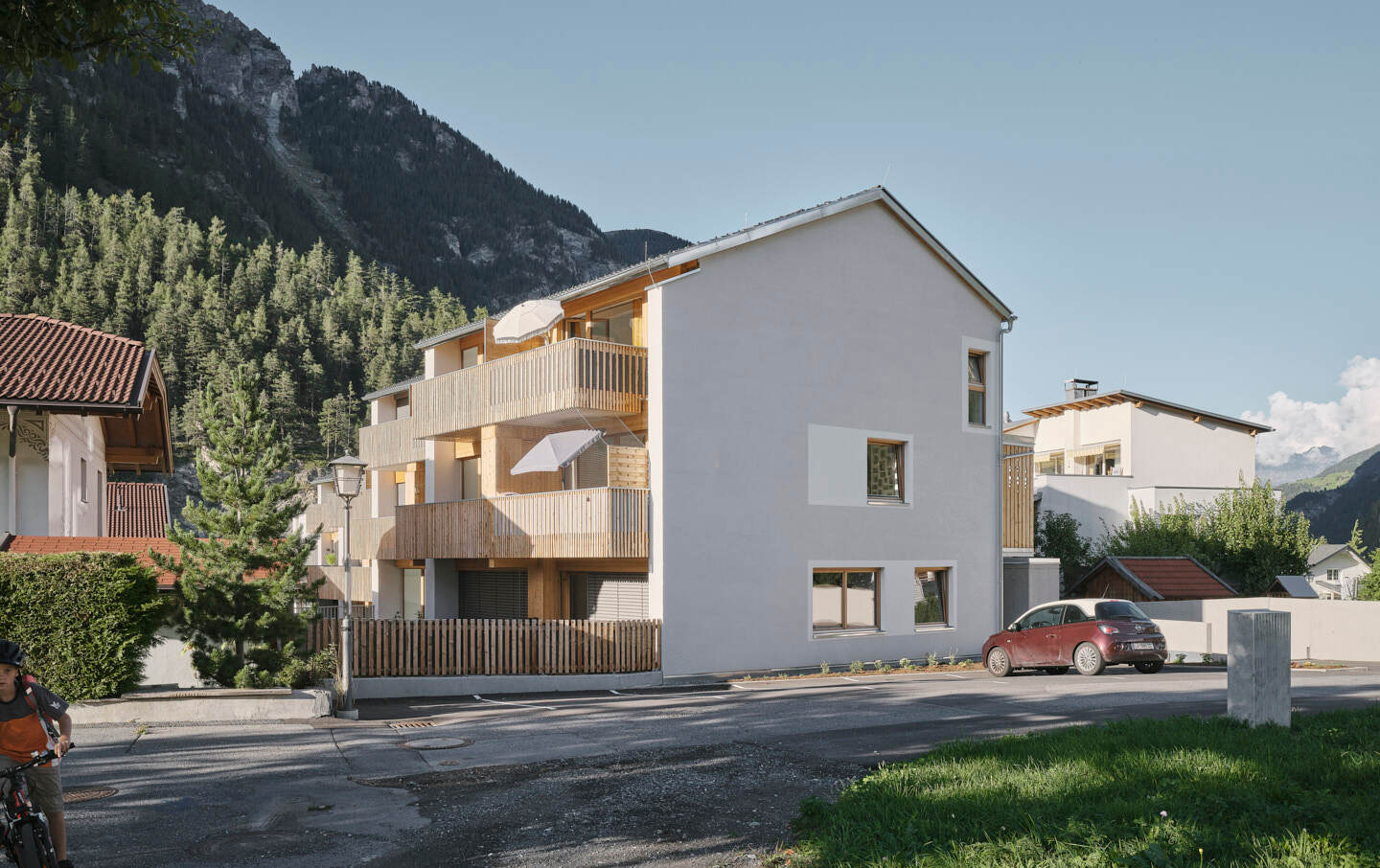 Ausgeführt wurde die Wohnanlage in einfachen und hochwertigen Materialien – Tiefgarage und Allgemeinbereiche in Sichtbeton, der eigentliche Wohnbau in strukturiert verputztem Dämmziegelmauerwerk. Durch das Satteldach und die mit schlichten Ornamenten versehenen Lärchenholzelemente fügt sich der Neubau wie selbstverständlich in die gebaute Dorflandschaft ein.