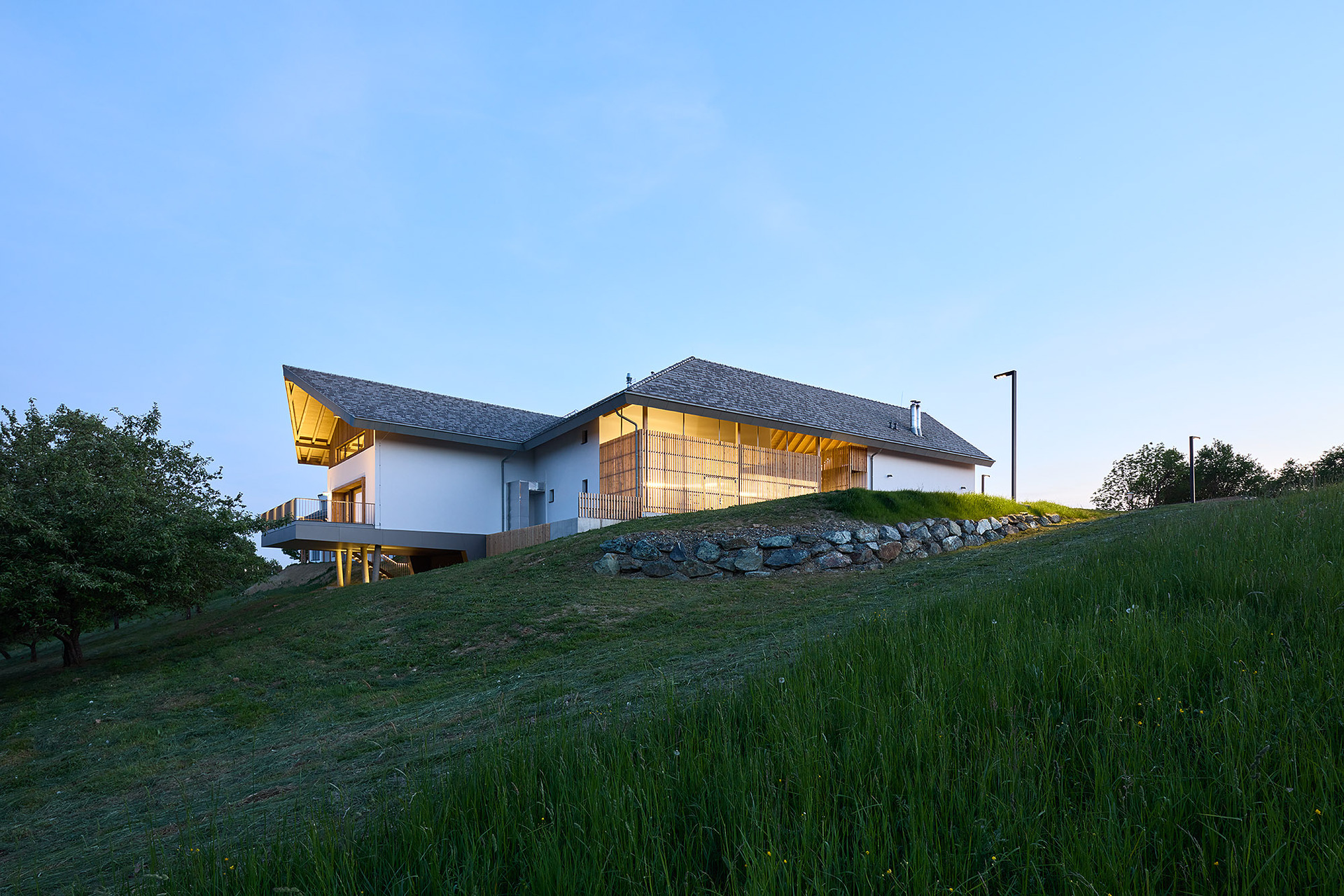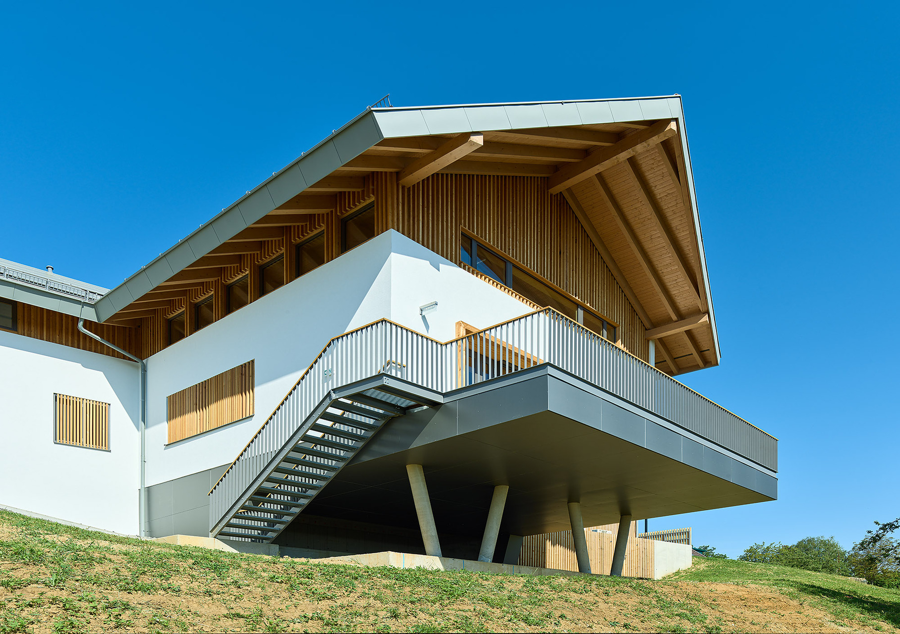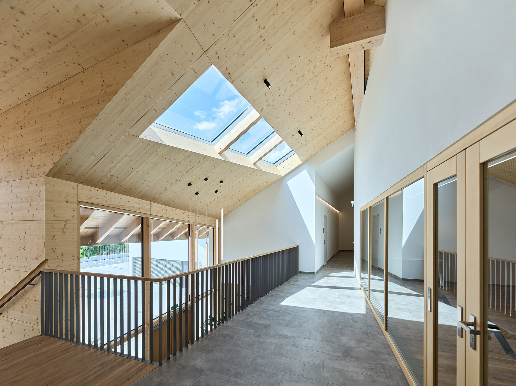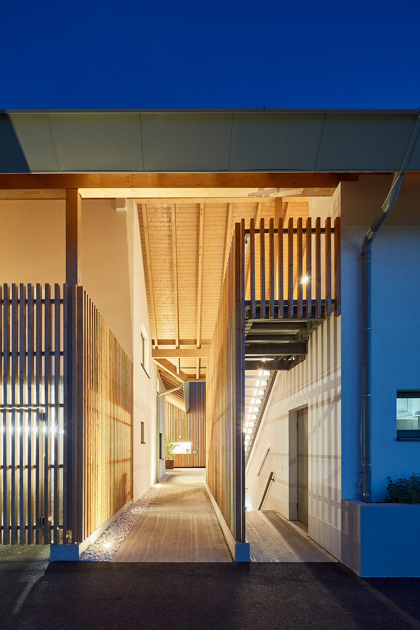 Der Gebäudekomplex wurde in Holzriegel- und Ziegelbauweise errichtet. Die im konstruktiven Holzbau errichteten Bauteile werden außen durch die mit senkrechten Lärchenhölzern hergestellte Fassade erkennbar. Für die Verschattung wurden eigens faltbare Holzlamellenelemente entwickelt. (Text: Nikolaus Gartner)