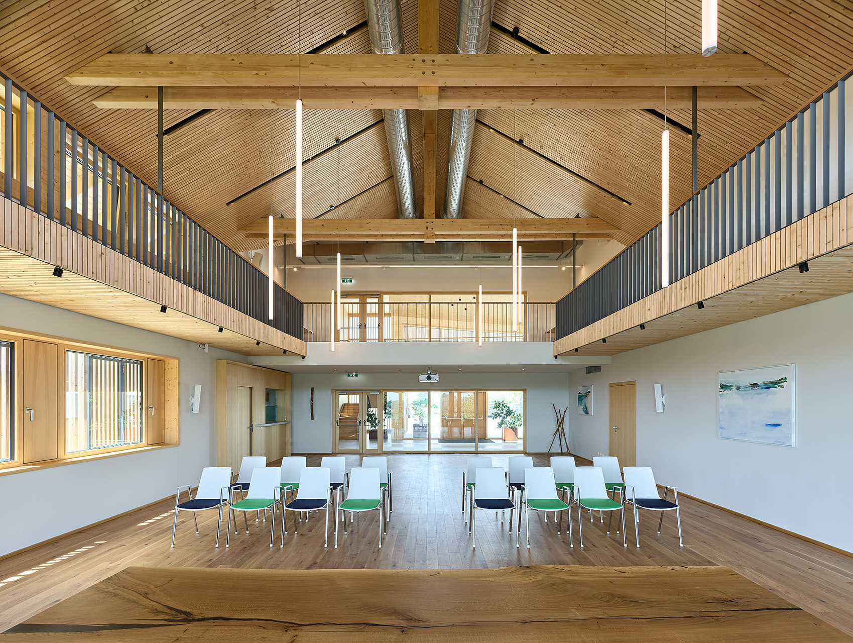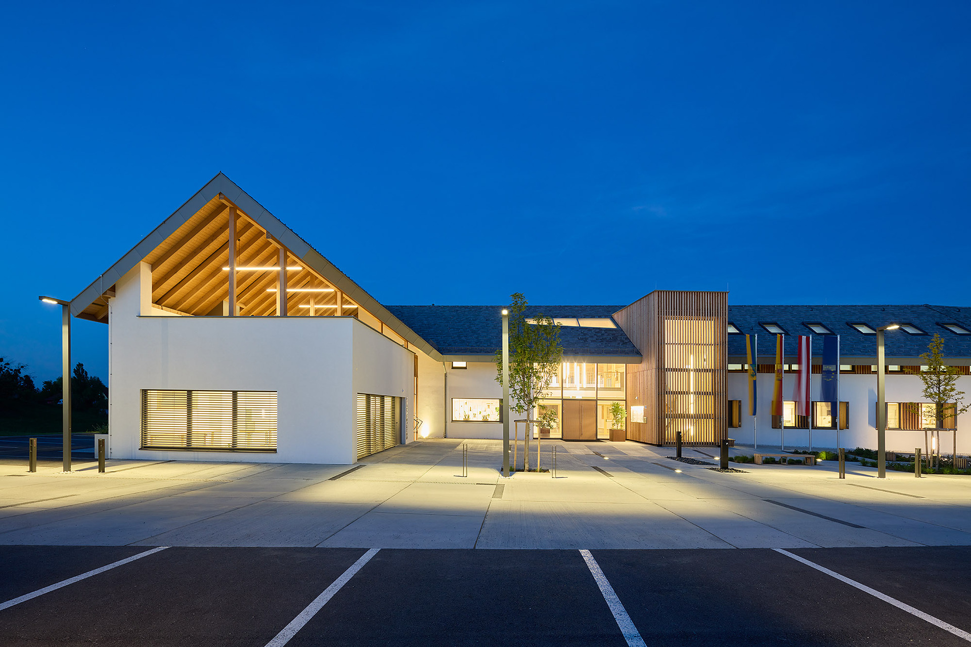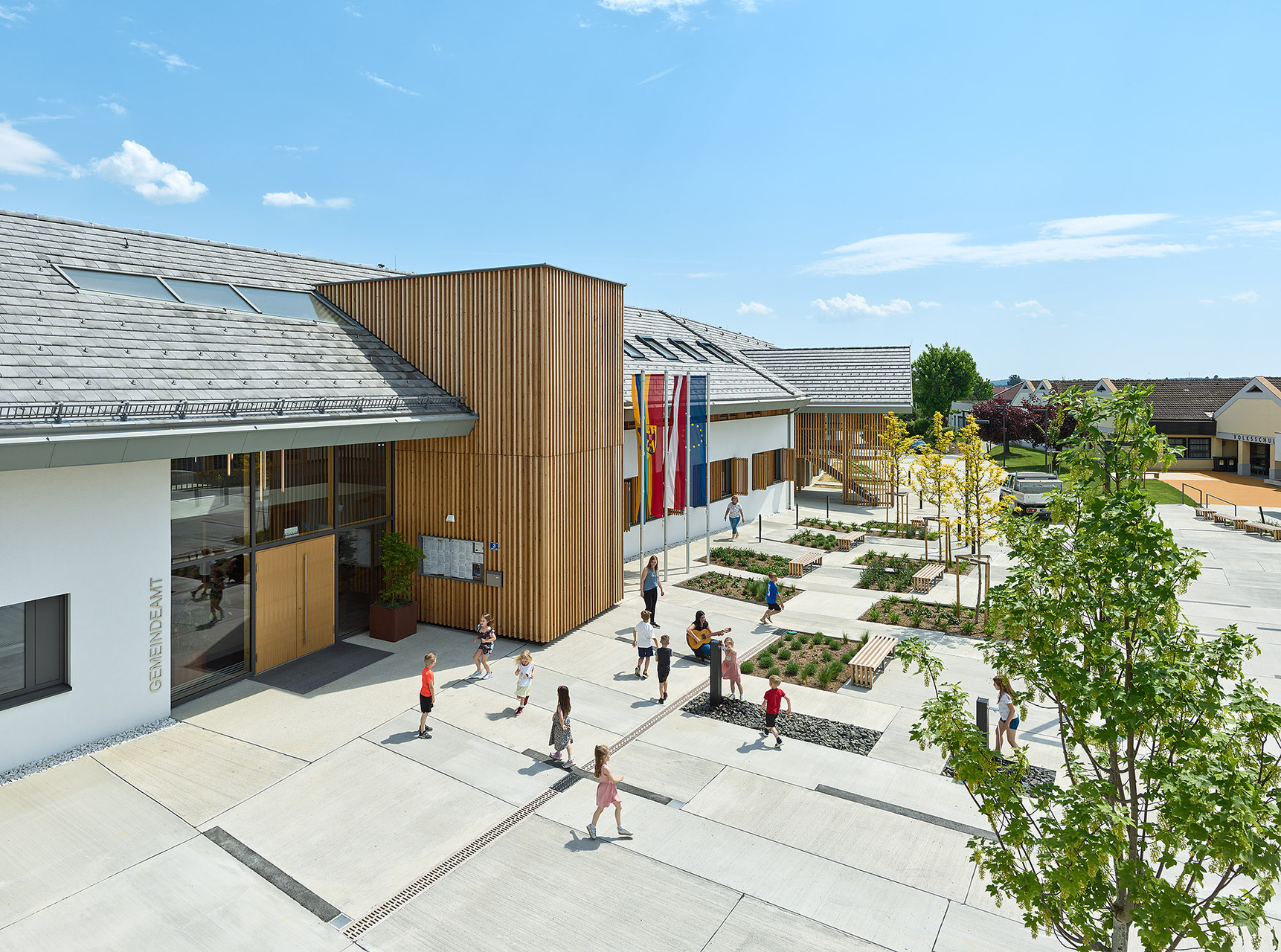 Wie gestaltet man ein Ortszentrum in einer Streusiedlung? Diese Frage beantwortete die Gemeinde Burgauberg-Neudauberg mit der Errichtung eines multifunktionalen Gebäude-Komplexes - ähnlich eines Gehöfts –, das unterschiedliche Nutzungen und Nutzer:innen an einem Ort zusammenbringt. Neben Gemeindeamt, Dorfsaal, Nahversorger und Co-Working-Space wurde ein Wohnbau unter dem alles umfassenden Dach integriert.Der Ort wurde nicht zufällig gewählt: Die bestehende Schule und der Kindergarten, 1981 von Architekt Herwig Udo Graf errichtet und zuvor auch als Gemeindeamt genutzt, wird in Beziehung zu jenem neuen Gehöft gesetzt. Der Zwischenraum zwischen diesen beiden Gebäude-Komplexen wird zum neuen Dorfplatz und die Dorfstraße zur Begegnungszone. Dieser generationenübergreifende Treff- und Anziehungspunkt unterschiedlicher Nutzer:innengruppen wird um den Wohnbau bereichert, der es ermöglicht, im neuen Ortskern zu leben und zu Fuß zur Schule, zum Kindergarten, zum Gemeindeamt, zum „Bergler-Laden“ oder in die Arbeit zu gehen. Mit differenziert ausgestalteten Freibereichen und Terrassenzonen werden unterschiedliche Aufenthaltsorte angeboten. Mit dem Ziel, ein generationenübergreifendes Wohnen im Zentrum zu ermöglichen, wurden mit einer Familienwohnung für bis zu 5 Personen, Zwei-Zimmer-Wohnungen sowie altersgerechten Singlewohnungen insgesamt 8 Wohneinheiten errichtet.