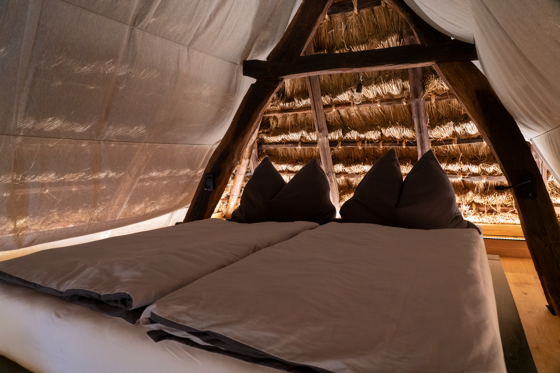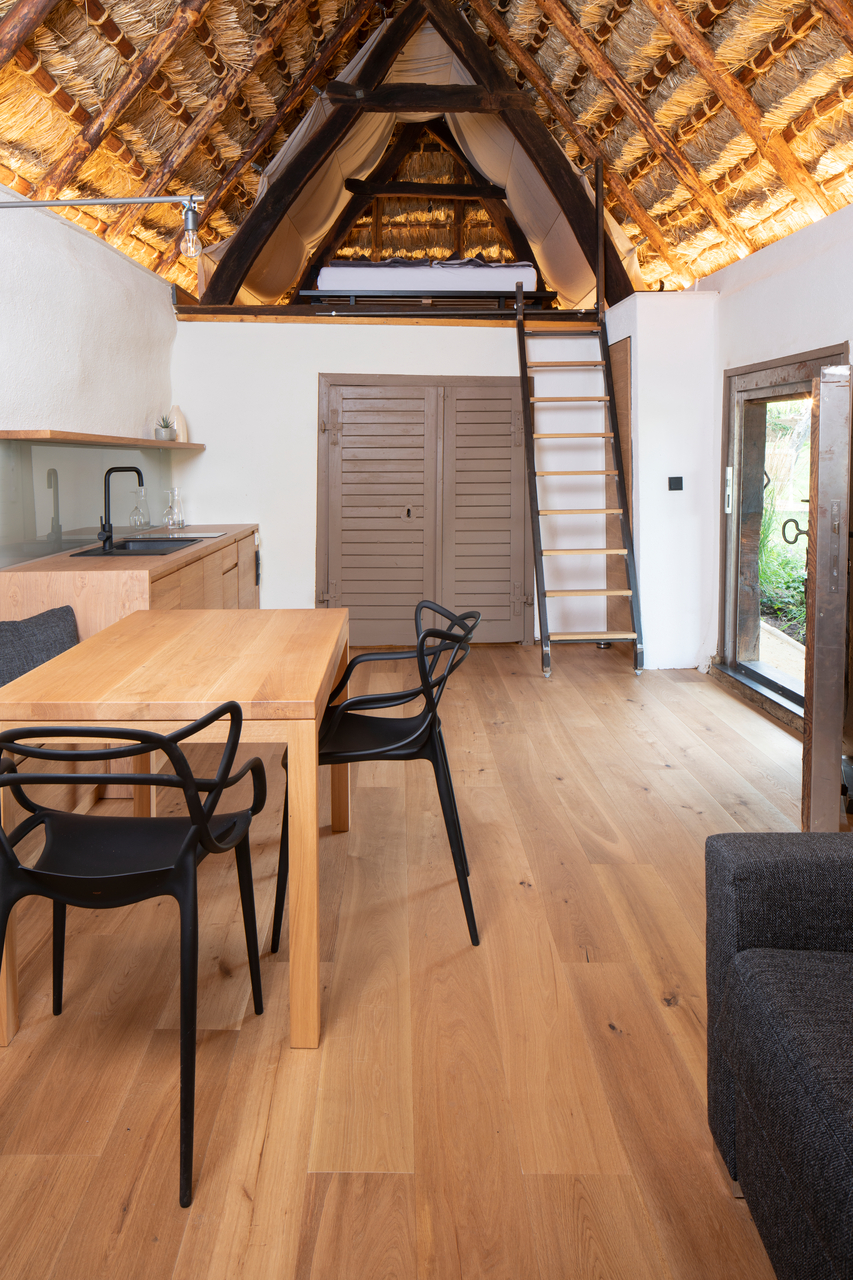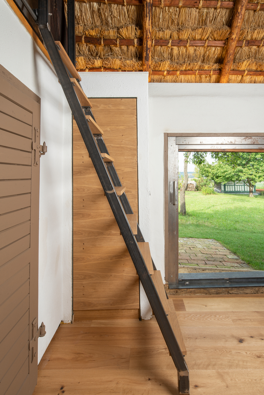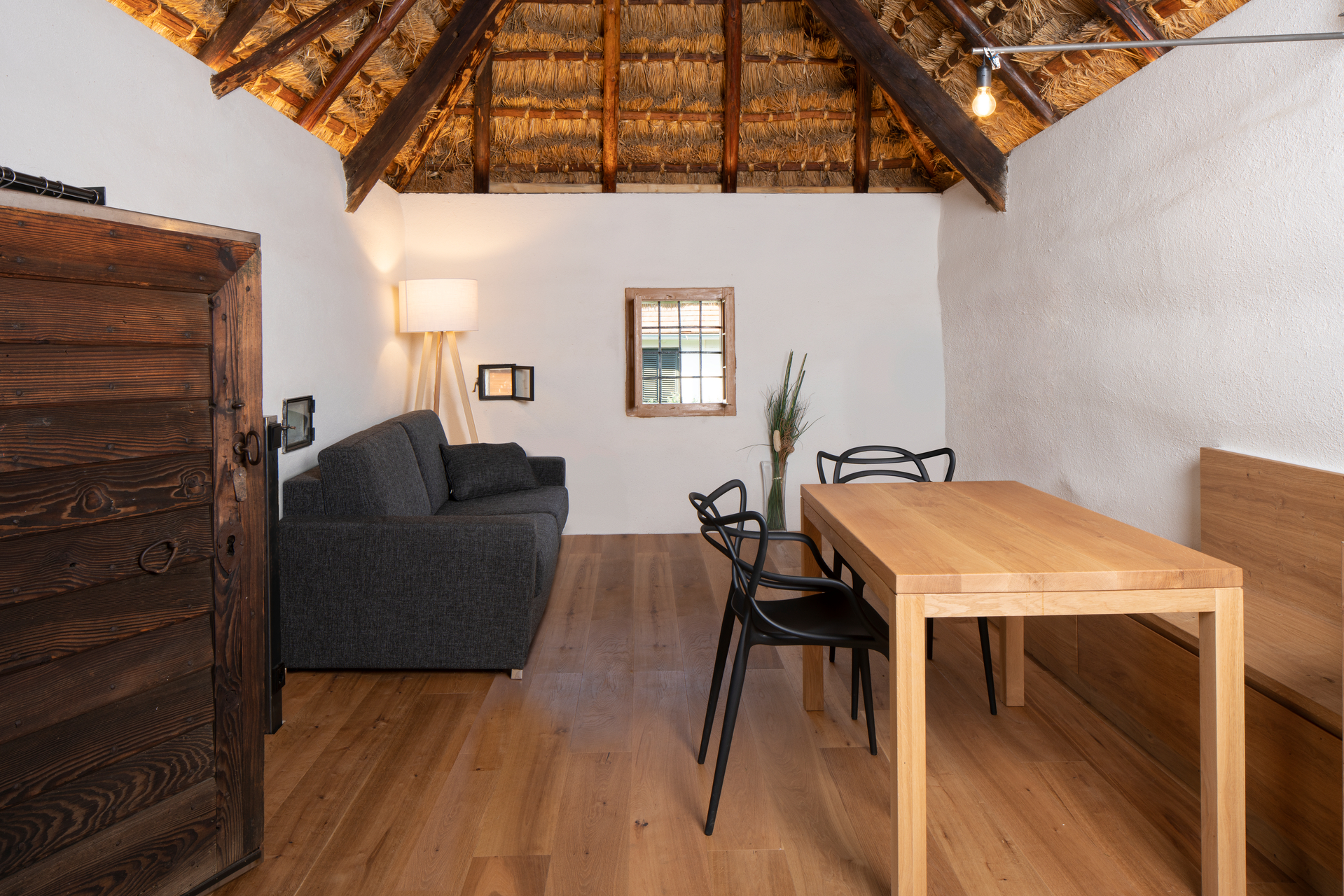 Das Blockhaus besteht aus einem Hauptgeschoss und ist mit einem strohgedeckten Walmdach ausgeführt. Der Grundriss gliedert sich in zwei Räume: Haupt- und Nebenraum sind durch eine Zwischenwand samt Doppelflügeltür geteilt, die jeweils erhalten und saniert werden. Für die touristische Nutzung soll der Hauptraum als Wohnküche mit Schlafgelegenheit genutzt werden. Der Nebenraum wird in ein Duschbad mit WC sowie eine Schlafnische unterteilt und über einen kleinen Vorraum erschlossen. Das Duschbad ist dabei als Raum-in-Raum-Konstruktion aus z.T. blickdichten Nurglaswänden geplant. Die Dachbodenebene/Galerie oberhalb des Nebenraums ist über eine verschiebbare Leiter zugänglich. Alle geplanten Maßnahmen am Bestandsgebäude wurden im Vorfeld mit dem Bundesdenkmalamt abgestimmt.