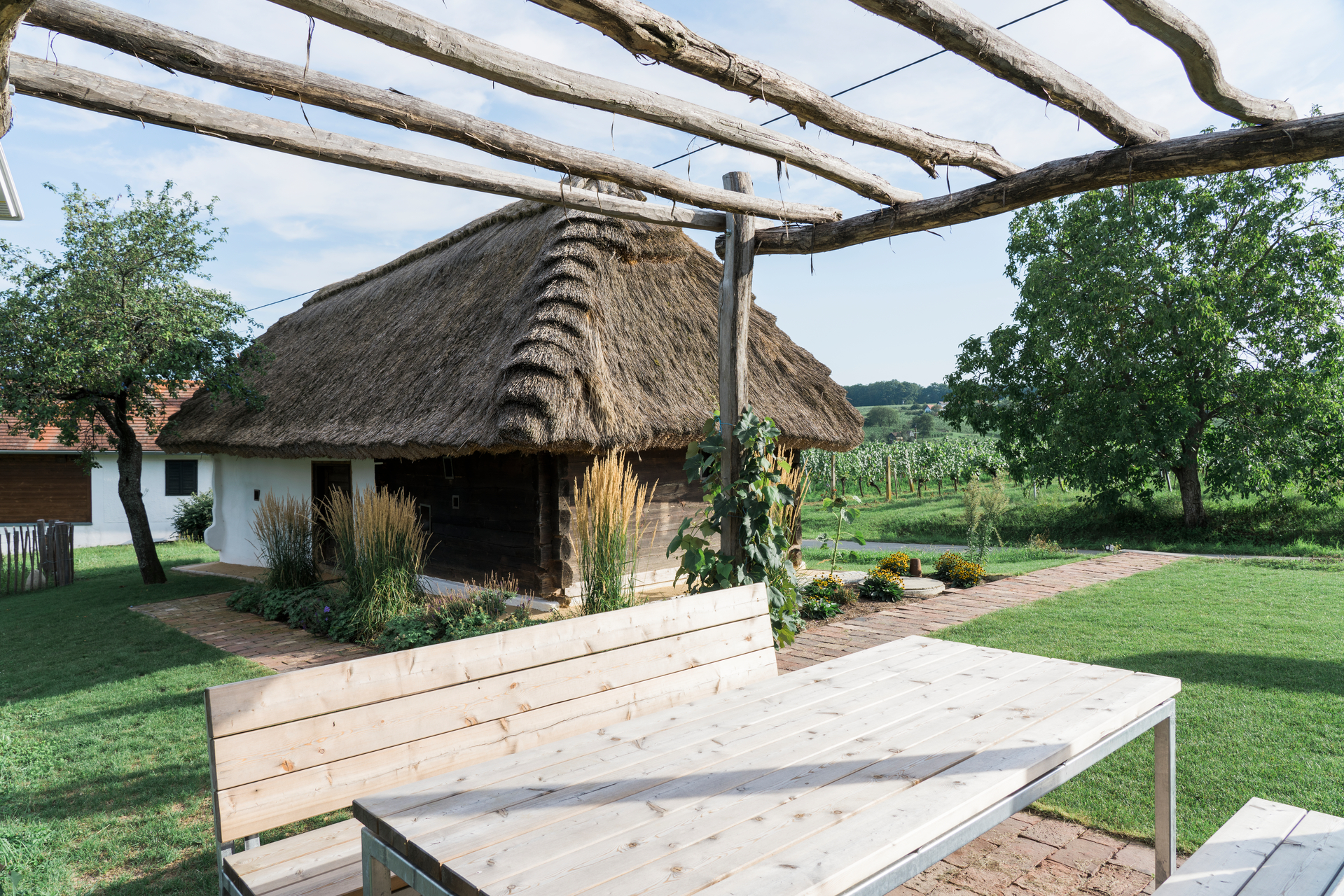 Im Außenbereich/Garten wird eine Laube ergänzt, die mit Weinreben bewachsen wird. Diese Laube wurde gemäß den Landschaftschutz-Richtlinien für Weinkellergebäude als Holzrankgerüst aus Rundhölzern errichtet. Text: Architekten, bearbeitet