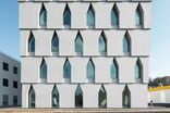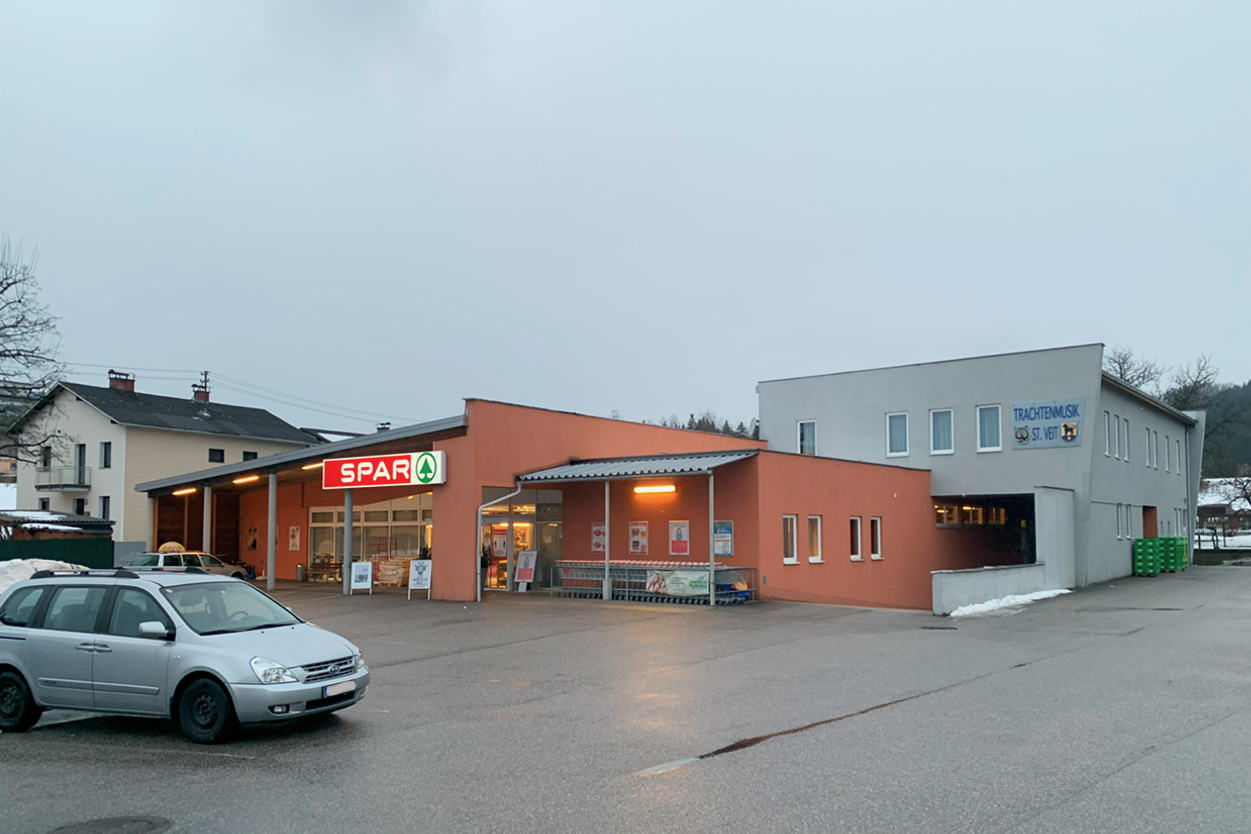 Mit der Überarbeitung des Bestands konnte die Verkaufsfläche erweitert werden, ein neuer Trakt mit Büro- und Aufenthaltsräumlichkeiten für die Mitarbeiter:innen wurde angebaut. Das Lager wurde vergrößert und der Anlieferungsbereich neu gestaltet. Durch das hinzugefügte, im Grundriss L-förmige Dach werden zugleich die Zulieferung im Norden und der Eingangsbereich im Osten überdacht. Die Form des Vordachs spiegelt sich im Bodenbelag wider. Kontrastierend zum umgebenden Asphalt verdeutlicht der helle Beton in Besenstrichoptik die Übergangszone zwischen innen und außen. Das Vordach wird durch seine außergewöhnliche, gekantete Form zum Erkennungsmerkmal des neuen Geschäftslokals.