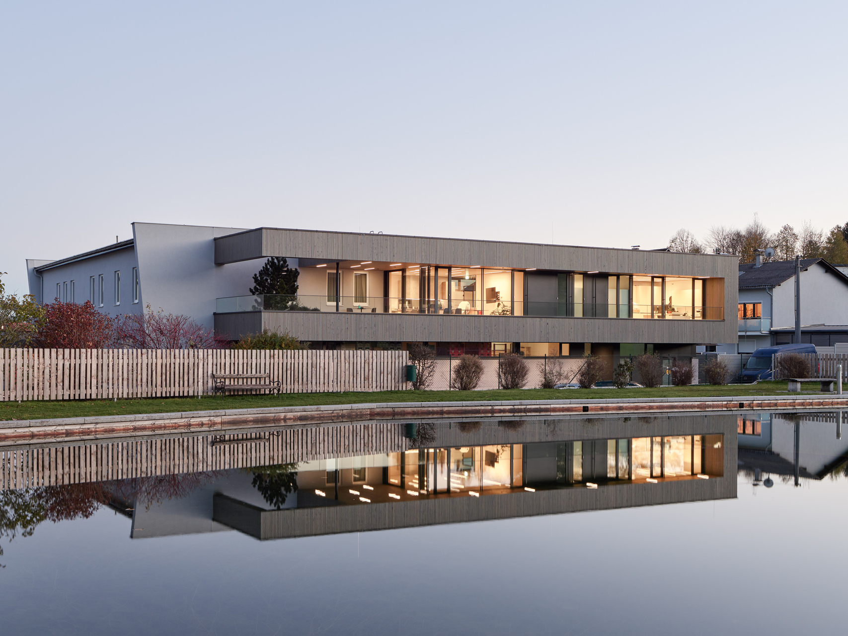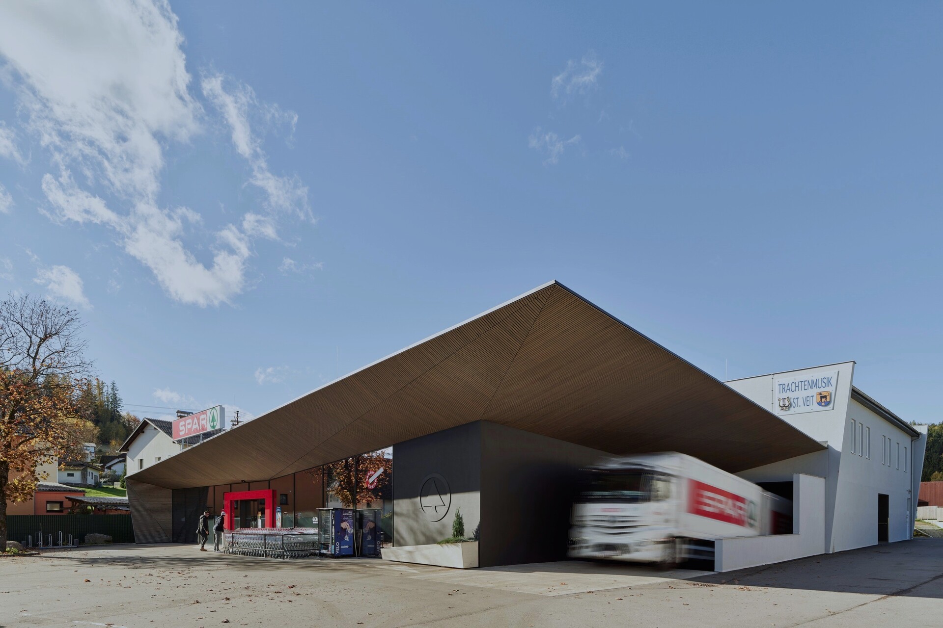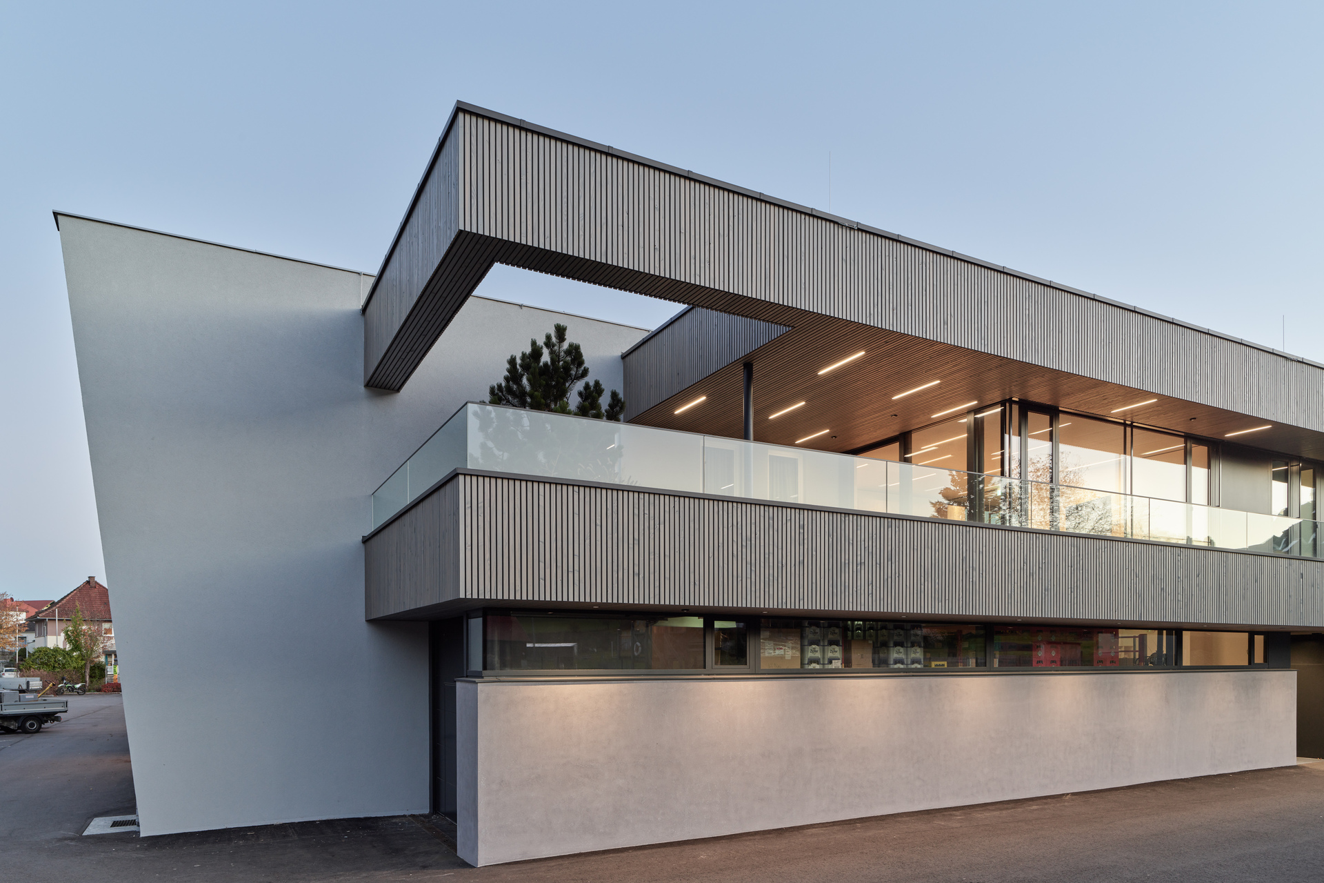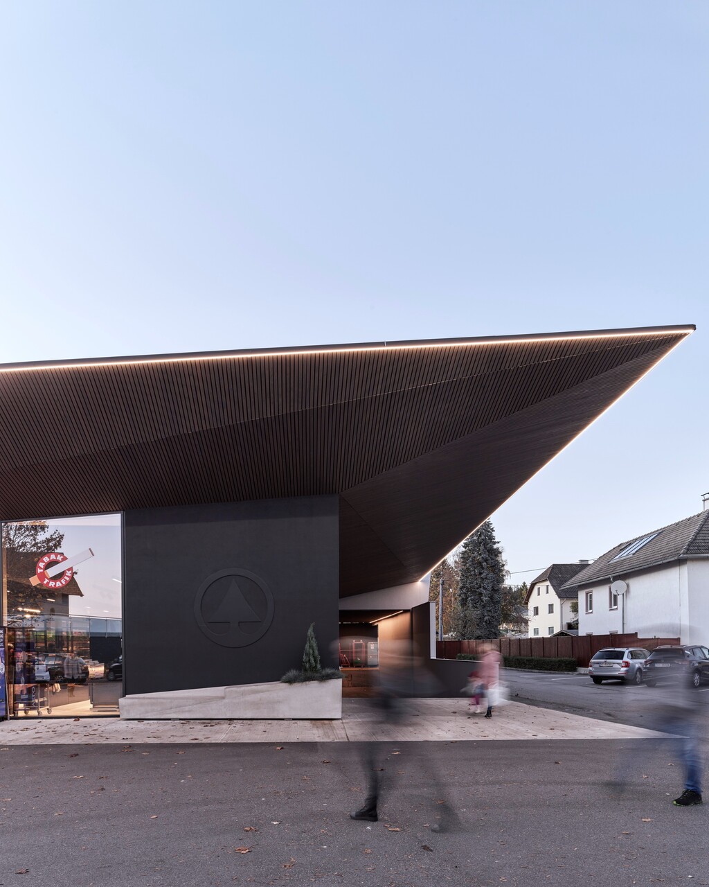 Die Dachkanten werden durch die gezielte Setzung von Fugen und die Betonung durch ein LED-Band besonders hervorgehoben. In den dunklen Wandputz neben der Glasfassade wurde das Logo der Handelsmarke eingearbeitet. Der Pflanzentrog darunter übernimmt die Konturen des Vordachs. Die Dachuntersicht und Teile der Außenwände wurden mit einem Schirm aus schlanken Holzlatten eingekleidet. (Text: Architekt:innen, bearbeitet)