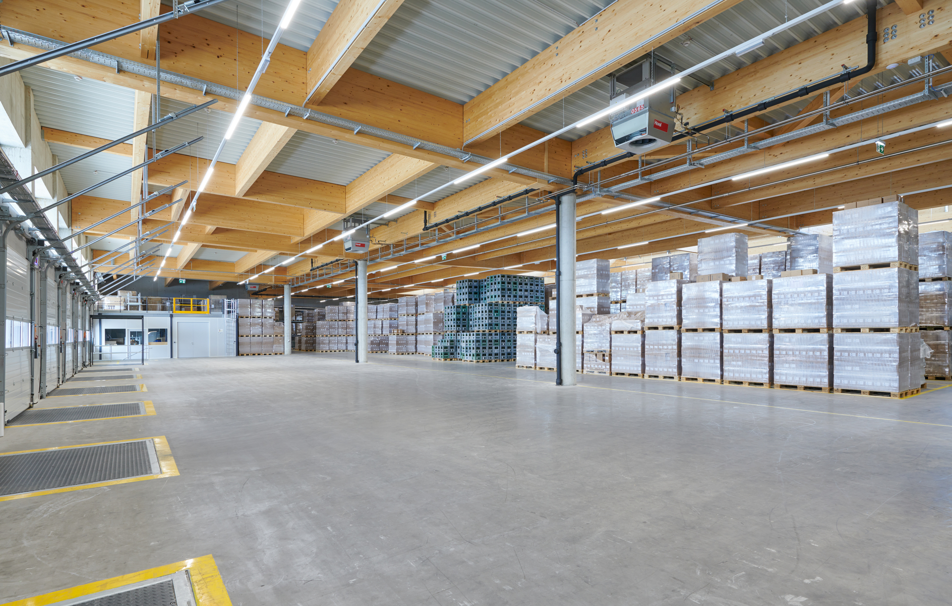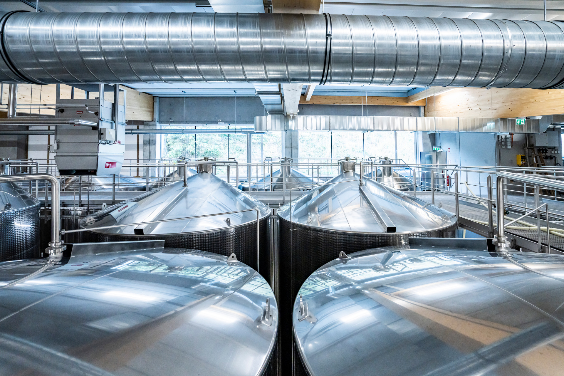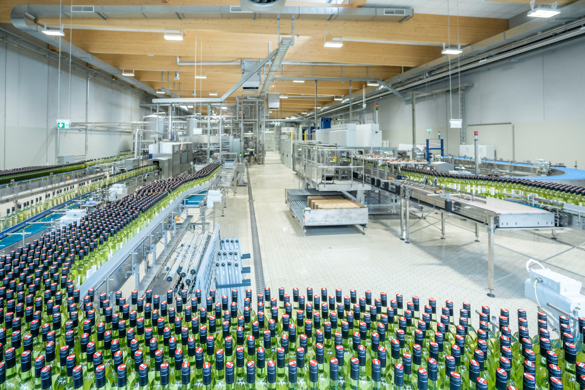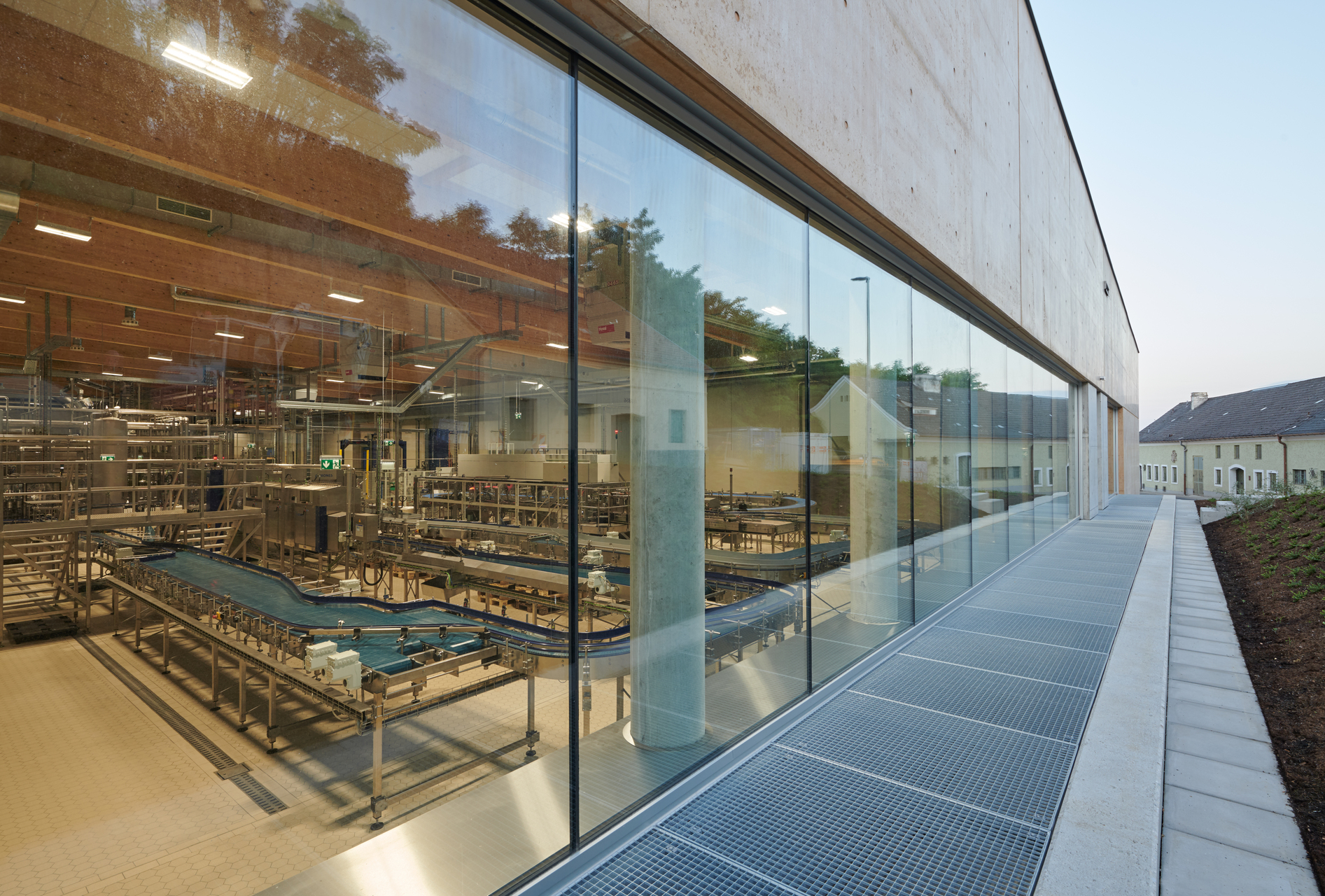 Innen fällt die großzügige Tageslichtführung auf, die Bedacht darauf nimmt, sommerliche Überwärmung zu vermeiden. Die Fensterbänder der großen Dachlaternen bringen viel Licht von oben, immer wieder wird Ausblick in die Umgebung gewährt. Die Wege vom Keller in die Abfüllanlage sind kürzer geworden. Den Geräuschpegel der wie ein riesiges mechanisches Ballett anmutenden Flaschenfüllanlage, die mit 15.000 Flaschen pro Stunde 20 Prozent mehr erledigt als die Vorgängerin, mindert eine Lärmschutzdecke.