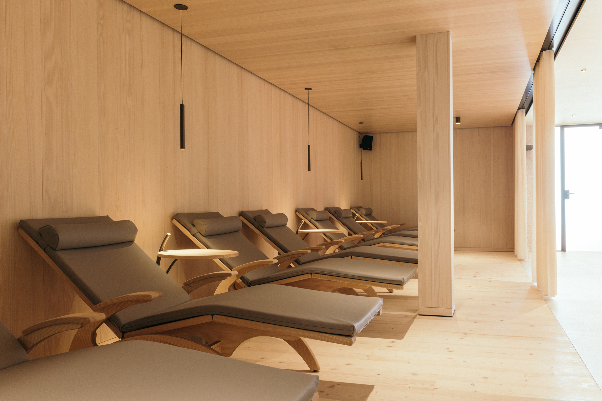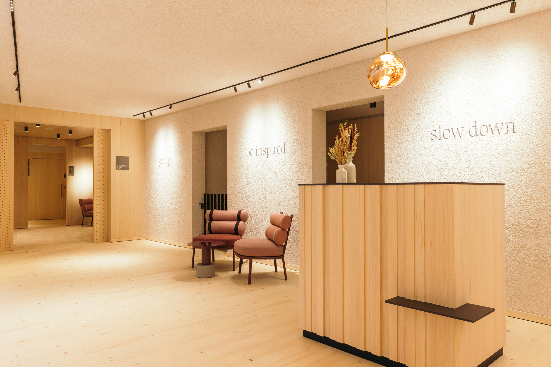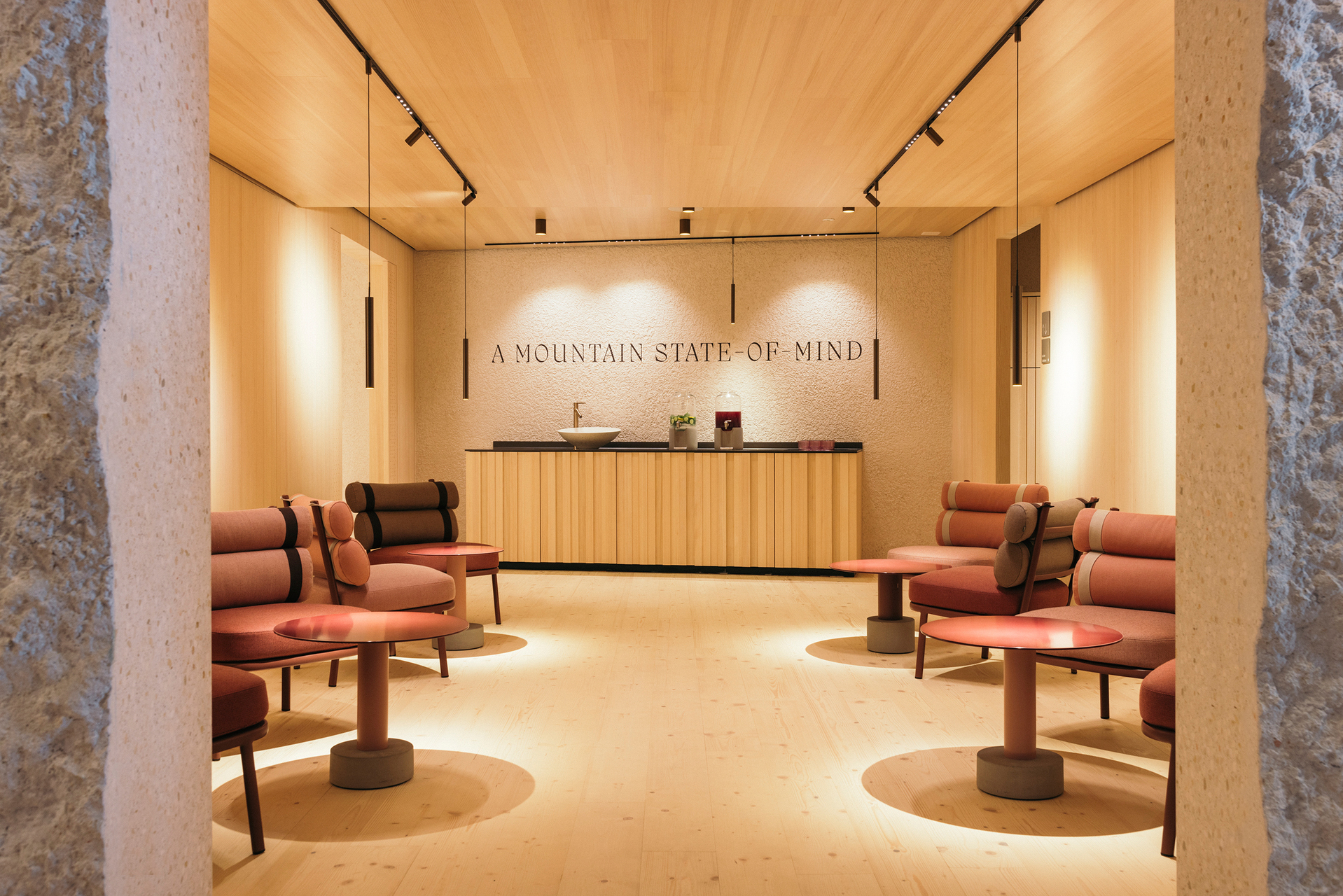 Kontrastierend zu den allgegenwärtigen Hotelarchitekturen nach der Art „Anything Goes“ wurde es unter dem Leitsatz „A Mountain State Of Mind“ in unaufgeregten, lokalen Materialien umgesetzt und bietet auf knapp 2000 m Höhe Luft und Raum zu Tiefenentspannung.