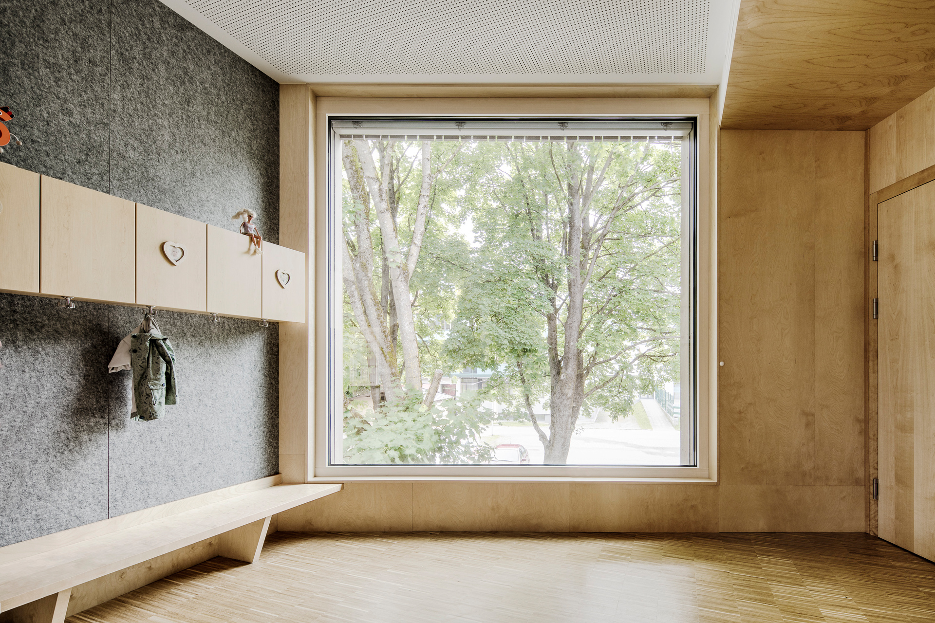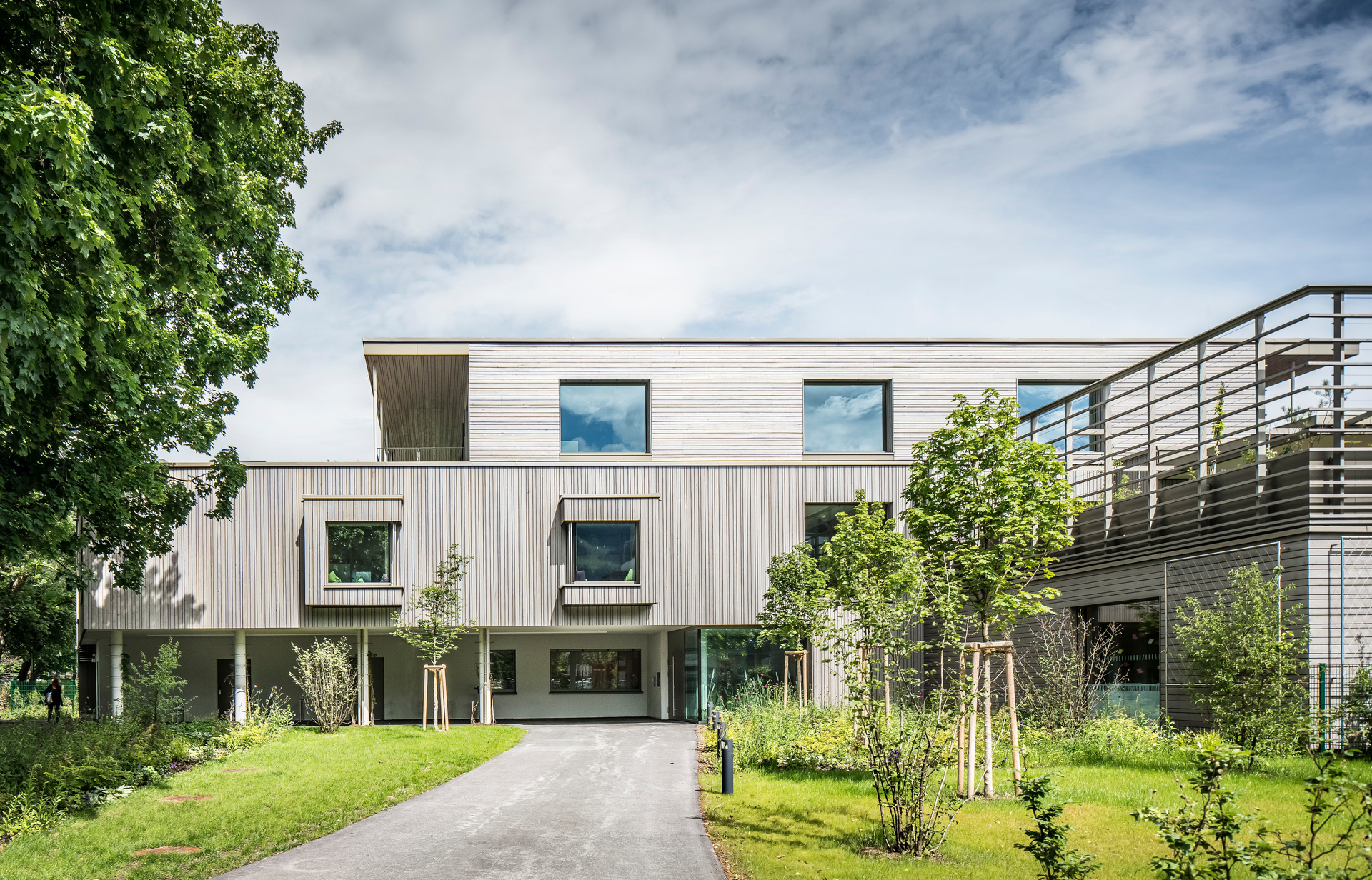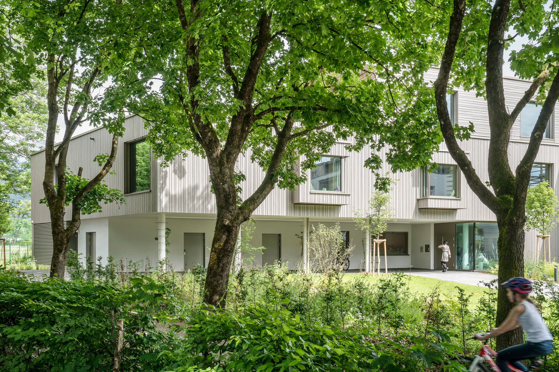 Die Errichtung in einem modularen System sowie eine Standardisierung der Tür- und Fenstertypen erlaubten eine Reduktion der Baukosten. Das Gebäude wurde in Hybridbauweise errichtet, dabei wurde das konstruktive Gerüst aus Stahlbetonstützen und -decken mit Wänden aus Kreuzlagenholz ausgefacht. (Text: Roman Höllbacher, nach einem Text des Architekten)