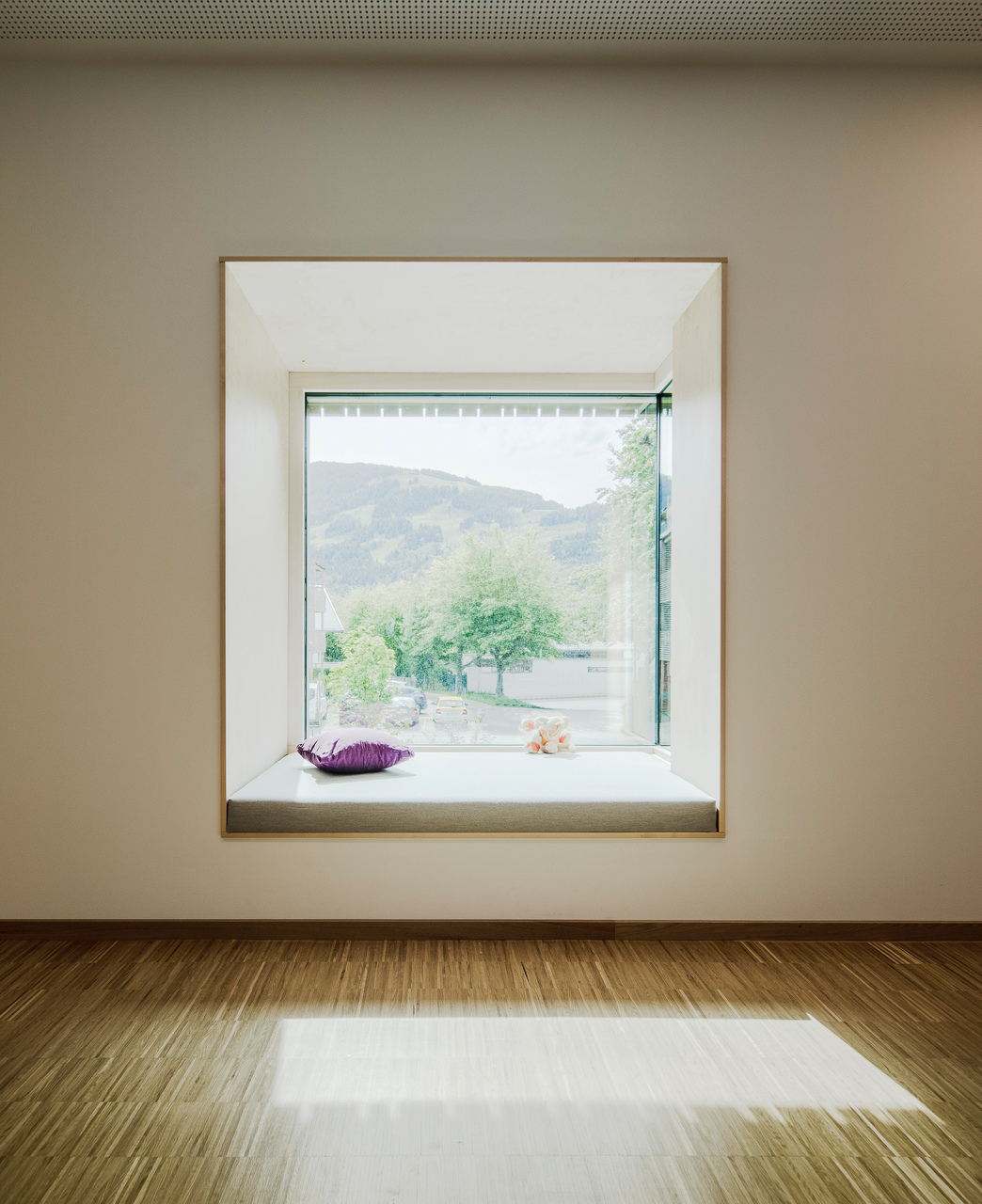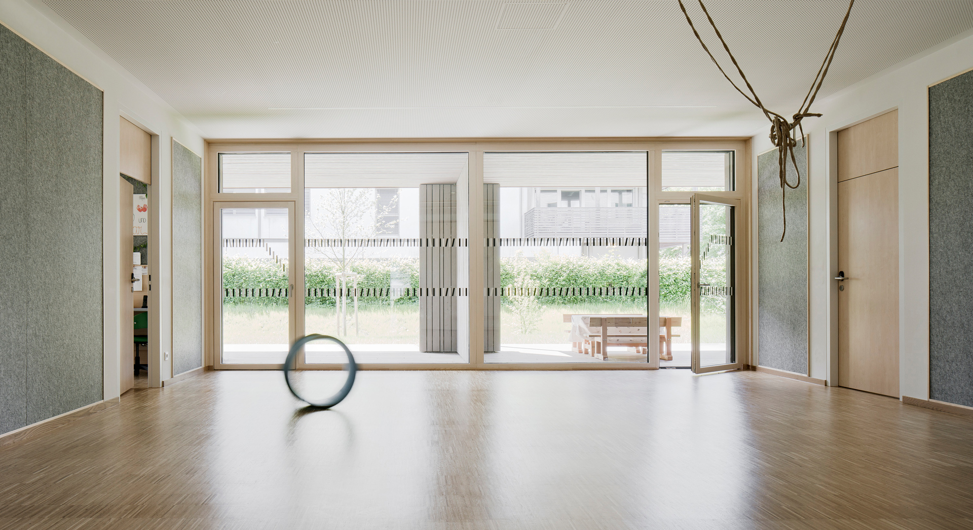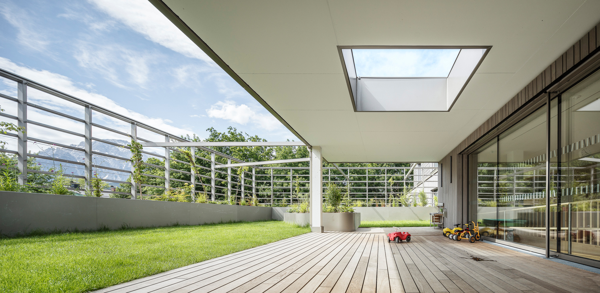 Der Innenhof im ersten Stock ist ebenfalls begrünt und bietet Sichtschutz. Diese Ebene wurde mit einem 25 Meter breiten Rodelhang und einer Brücke samt Spielhügel mit dem Garten verbunden. Diese Verbindungen mit dem Garten kompensieren geschickt die baurechtlich notwendige zweite Fluchtstiegenhaus und bieten so spielerisch(en) Mehrwert. Die Kinder im ersten Obergeschoss können darüber hinaus den 200 m² großen begrünten Hof bespielen. Jedem Gruppenraum ist zudem eine 25 m² große gedeckte Terrasse zugeordnet.