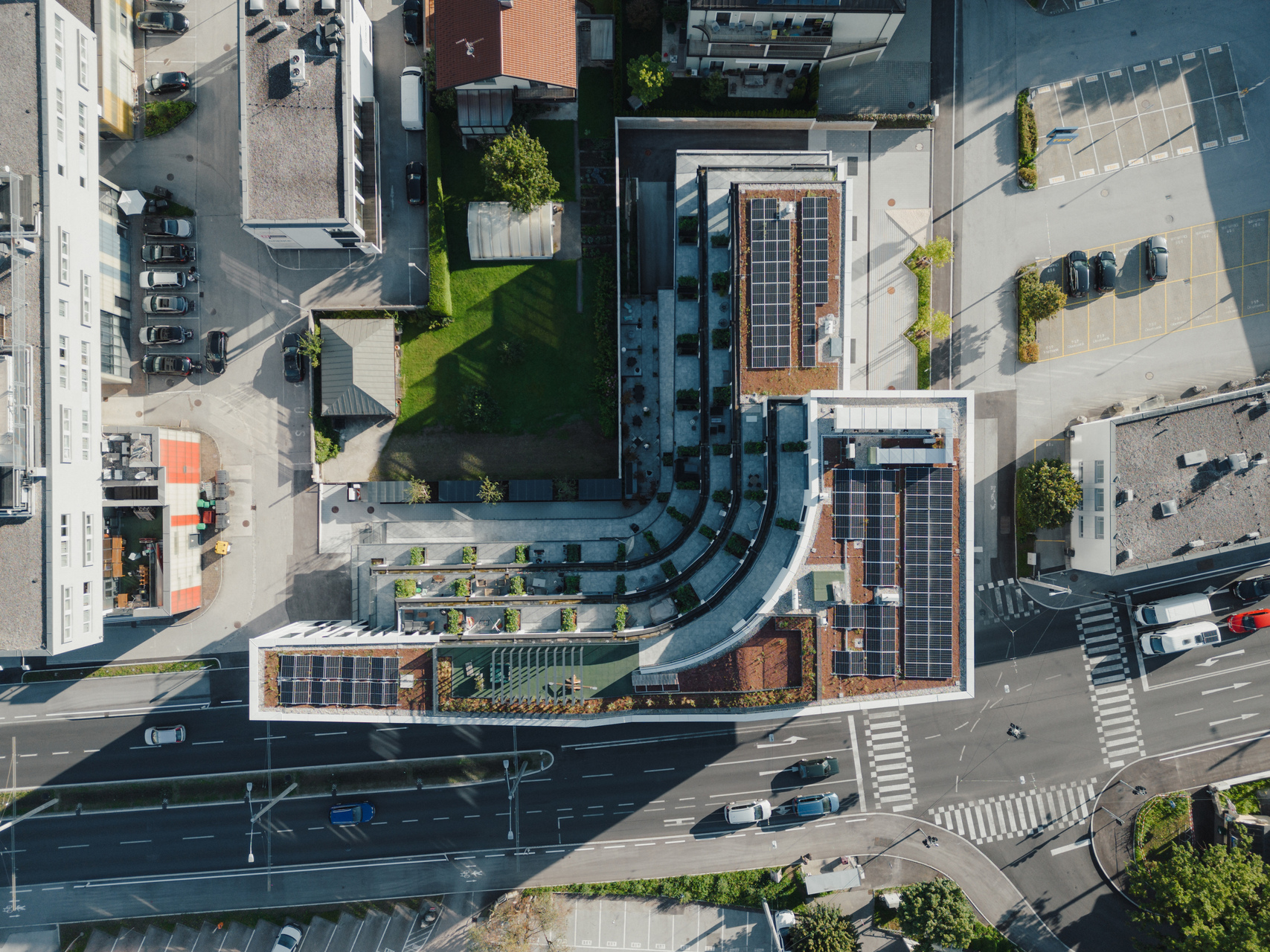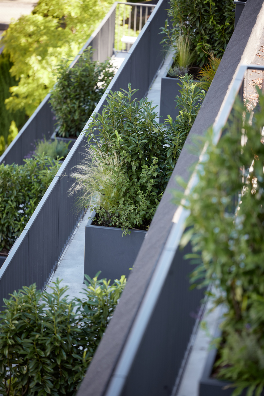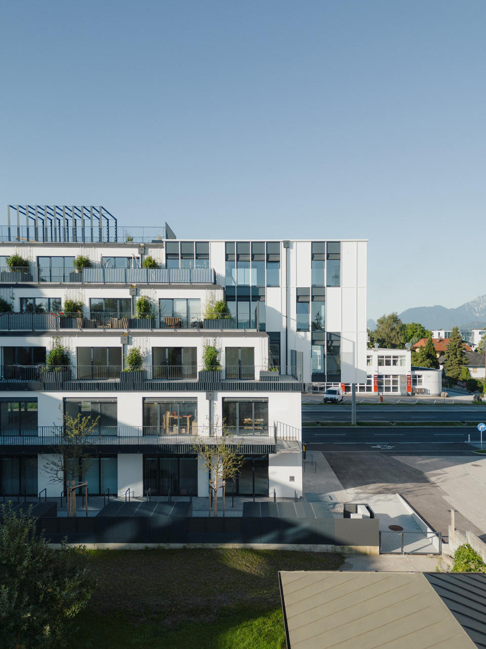 Die gewerbliche Nutzung ist im Sockel und im Hochpunkt in Richtung Straße angesiedelt, die Wohnungen orientieren sich zur ruhigen Seite nach Norden hin. Die straßenabgewandte Seite ist terrassiert und stark durchgrünt und lässt somit allen Wohnungen uneinsehbare Freiflächen zukommen. Zur vielbefahrenen Bundesstraße hin zeigt sich das Haus mit einer robusten Aluminium-Verbundfassade.
