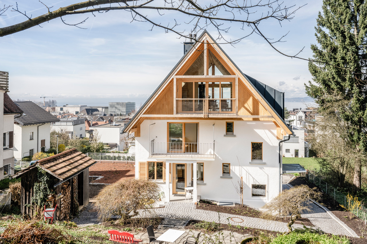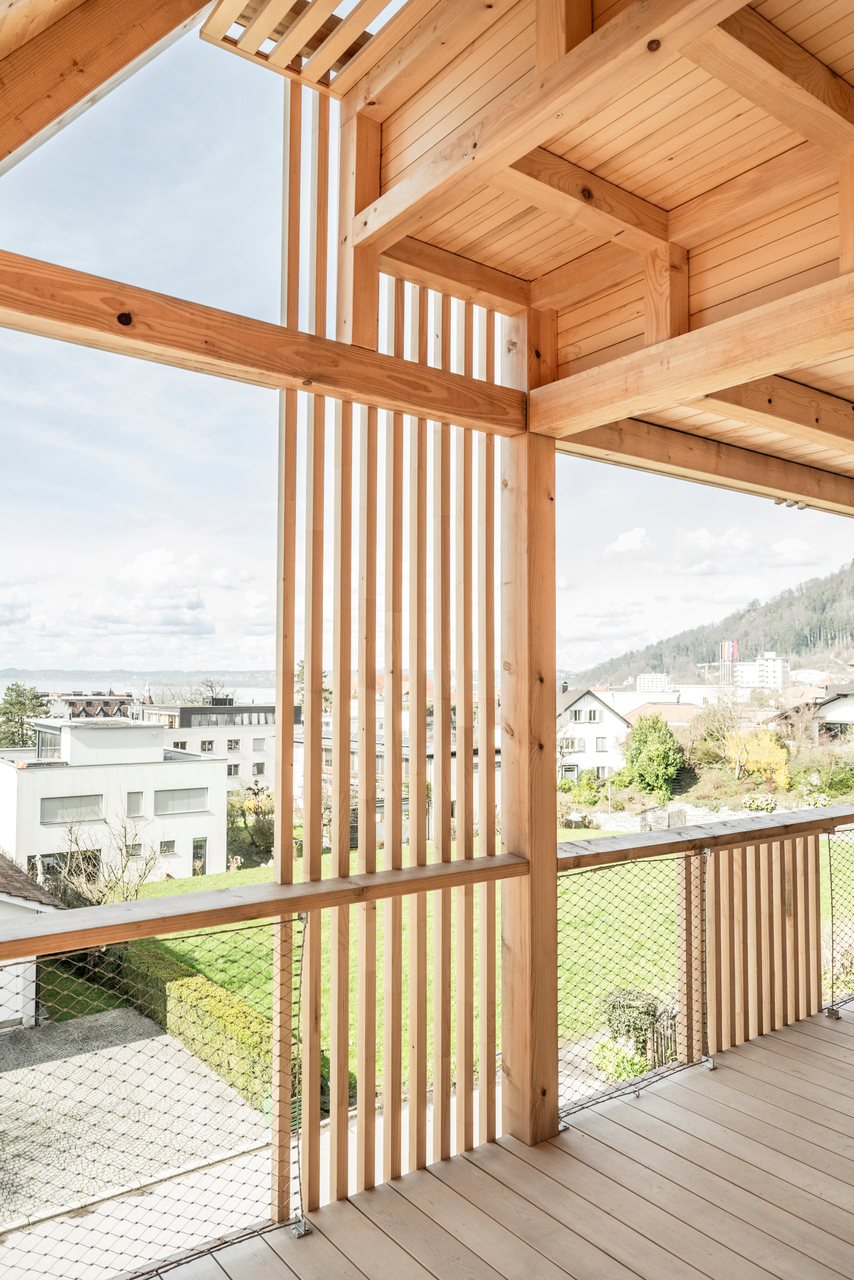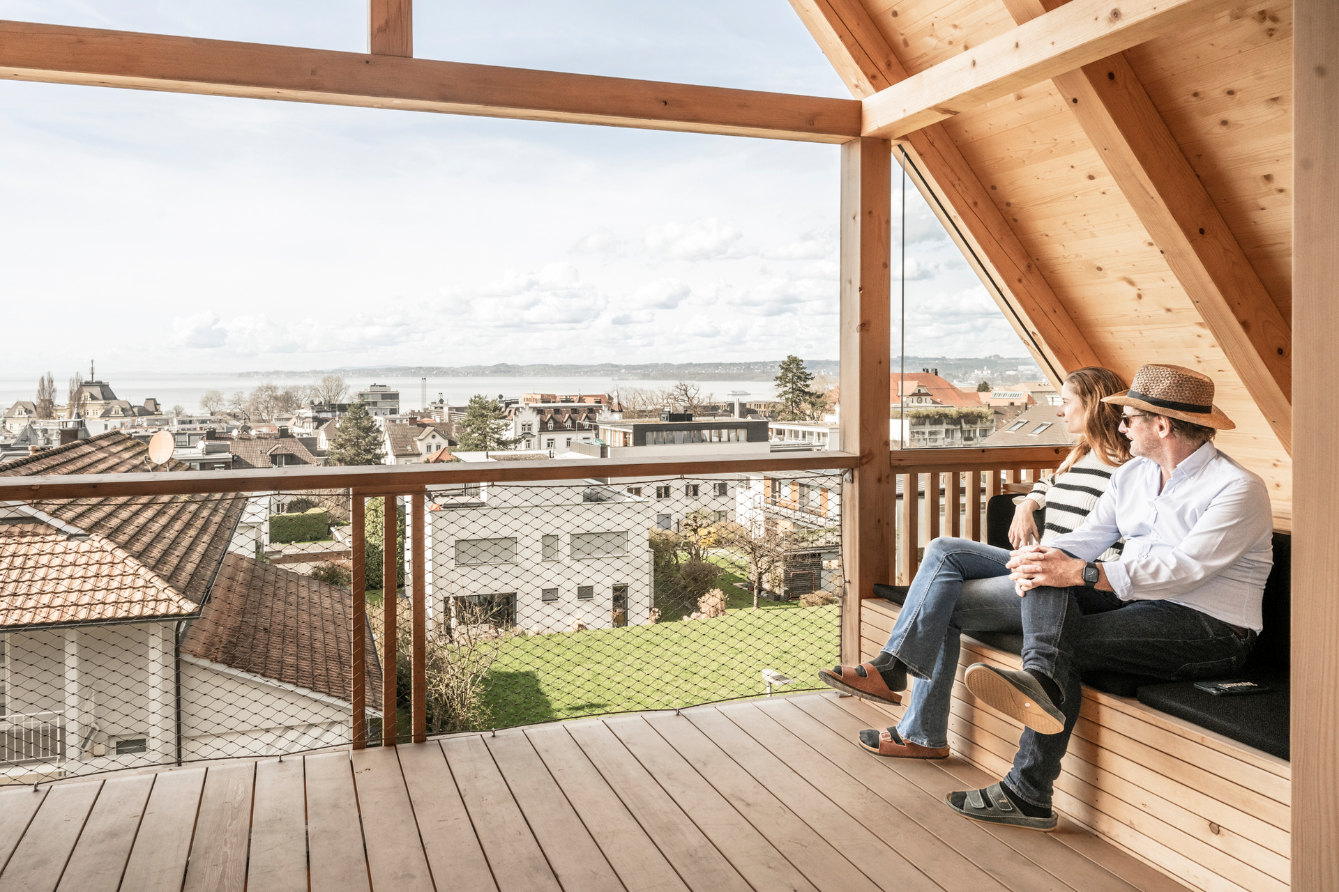 Im ersten Stock sind die Schlafzimmer und Bäder. Im zweiten Obergeschoss bilden Kochen, Essen und Wohnen einen offenen, hohen Einraum, dem das Satteldach eine großzügige Atmosphäre gibt. Seine Dachvorstände schaffen auch sehr besondere Freiräume im Osten und Westen, die von einem kleinen Balkon im Süden ergänzt werden. Das schafft eine Vielfalt an Ausblicken auf Berg, See und Stadt, die je nach Jahreszeit unterschiedliche Sonnen- oder Schattenplätze bieten.