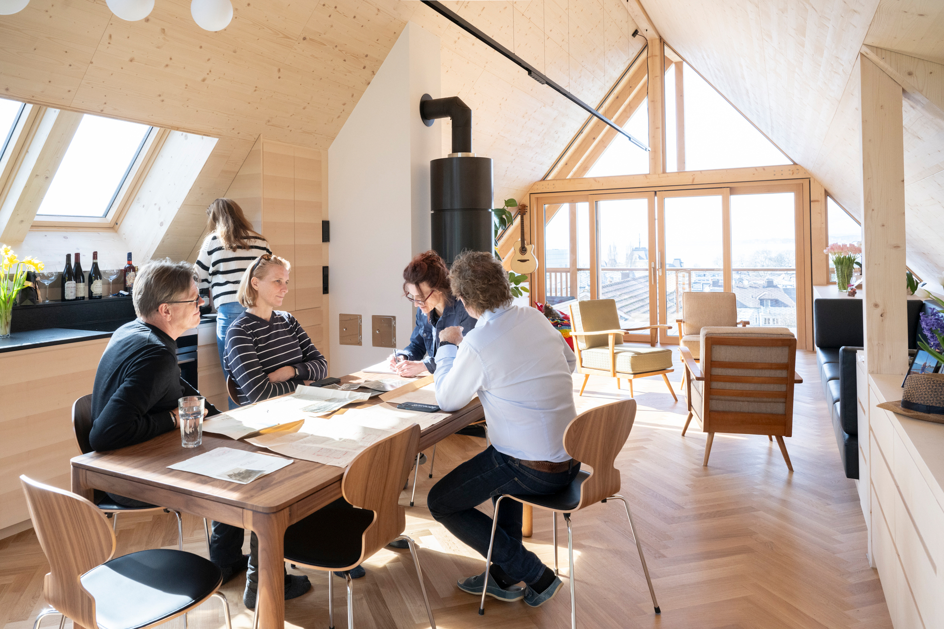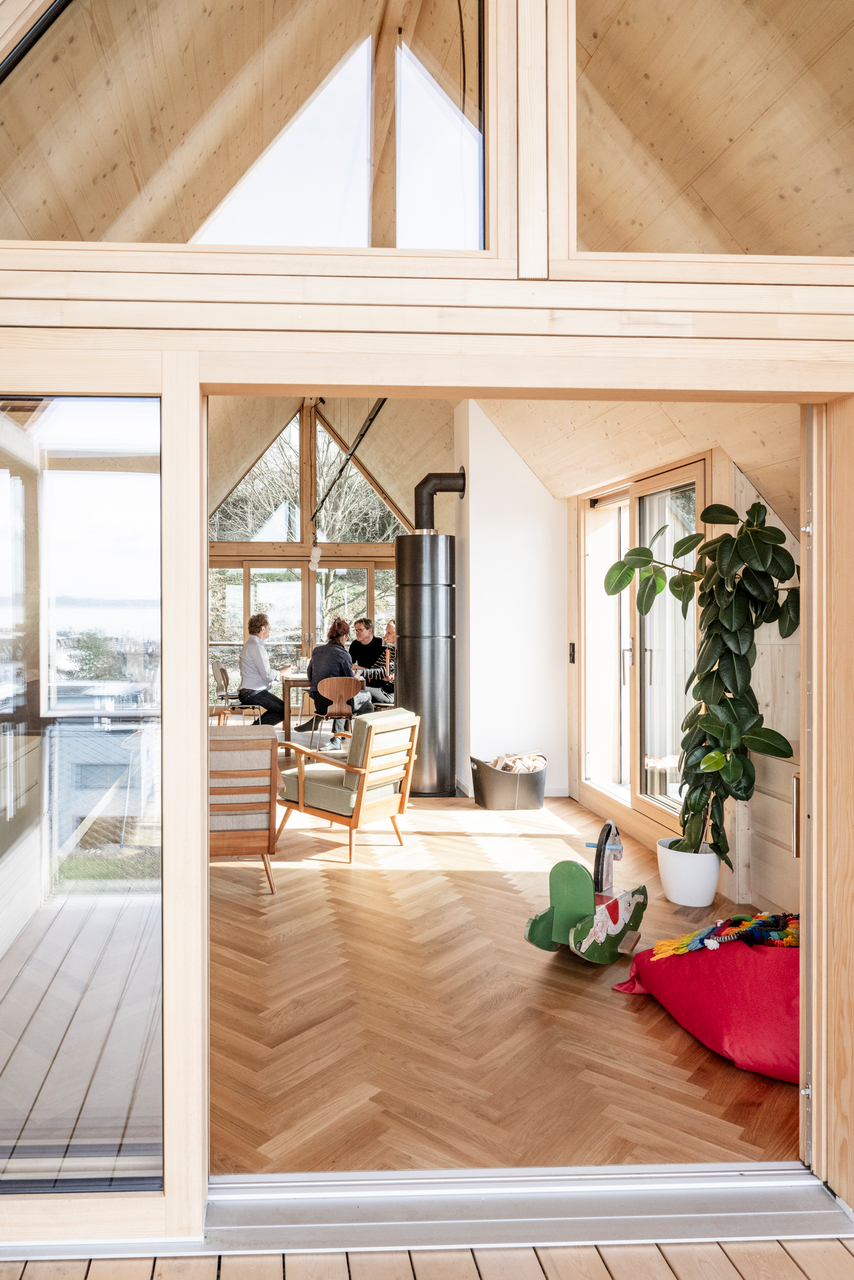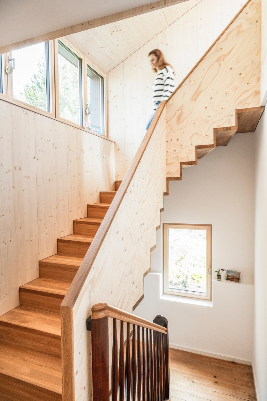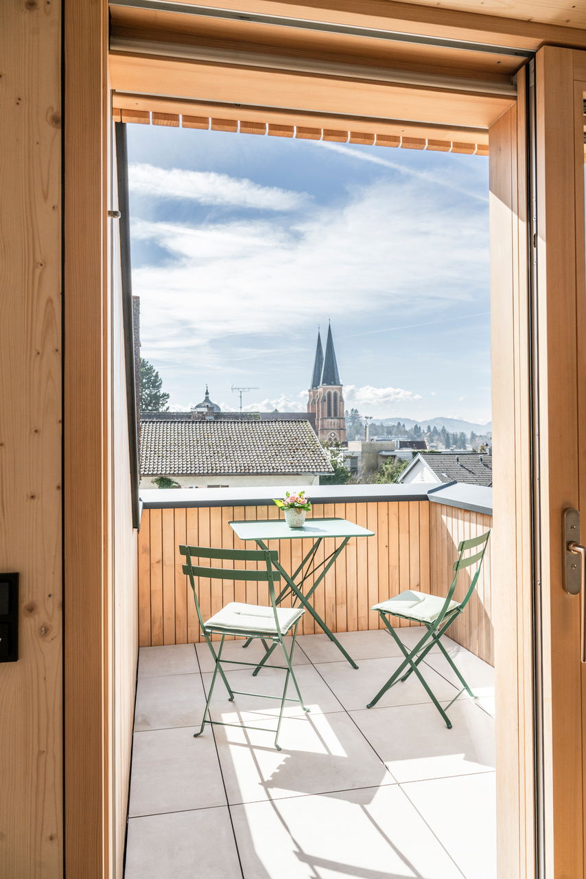 Im ersten Stock sind die Schlafzimmer und Bäder. Im zweiten Obergeschoss bilden Kochen, Essen und Wohnen einen offenen, hohen Einraum, dem das Satteldach eine großzügige Atmosphäre gibt. Seine Dachvorstände schaffen auch sehr besondere Freiräume im Osten und Westen, die von einem kleinen Balkon im Süden ergänzt werden. Das schafft eine Vielfalt an Ausblicken auf Berg, See und Stadt, die je nach Jahreszeit unterschiedliche Sonnen- oder Schattenplätze bieten.