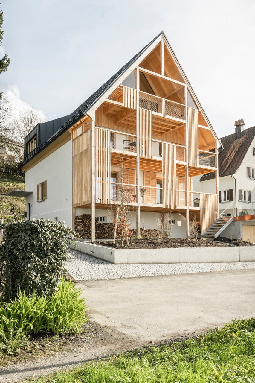 An der straßen- und seeseitigen Giebelfront im Westen wurde dem Haus über alle drei Geschosse hinweg ein Holzgerüst vorgestellt, das jede Ebene um gedeckte Freiräume in Form von Veranden und Terrassen unterschiedlicher Qualität erweitert. Im Erdgeschoss verschneidet sich diese Terrasse mit Gelände und Garten.