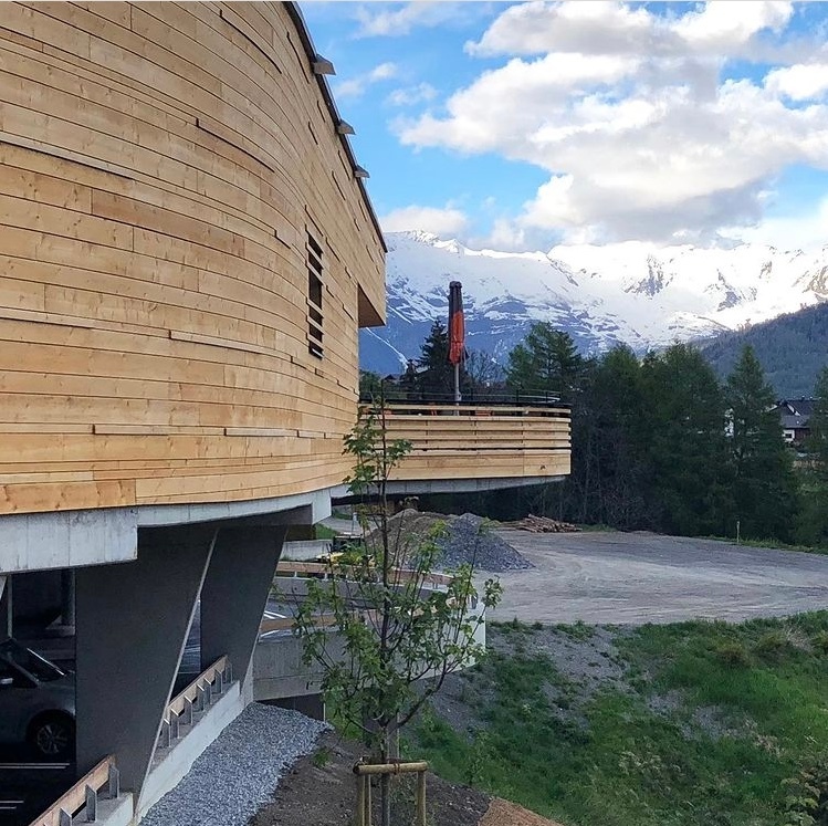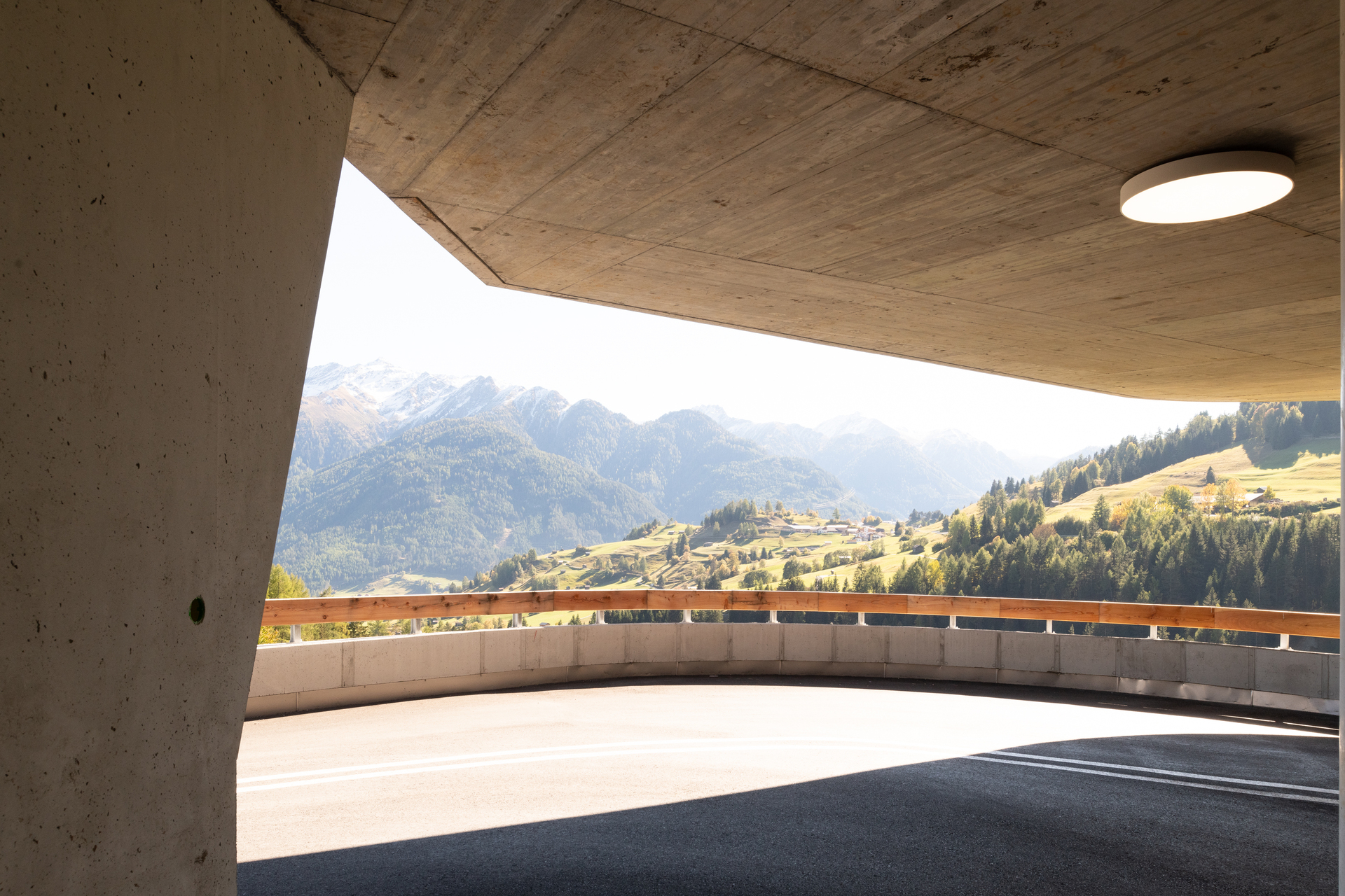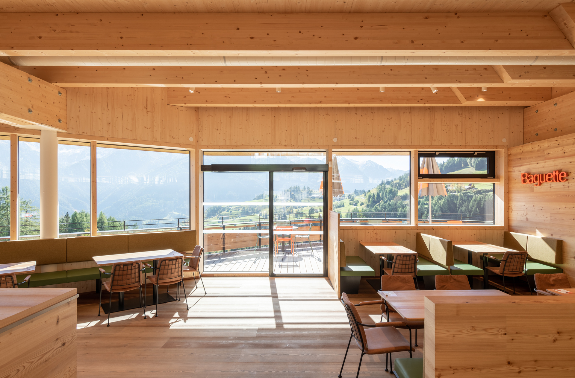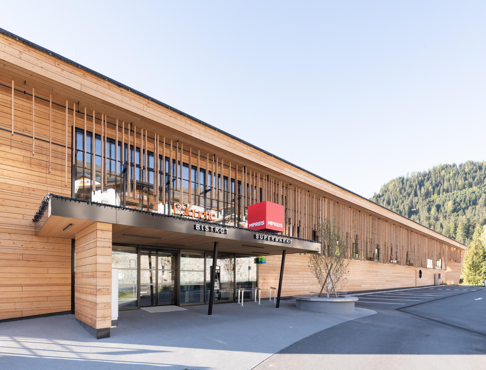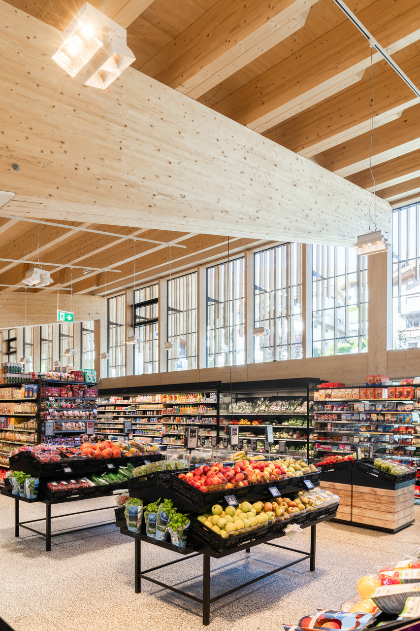 Die Verkaufsebene besteht aus einer fast fünf Meter hohen, luftigen und sonnendurchfluteten Halle, die sich zu den höher gelegenen Hotels öffnet und von einem nach Norden ansteigenden Dach abgeschlossen wird. Im südlichen Bereich mit der höchsten Raumhöhe befindet sich das Baguette Café Bistro, von dem aus man auf eine große Sonnenterrasse mit Blick auf die umliegende Bergwelt gelangt. Im Untergeschoss befindet sich die Parkebene, eine weitgespannte Betonkonstruktion, die sich ebenfalls nach Süden in die Landschaft öffnet. Sowohl auf dem Dach als auch an der Südwestfassade sind Photovoltaik-Module installiert, die den Strom für den Markt liefern, der mit Fernwärme aus einer benachbarten Tischlerei beheizt wird. Rund um das Gebäude wurden zahlreiche heimische Bäume und Sträucher gepflanzt, die zusammen mit der im Lauf der Zeit vergrauenden Lärchenfassade dazu beitragen, dass sich das Gebäude möglichst selbstverständlich als unterer Abschluss des Dorfes in die Umgebung einfügt. (Text: Claudia Wedekind, nach einem Text der Architekten)