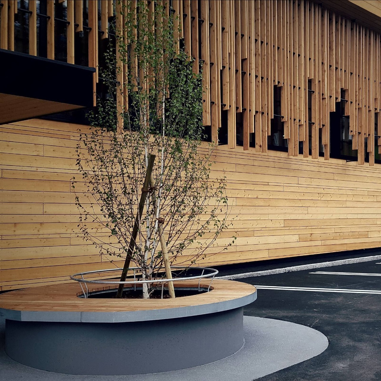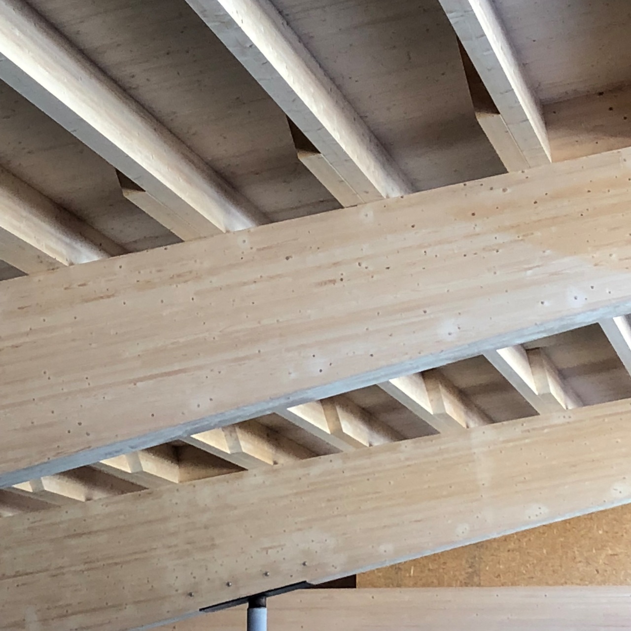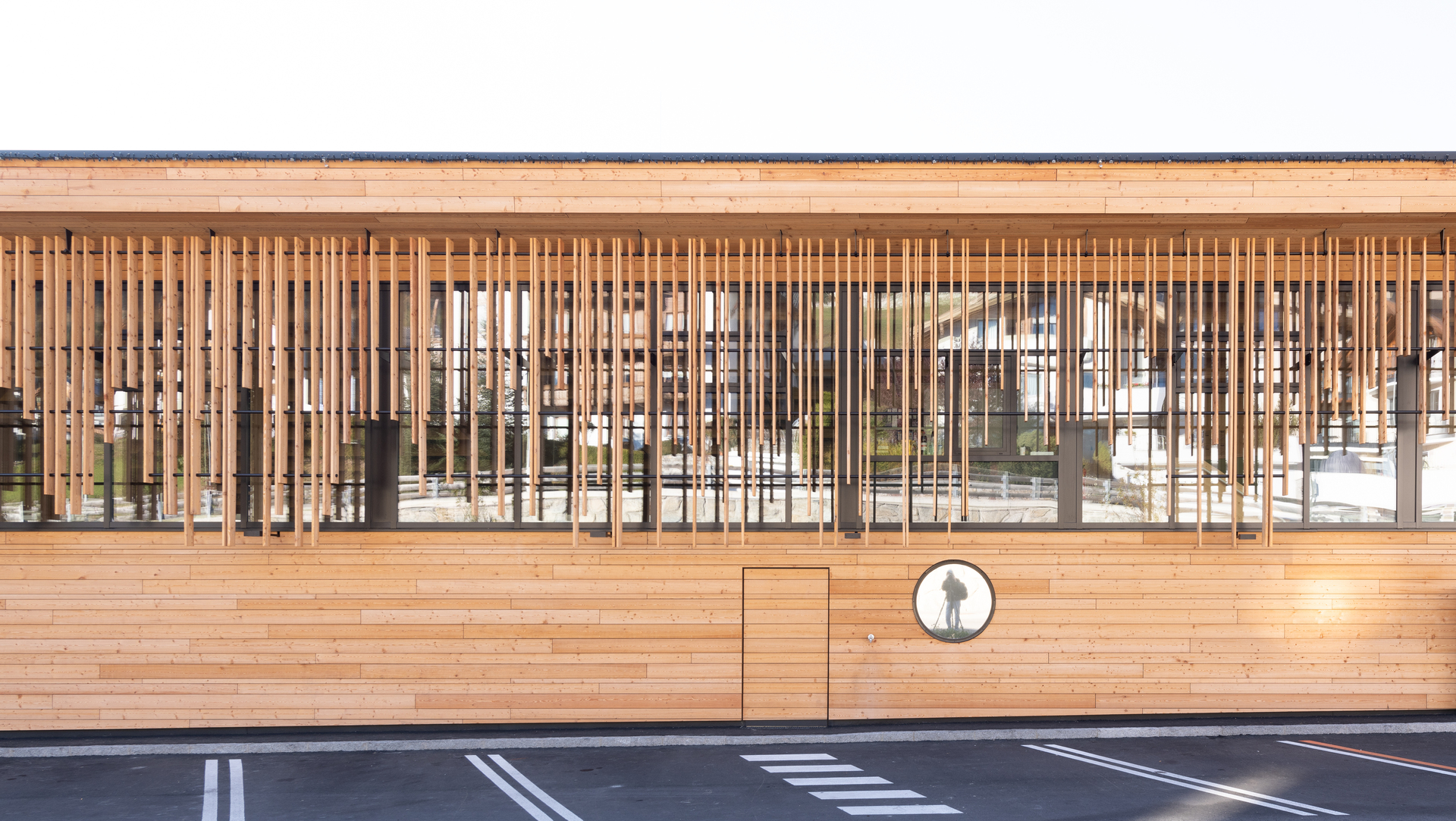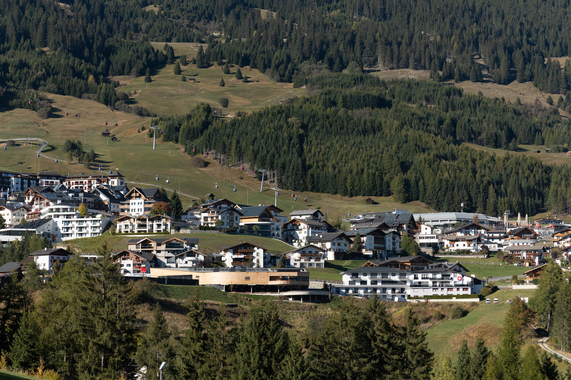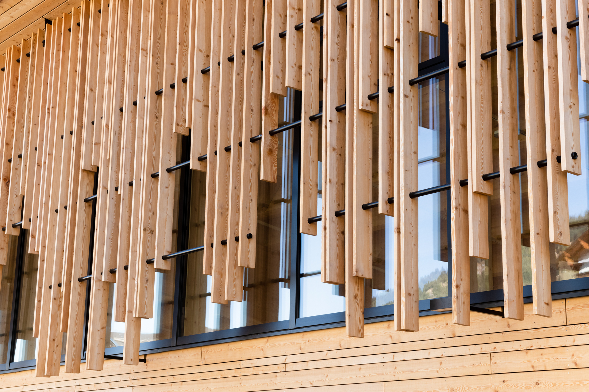 Die Verkaufsebene besteht aus einer fast fünf Meter hohen, luftigen und sonnendurchfluteten Halle, die sich zu den höher gelegenen Hotels öffnet und von einem nach Norden ansteigenden Dach abgeschlossen wird. Im südlichen Bereich mit der höchsten Raumhöhe befindet sich das Baguette Café Bistro, von dem aus man auf eine große Sonnenterrasse mit Blick auf die umliegende Bergwelt gelangt. Im Untergeschoss befindet sich die Parkebene, eine weitgespannte Betonkonstruktion, die sich ebenfalls nach Süden in die Landschaft öffnet. Sowohl auf dem Dach als auch an der Südwestfassade sind Photovoltaik-Module installiert, die den Strom für den Markt liefern, der mit Fernwärme aus einer benachbarten Tischlerei beheizt wird. Rund um das Gebäude wurden zahlreiche heimische Bäume und Sträucher gepflanzt, die zusammen mit der im Lauf der Zeit vergrauenden Lärchenfassade dazu beitragen, dass sich das Gebäude möglichst selbstverständlich als unterer Abschluss des Dorfes in die Umgebung einfügt. (Text: Claudia Wedekind, nach einem Text der Architekten)