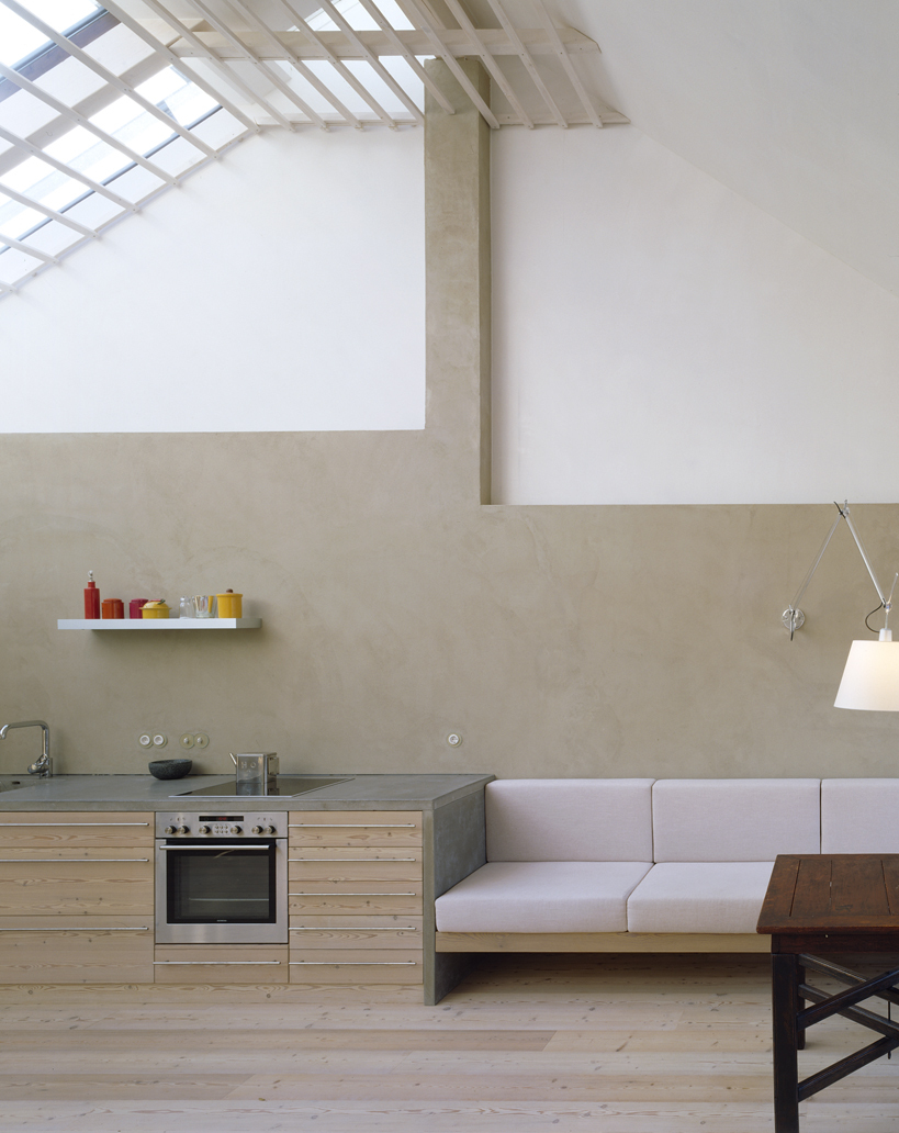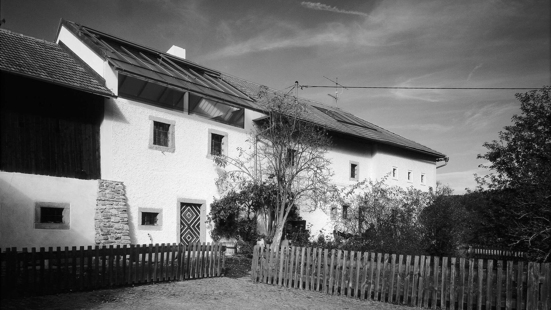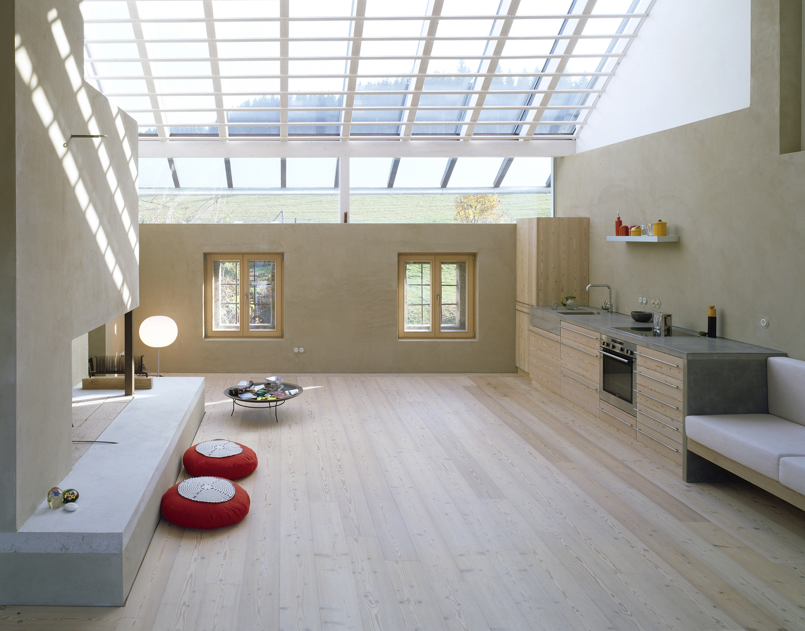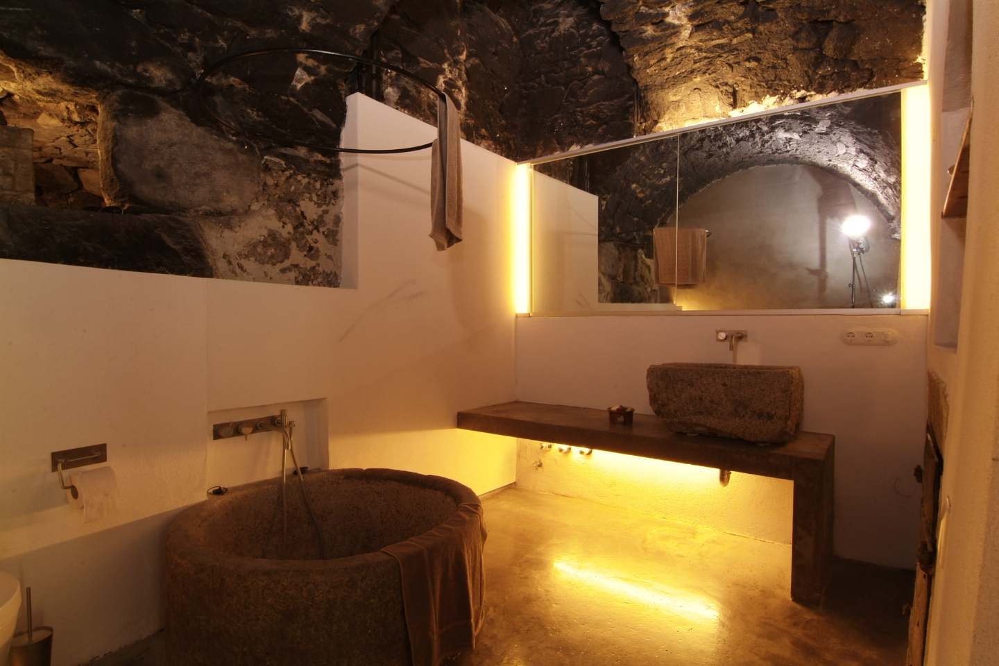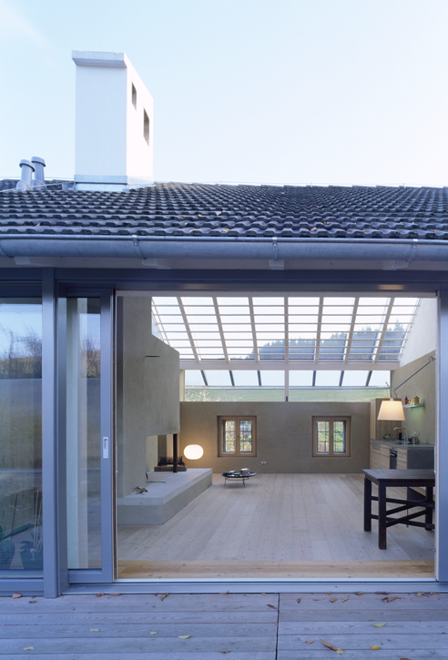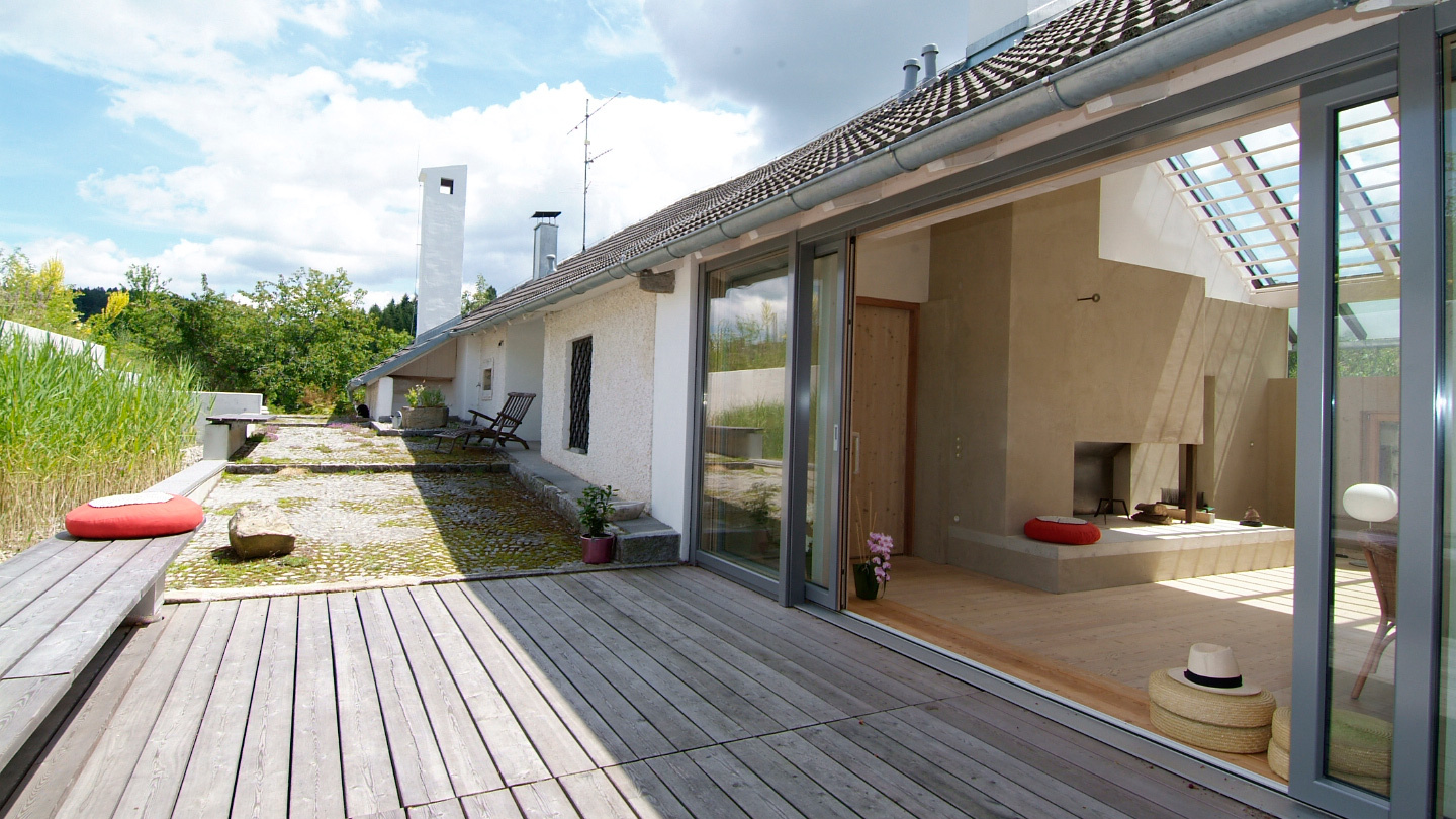 Ein Teil des ehemaligen Stadels wurde zur lichtdurchfluteten Sommerküche umgebaut. Das Dach wurde bündig auf das Niveau des Hauptdachs angehoben. Der südseitig entstandene Spalt zur Mauerbank und die anschließende Dachfläche wurden für größtmögliche Transparenz rahmenlos verglast. Die ehemalige Rauchküche wurde zum Meditationsbad mit Steinbadebottich.