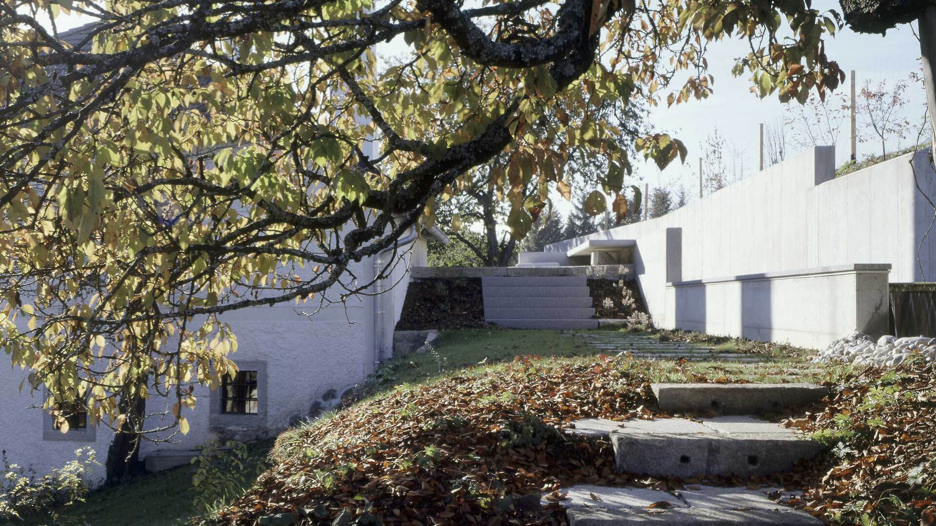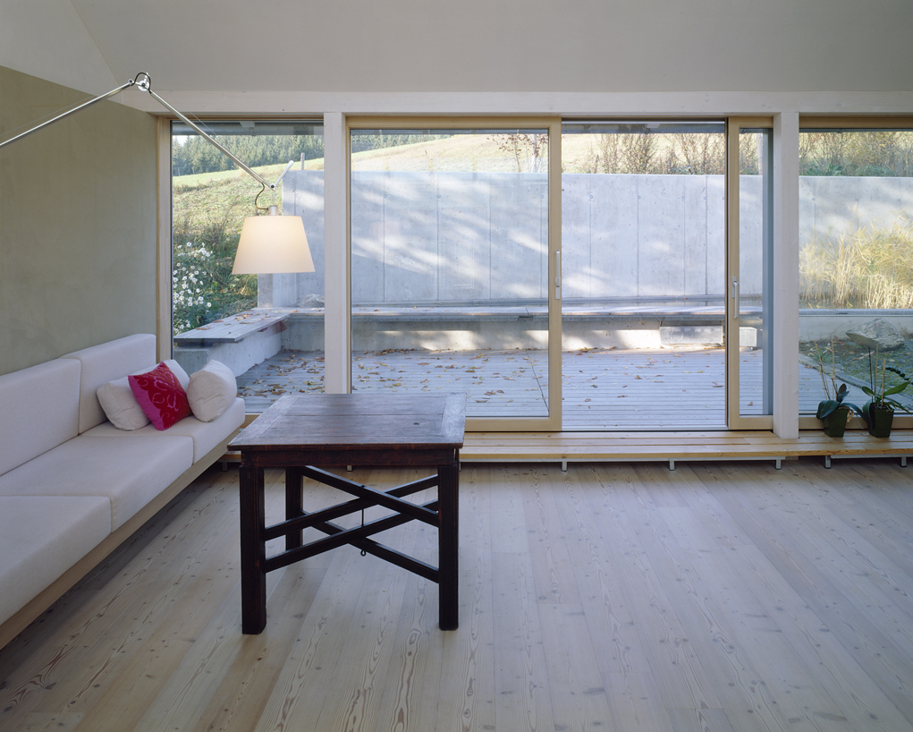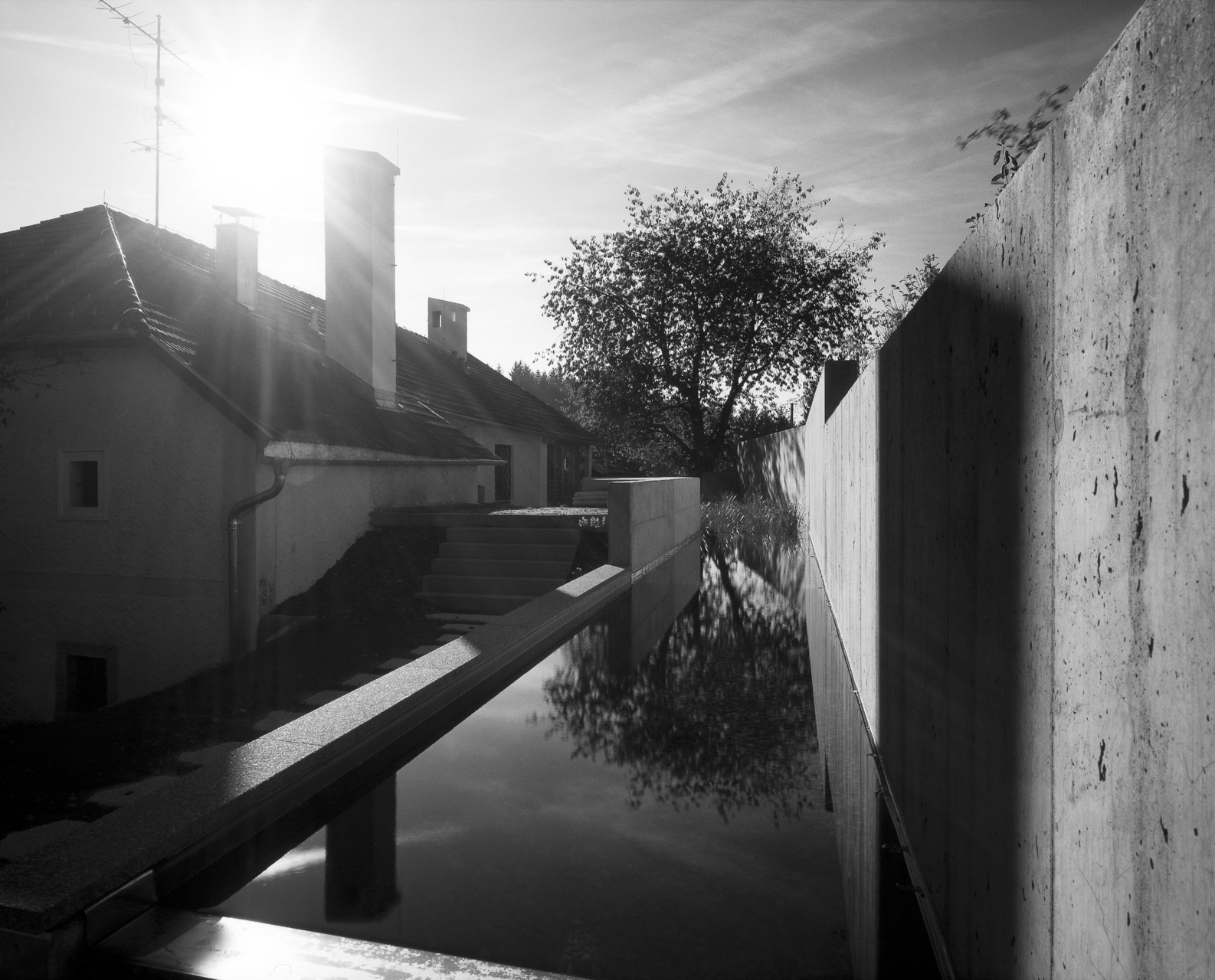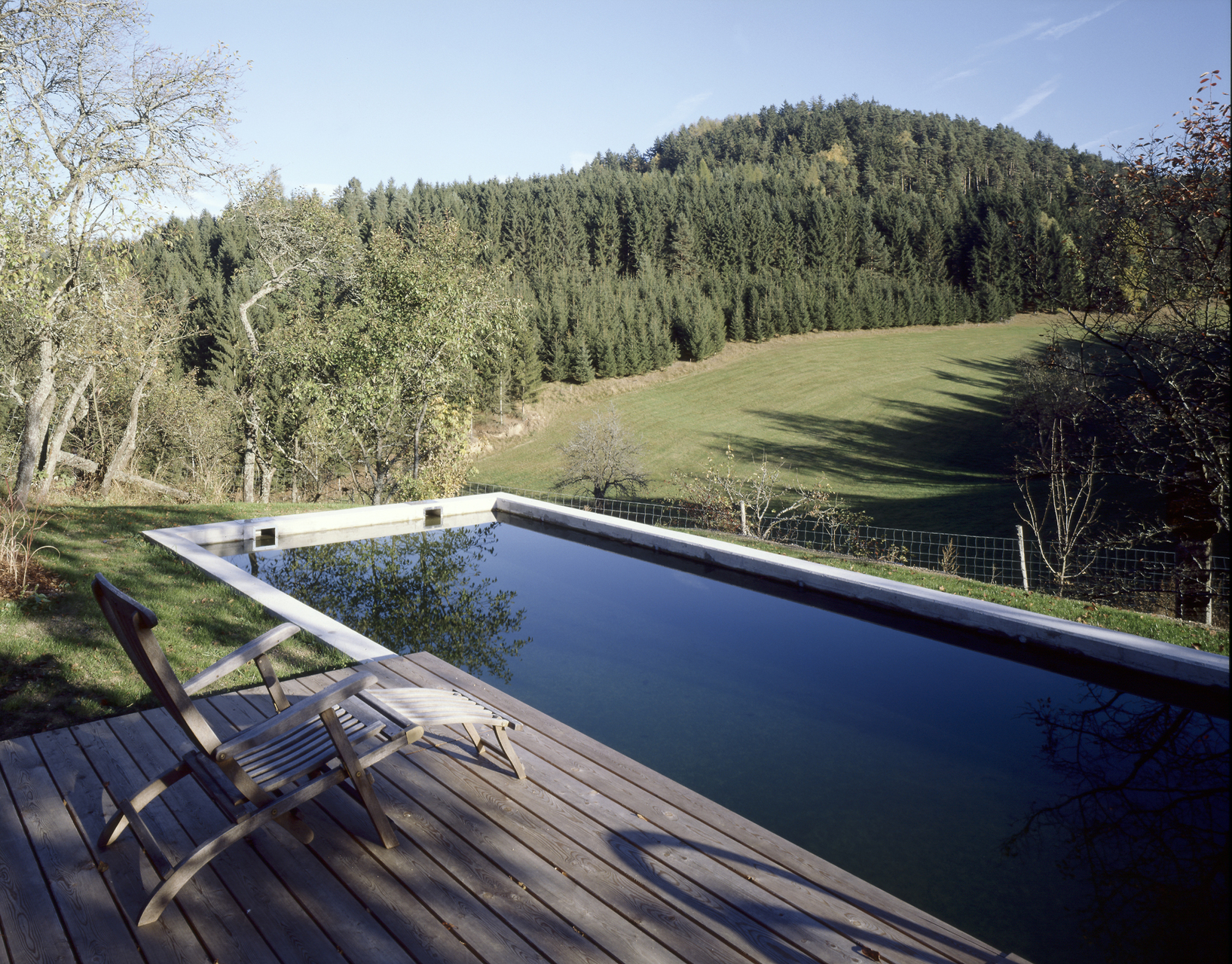 Nordseitig öffnet sich der Innenraum in ganzer Breite zum geschützten Freiraum mit Terrasse und zum oberen Ende des Schwimmteichs. Die Teichanlage ist parallel zum Hang als schmales Wasserbecken aus Sichtbeton mit Pflanz- und Filterzone ausgebildet, das sich über einen kleinen Wasserfall mit unterirdischem Wasserlauf in das große Schwimmbecken ergießt. Die Energie zum Pumpbetrieb wird u. a. mittels Solarzellen erzeugt. Die Stützwände und neuen Steinschlichtungen fügen sich harmonisch in die Struktur der Landschaft. (Text: Architekt, bearbeitet)