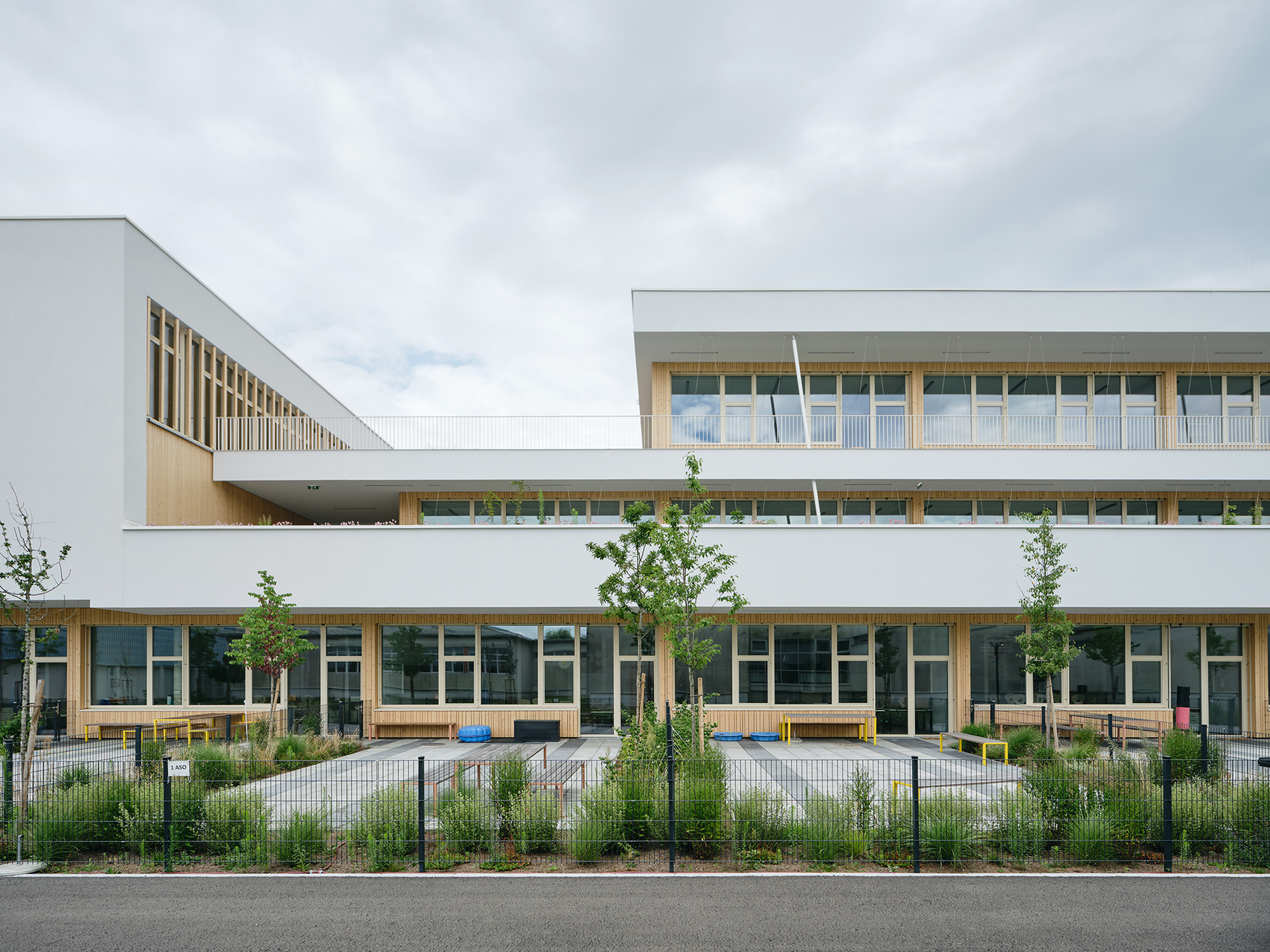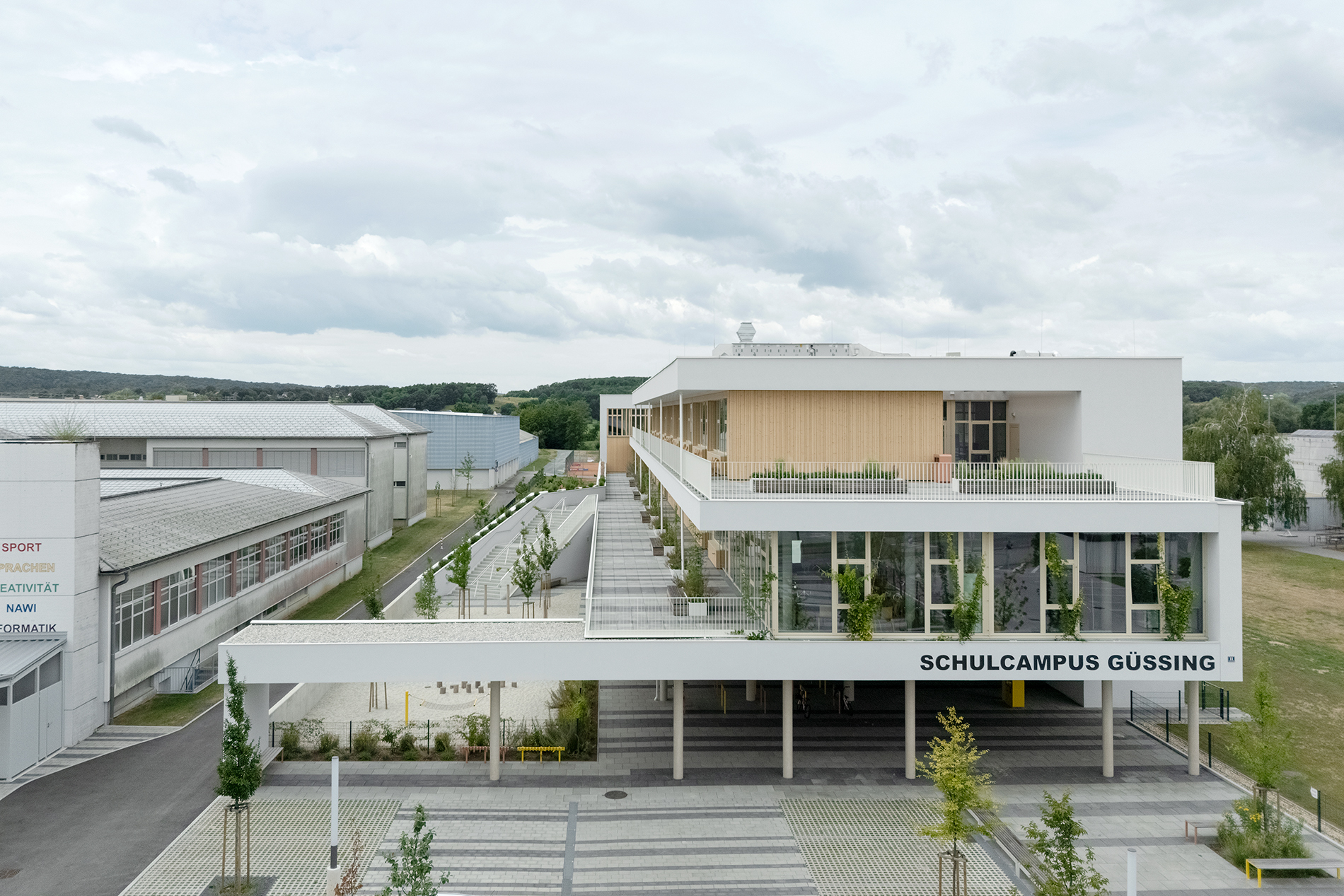 Die Fassade gegen Norden ist bis auf die Ausnahme der Öffnungen von der Aula zum Freiraum hin sparsam verglast und hocheffizient gedämmt. Die Südfassaden sind zum Teil großzügig, jedoch nicht über die gesamte Fläche verglast: Parapete sind als Holzsitzelemente ausgeführt. Als Sonnenschutz dienen die weit ausladenden Vordächer über alle Ebenen, sowie ein begrünter Fassadenschleier zur Erzeugung eines guten Mikroklimas. Darüber hinaus sind erdgeschossig viele Bäume als Schattenspender vorgesehen, die jedoch im Winter wiederum genug Licht in die Unterrichtsräume lassen.