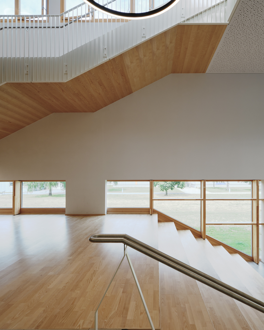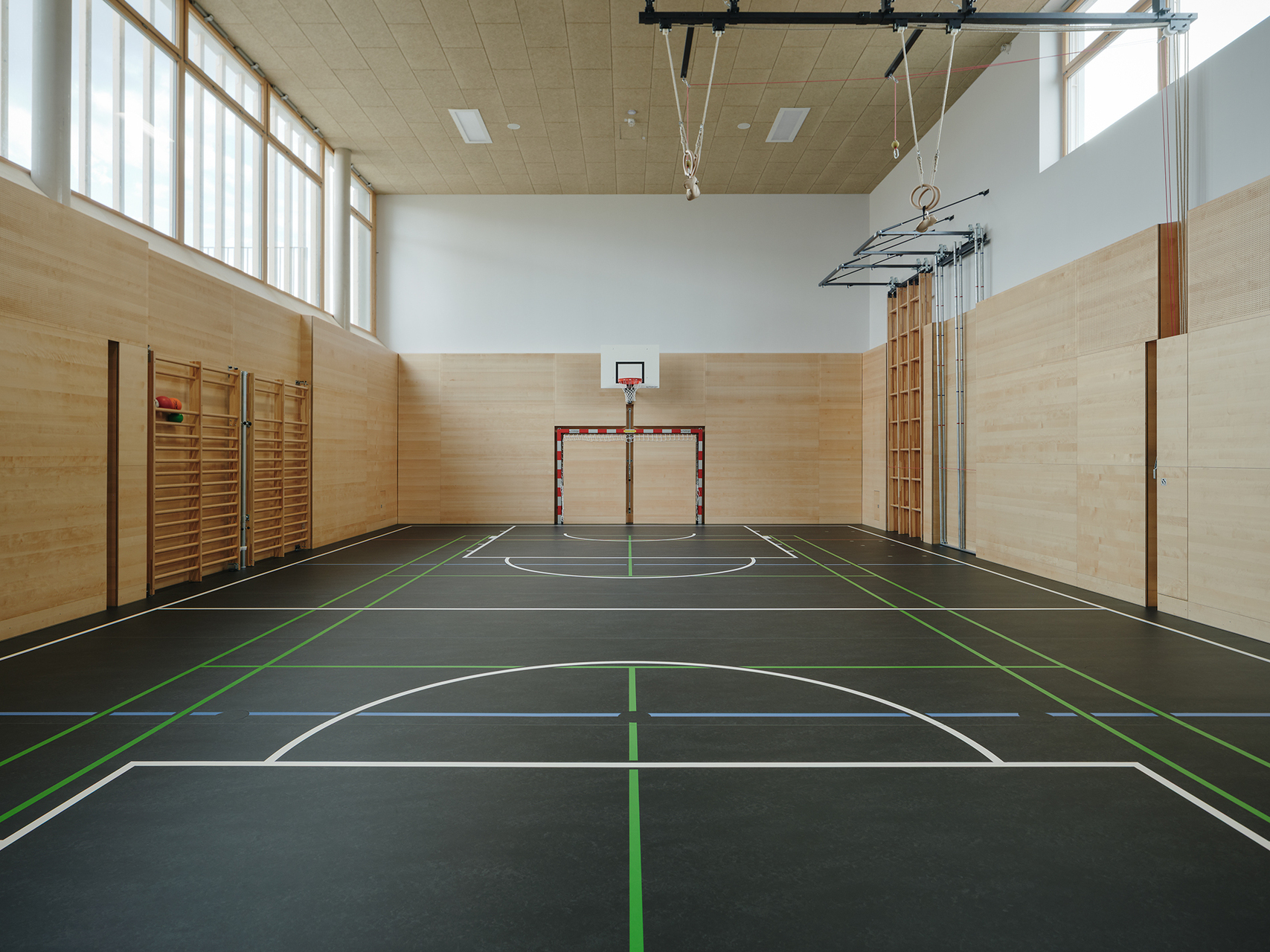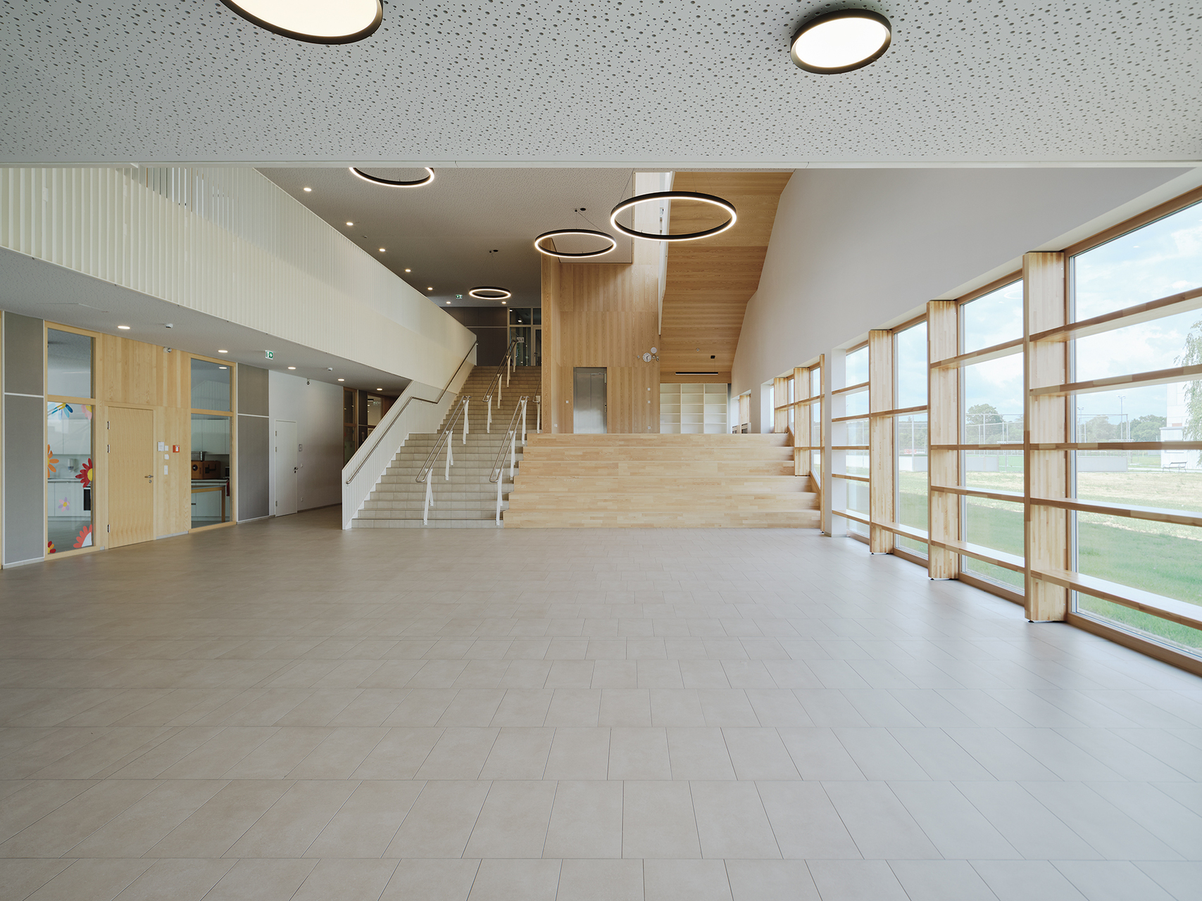 Durch die Längsorganisation des Objekts funktionieren die Zonen autonom, gleichzeitig entsteht ein kompaktes Gefüge. Die Allgemeine Sonderschule wird in der westlichen Hälfte des Objektes erdgeschossig angelegt, Volksschule und Zentralmusikschule werden im östlichen Teil zentriert angesiedelt. Im ersten Obergeschoß befinden sich Sonderunterrichtsräume, Verwaltungs- und Lehrpersonalräume sowie der Turnsaal. Die Aula ist der offene Lebens- und Aktionsraum für die unterrichtsbegleitenden Programme: seien es die Tagesbetreuung, aber auch Veranstaltungen. Die Freizeiträume sind in den Aulabereich integriert und bilden zusammen mit den Sitzstufen eine großzügige Bespielungszone für die verschiedensten Aktivitäten. Hier ist auch die Bibliothek als wichtiger Teil des pädagogischen Gesamtkonzeptes integriert und animiert damit zum spielerischen Umgang mit dem Lesen. Die Sitzstufen können ebenso als Auditorium für die in unmittelbarere Nähe liegende Zentralmusikschule oder umgekehrt als Bühne für performative Ambitionen verwendet werden. Aus den Sitzstufen heraus entwickelt sich ein großzügiger, offener Erschließungskern über alle Ebenen.