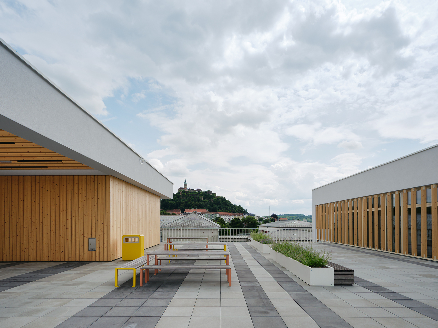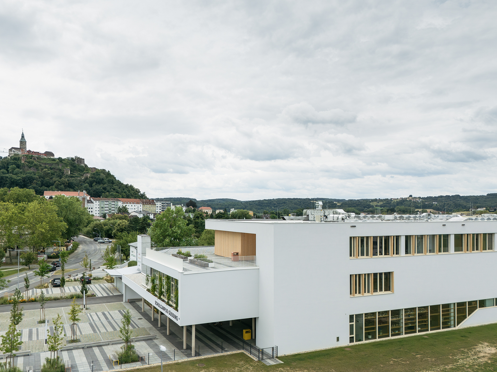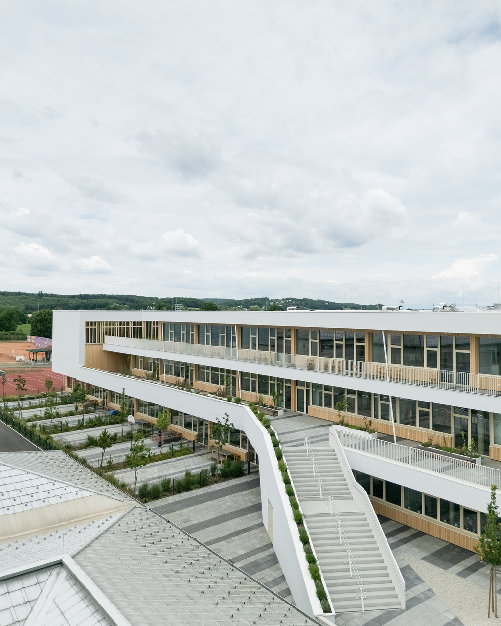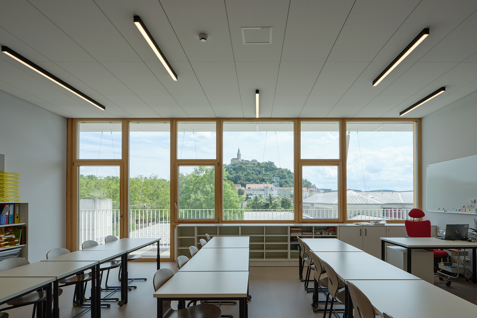 Zunächst galt es, genug Freiraum zu belassen, um die Bewegung für die Schüler sicherzustellen. Das Projekt wurde – dem schlanken Zuschnitt des Grundstücks geschuldet – als lang gestreckter, gestufter Baukörper in dreigeschossiger Bauweise angelegt. Über die gesamte Länge des Areals werden dadurch nach Süden ausgerichtete besonnte Freiräume geschaffen. Durch die Abstufung der Funktionsebenen werden großzügige Terrassen vor den Hauptunterrichtsräumen geschaffen, die als Auslauf in den Pausen, aber auch als Freiklassen dienen. Mit den großzügigen Öffnungen entlang der gesamten Südfassade erhält das Gebäude eine klare Orientierung - mit der Burg als Bezugspunkt - zum Zentrum der Stadt. Die Hauptunterrichtsräume sind nach Süden zur ruhigen Erschließungsstraße orientiert und wenden sich von der „lauten“ Schulstraße ab. Alle Hauptunterrichtsträume erhalten mit ihrer ostseitigen Orientierung dieselben Lichtkonditionen, gleichzeitig wird eine dunkle Westseite für den Vormittagsbetrieb vermieden.