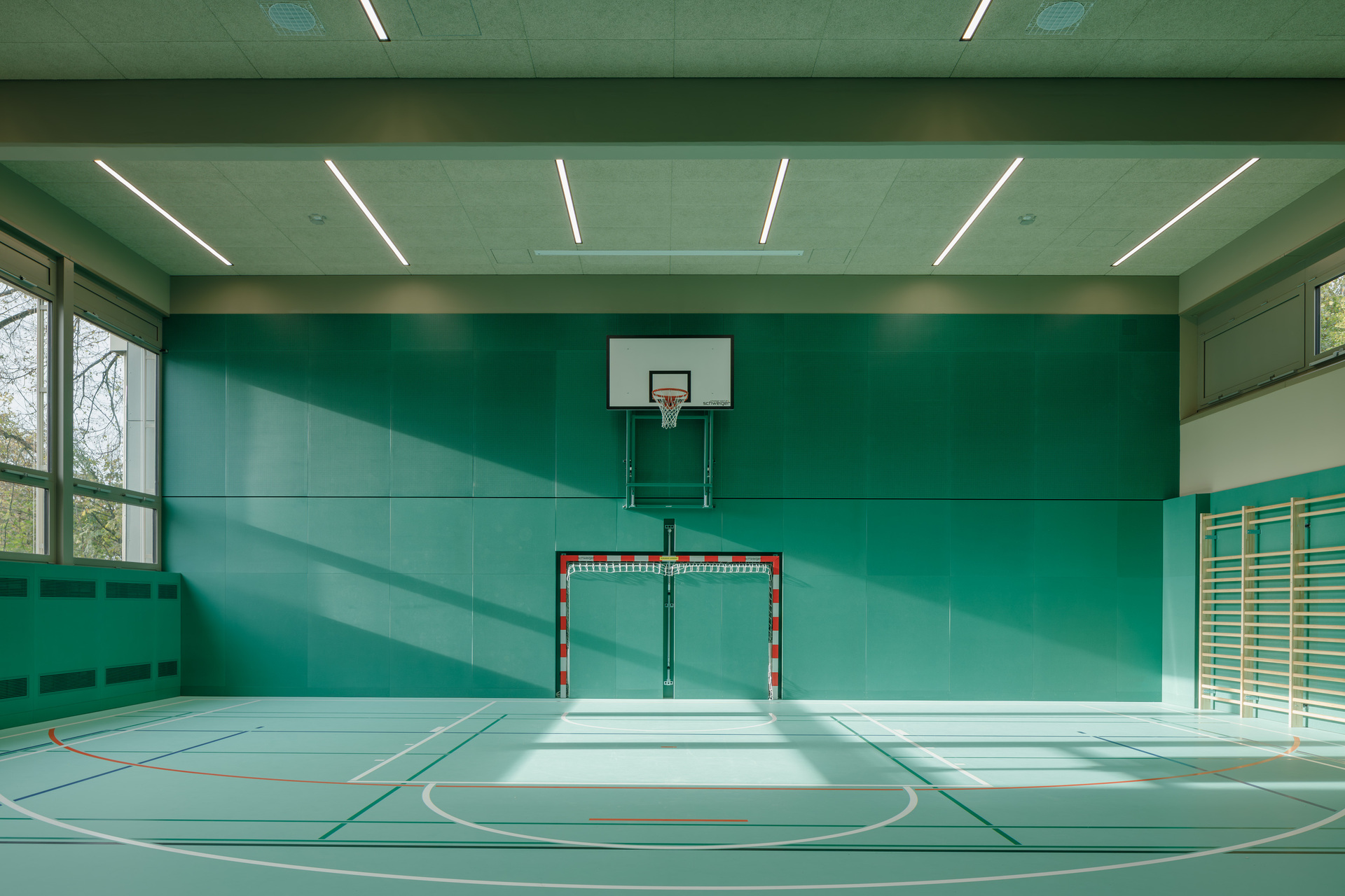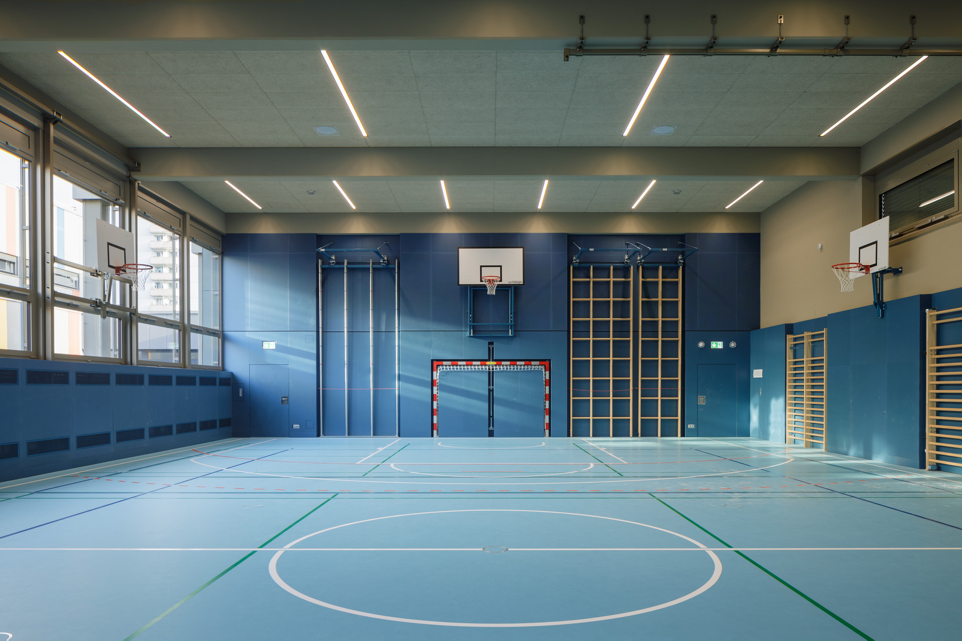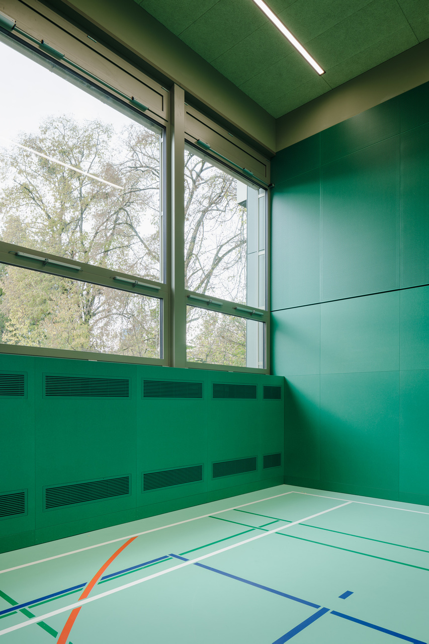 Ein weiteres charakteristisches Element des Bestands sind die Deckenunterzüge, die sich nach außen ziehen und die Kräfte über vorgesetzte Betonstützen abtragen. Diese konstruktiven Elemente sowie Fensterflächen und Deckenfelder sind farblich in gold-beiger Tönung zusammengefasst. Das Farbkonzept mit zwei Farbton-Familien pro Halle begünstigt die Verschränkung von Fassade und Innenraum, von konstruktiven und funktionellen Elementen: Außenstützen, Unterzüge, Decke und Fensterfront, Holzsportboden, MDF-Wände greifen dank dieser dezent-differenzierten Gestaltung stimmig ineinander. So weit möglich, wurde die Blau- und Grünfärbung auch auf die Turngeräte übertragen, was zur neuen Raumqualität und visuellen Harmonie in den Hallen zusätzlich beiträgt. (Text: Architekten, bearbeitet)