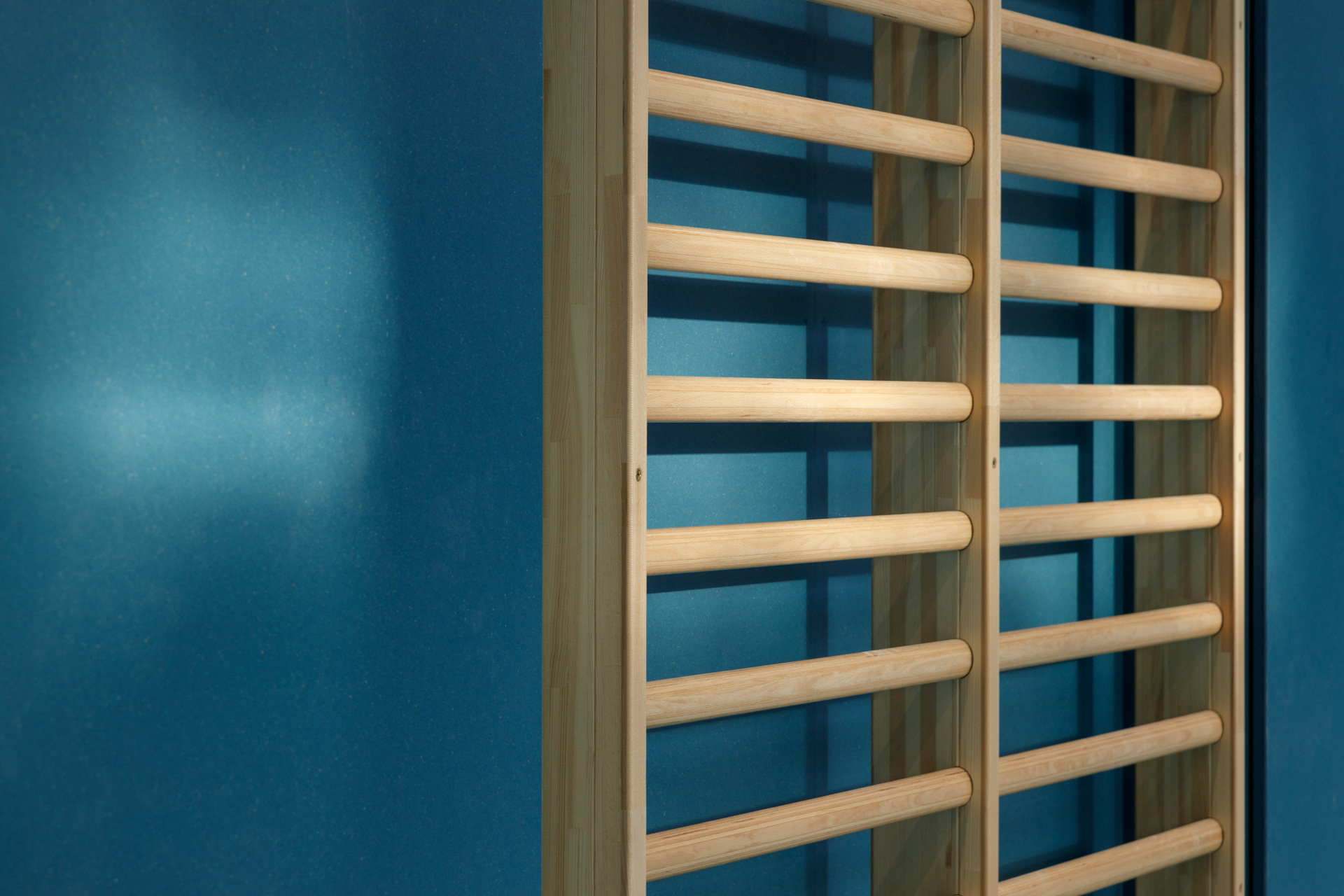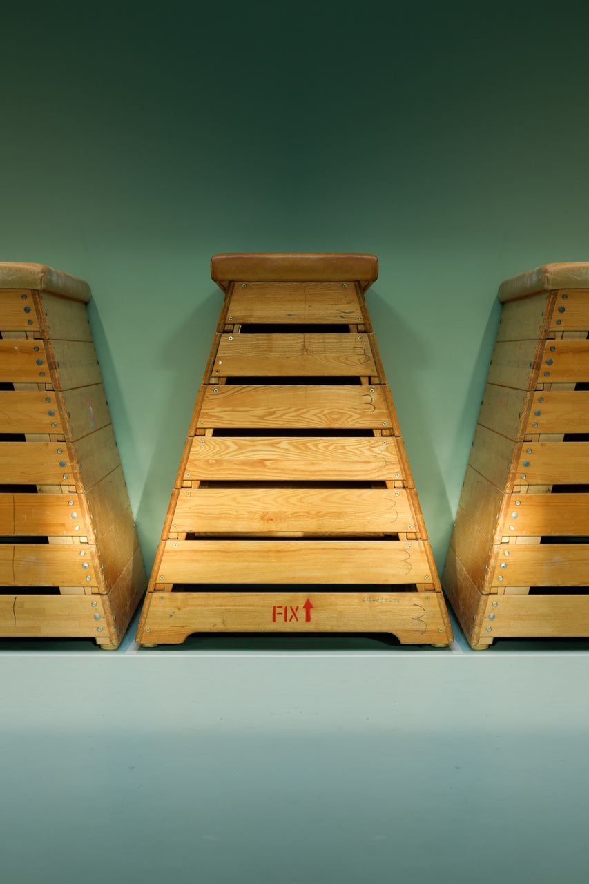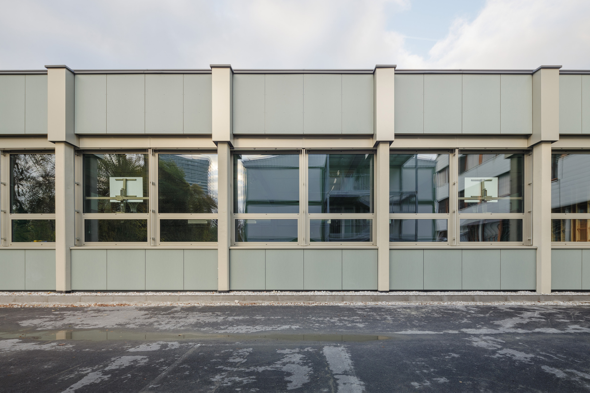 Ein weiteres charakteristisches Element des Bestands sind die Deckenunterzüge, die sich nach außen ziehen und die Kräfte über vorgesetzte Betonstützen abtragen. Diese konstruktiven Elemente sowie Fensterflächen und Deckenfelder sind farblich in gold-beiger Tönung zusammengefasst. Das Farbkonzept mit zwei Farbton-Familien pro Halle begünstigt die Verschränkung von Fassade und Innenraum, von konstruktiven und funktionellen Elementen: Außenstützen, Unterzüge, Decke und Fensterfront, Holzsportboden, MDF-Wände greifen dank dieser dezent-differenzierten Gestaltung stimmig ineinander. So weit möglich, wurde die Blau- und Grünfärbung auch auf die Turngeräte übertragen, was zur neuen Raumqualität und visuellen Harmonie in den Hallen zusätzlich beiträgt. (Text: Architekten, bearbeitet)