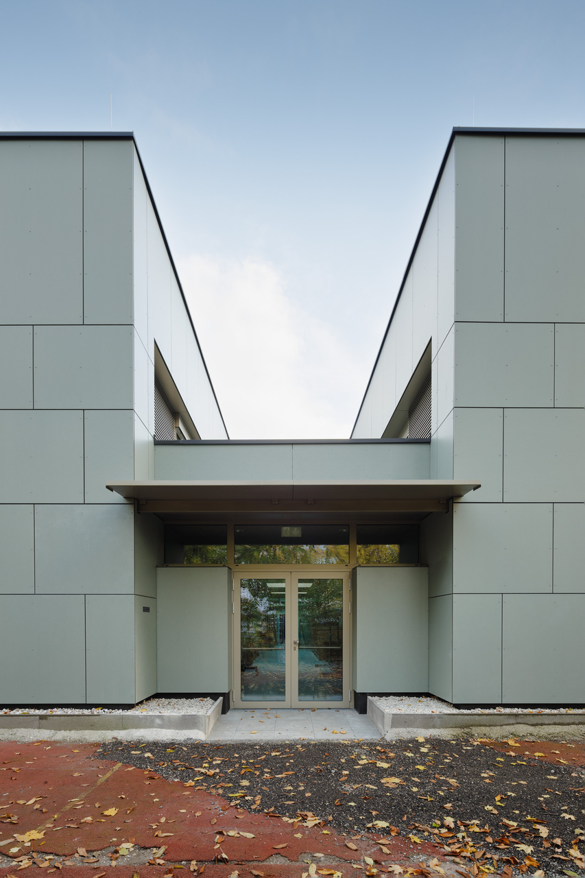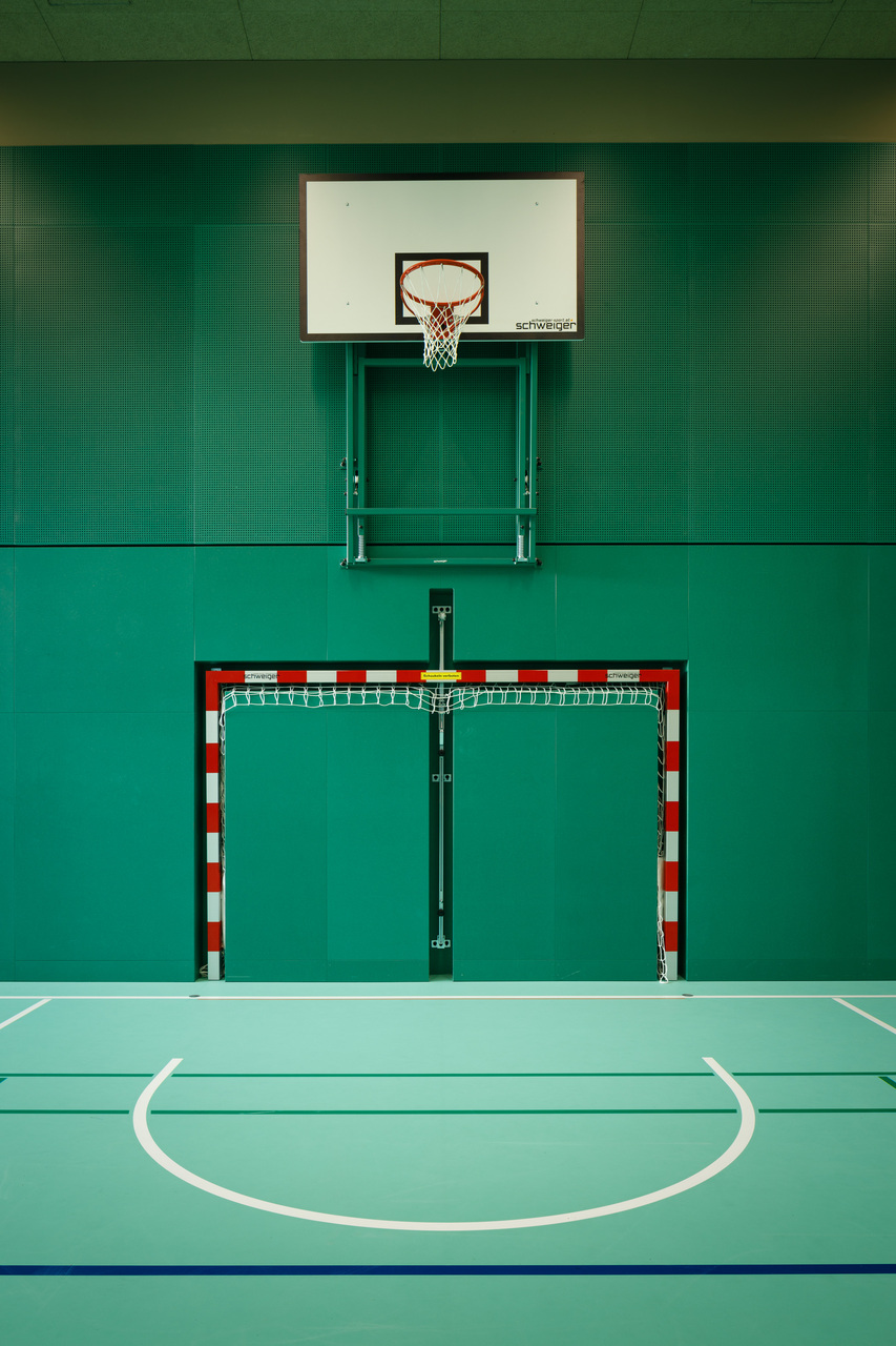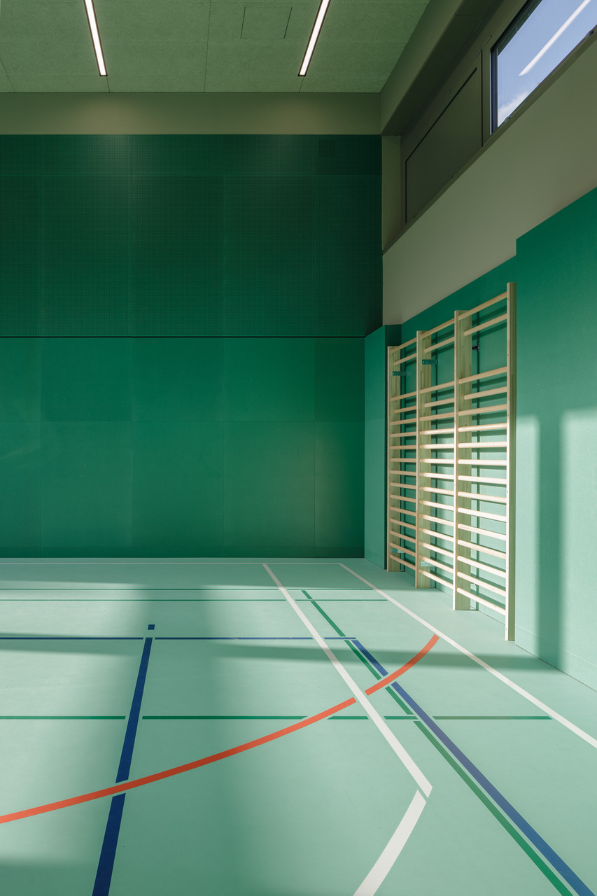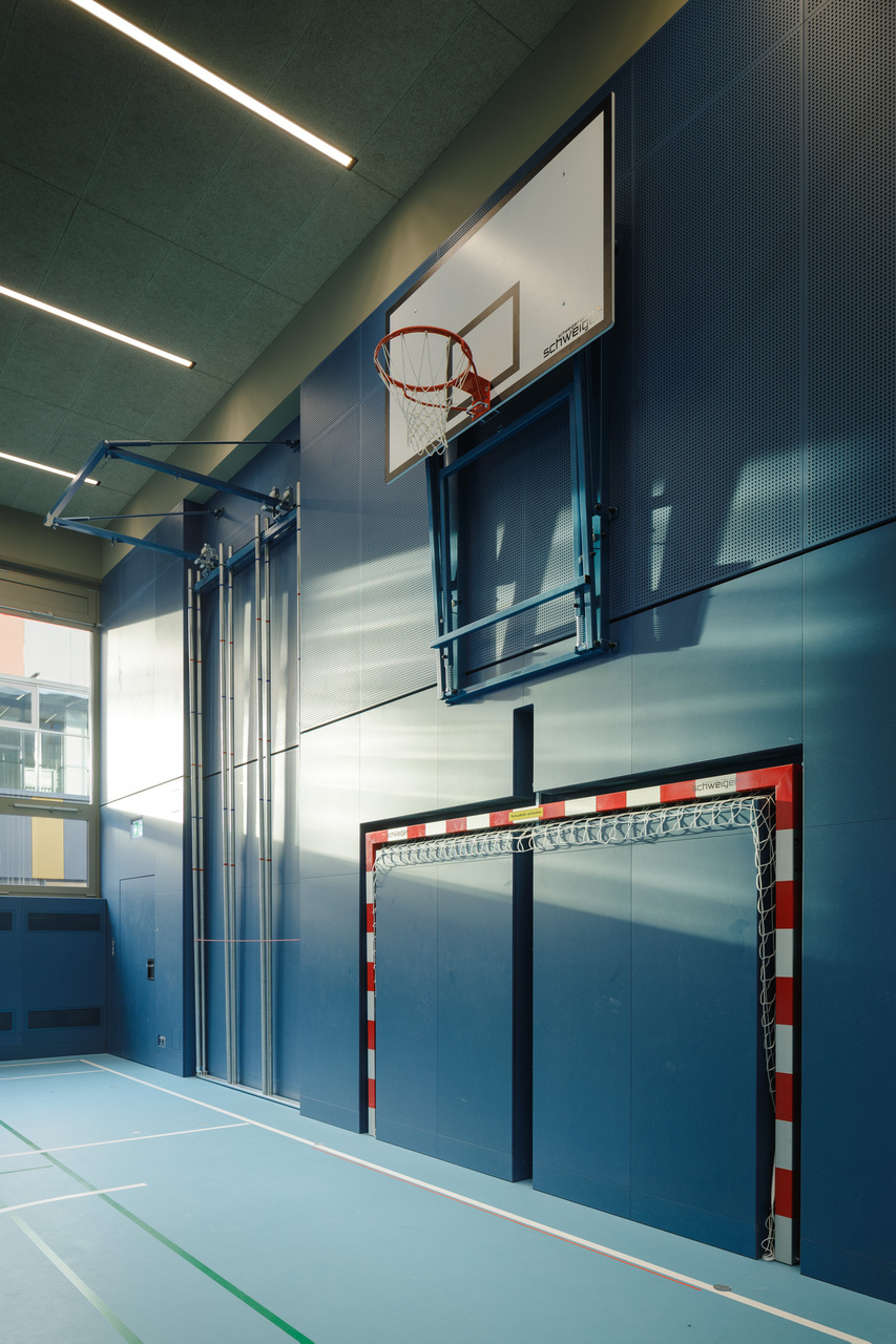 Das neue Konzept setzt auf farbliche Reduktion und Abstraktion. Während die benachbarten Bestandshallen 1 bis 3 gelb belassen wurden, wurden Halle 4 nun in Blau und Halle 5 in Grün gestaltet. Der Geräteraum liegt sowohl räumlich als auch farblich dazwischen. Die differenzierte Farbgestaltung bietet Schüler:innen, Lehrer:innen und vor allem Eltern und externen Besucher:innen klare Orientierung, die sich zudem einfach kommunizieren lässt.