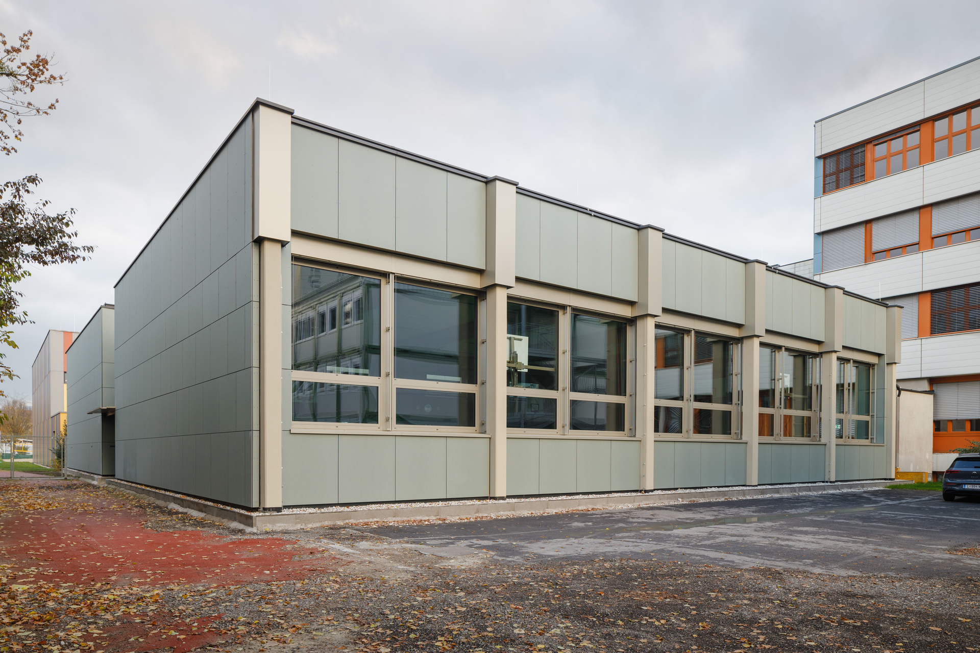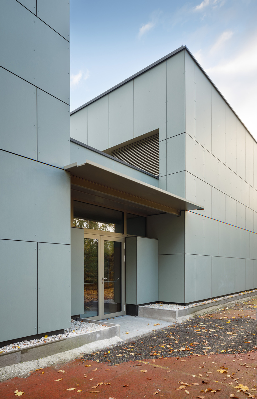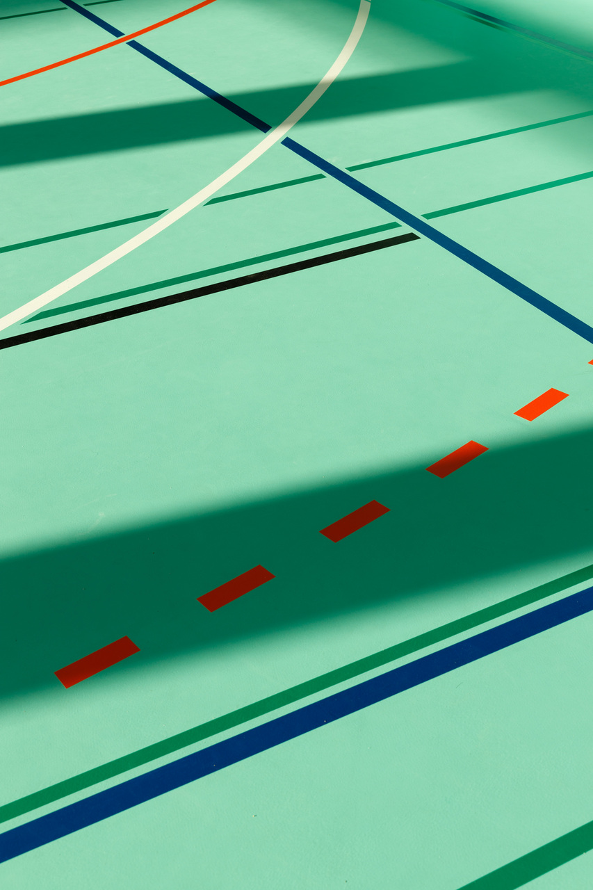 Das neue Konzept setzt auf farbliche Reduktion und Abstraktion. Während die benachbarten Bestandshallen 1 bis 3 gelb belassen wurden, wurden Halle 4 nun in Blau und Halle 5 in Grün gestaltet. Der Geräteraum liegt sowohl räumlich als auch farblich dazwischen. Die differenzierte Farbgestaltung bietet Schüler:innen, Lehrer:innen und vor allem Eltern und externen Besucher:innen klare Orientierung, die sich zudem einfach kommunizieren lässt.