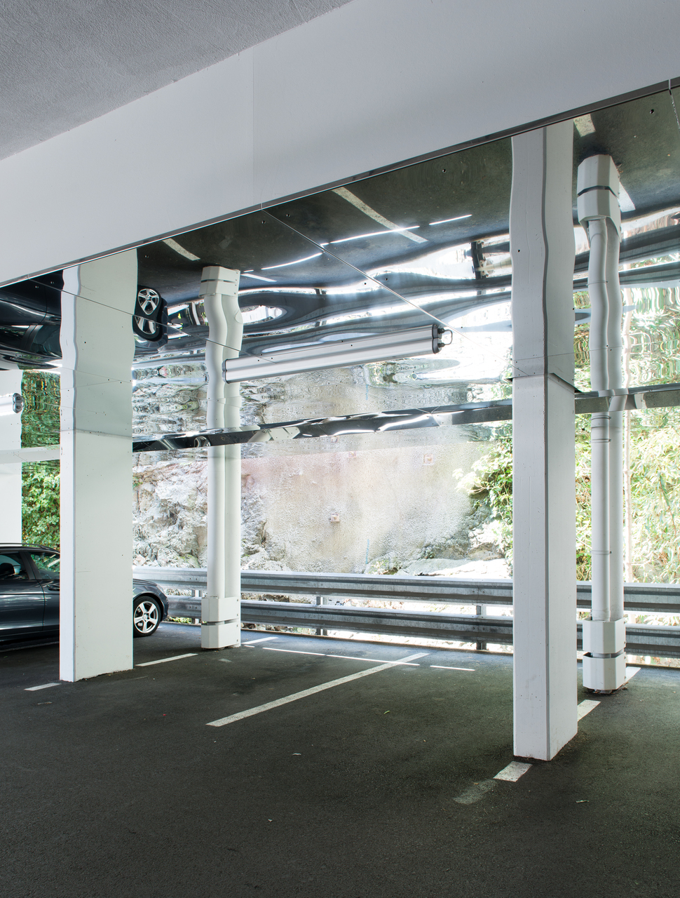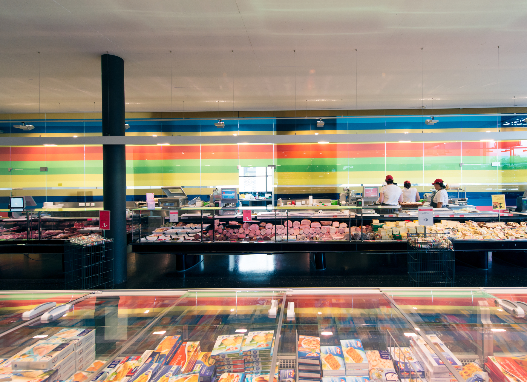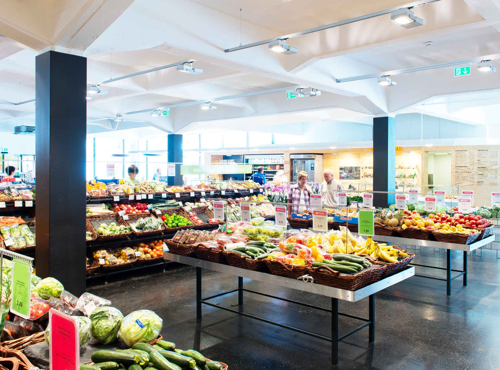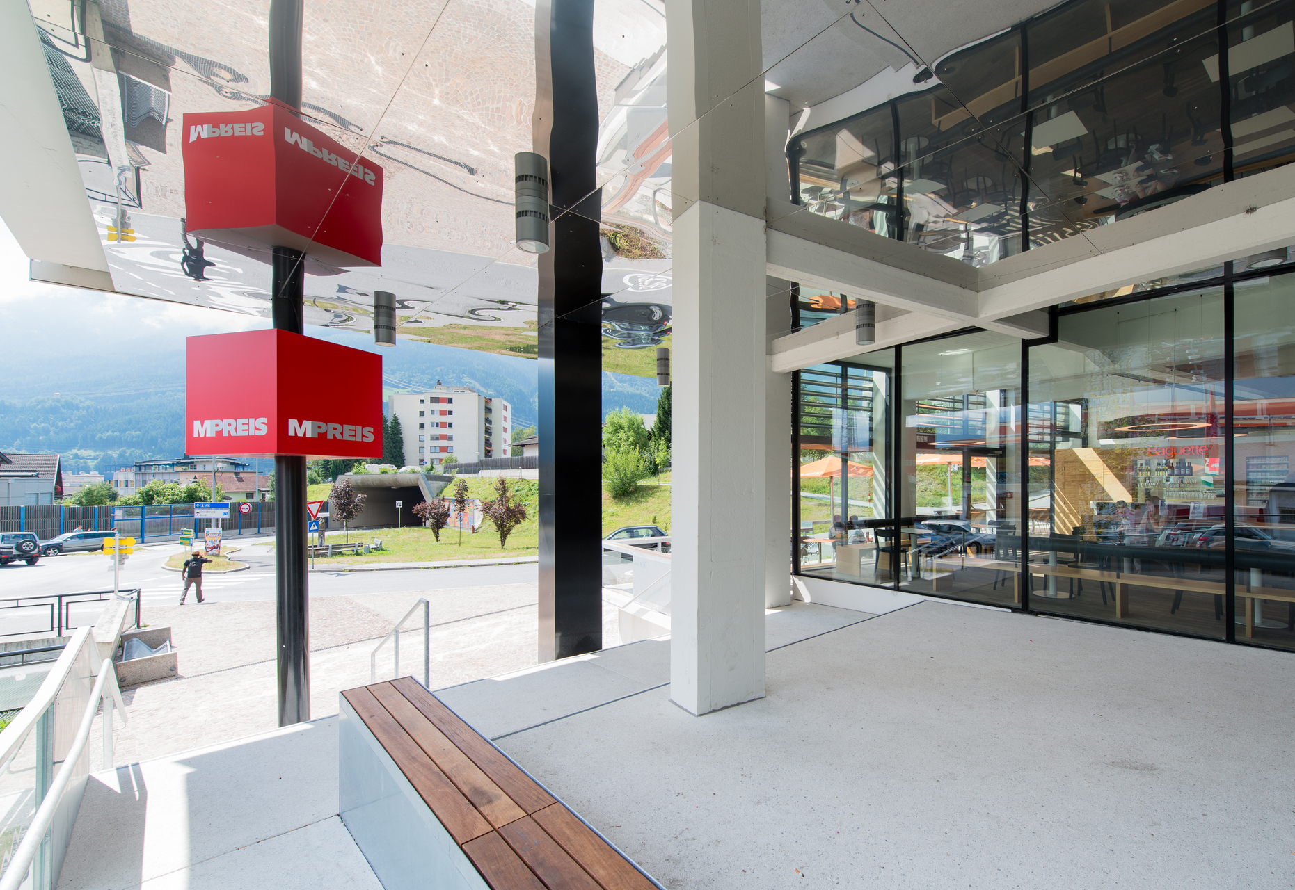 Trotz anfänglicher Skepsis des Bauherrn wurde schließlich tatsächlich alles umgestülpt und damit ein Supermarkt für die umliegenden Siedlungen mit einladendem Gesicht zur Straße geschaffen. Der Verkaufsraum wurde größer und heller, der Baguette-Bereich als Ort des Verweilens deutlich vergrößert und wirklich durch eine Terrasse Richtung Kreisverkehr ergänzt. Die bestehende Tiefgarage (Entwurf: Peter Lorenz) wurde ganz in Weiß getaucht und hell erleuchtet – die dahinter frei sichtbare Felswand in Szene gesetzt. (Text: Claudia Wedekind, nach einem Text des Architekten)