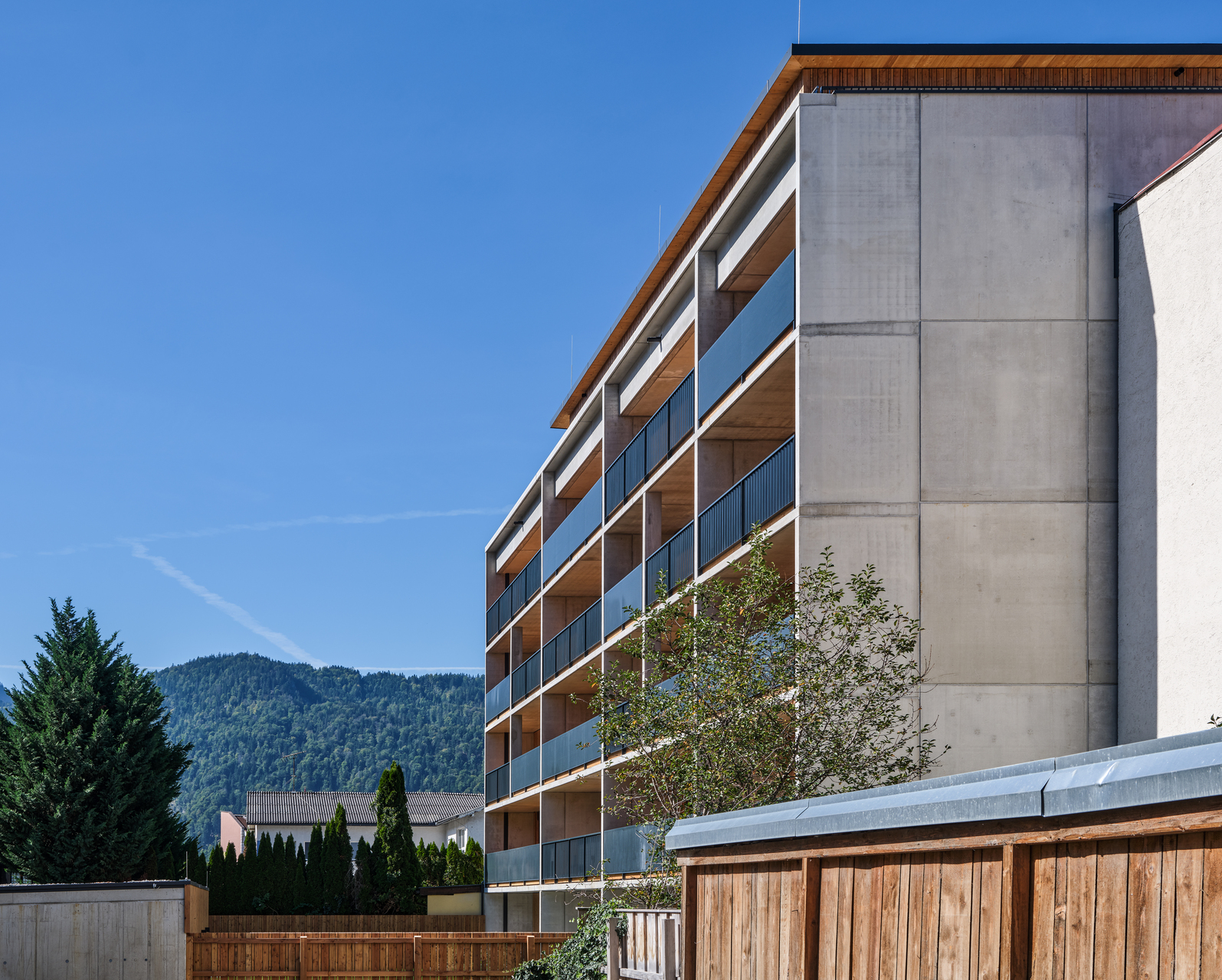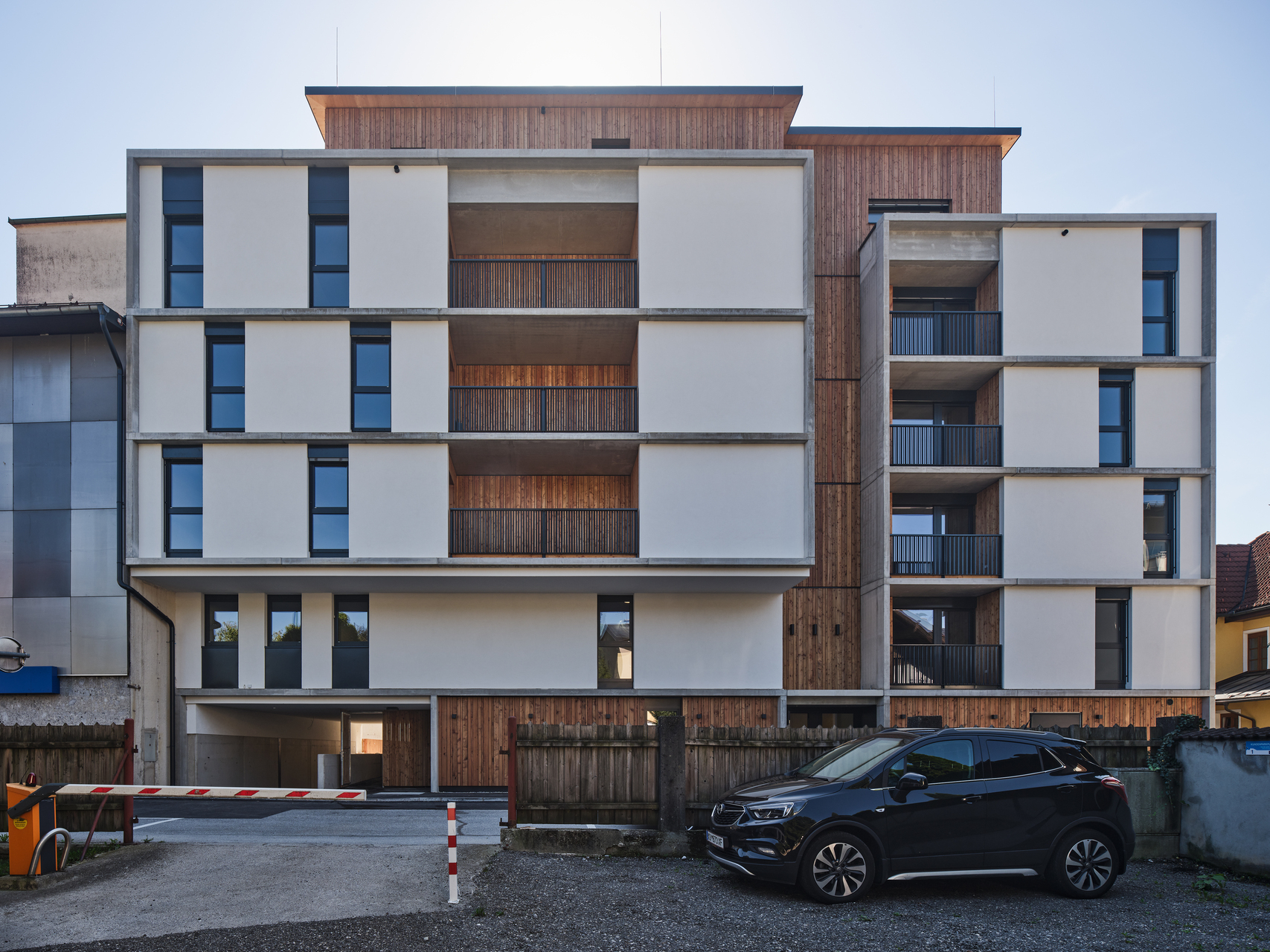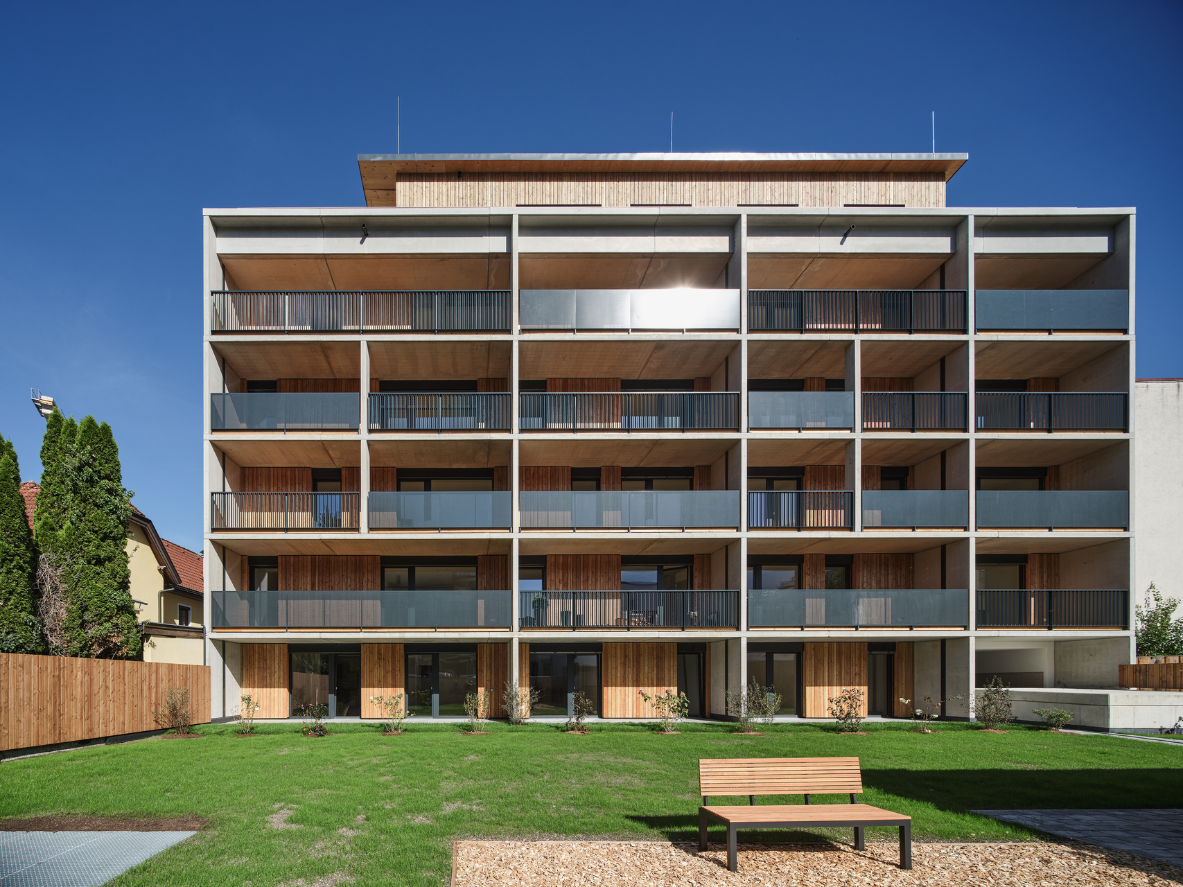Der Großteil der in den vier Geschoßen untergebrachten 2-Zimmer-Wohnungen ist zur ruhigen Gartenzone orientiert, wo mit den vorgelagerten Balkonen durch integrierte Blumentröge eine „grüne Fassade“ entstehen soll. Ganz oben, im zurückgesetzten Dachgeschoß, befindet sich eine großzügige Penthouse-Wohnung mit Rundumblick und entsprechenden Dachterrassen. (Text: Architekt:innen, bearbeitet)