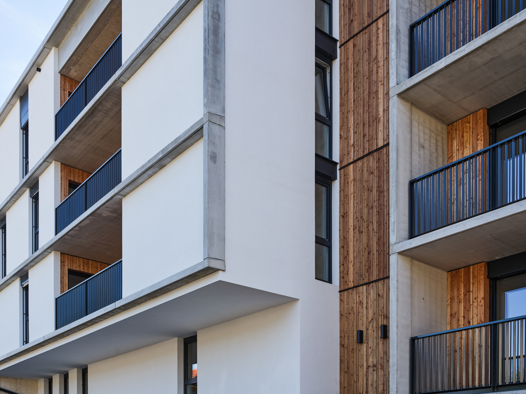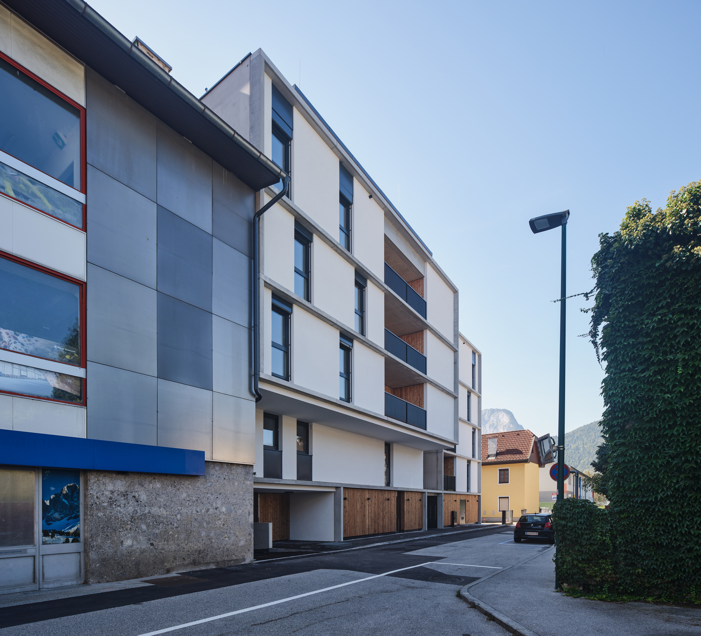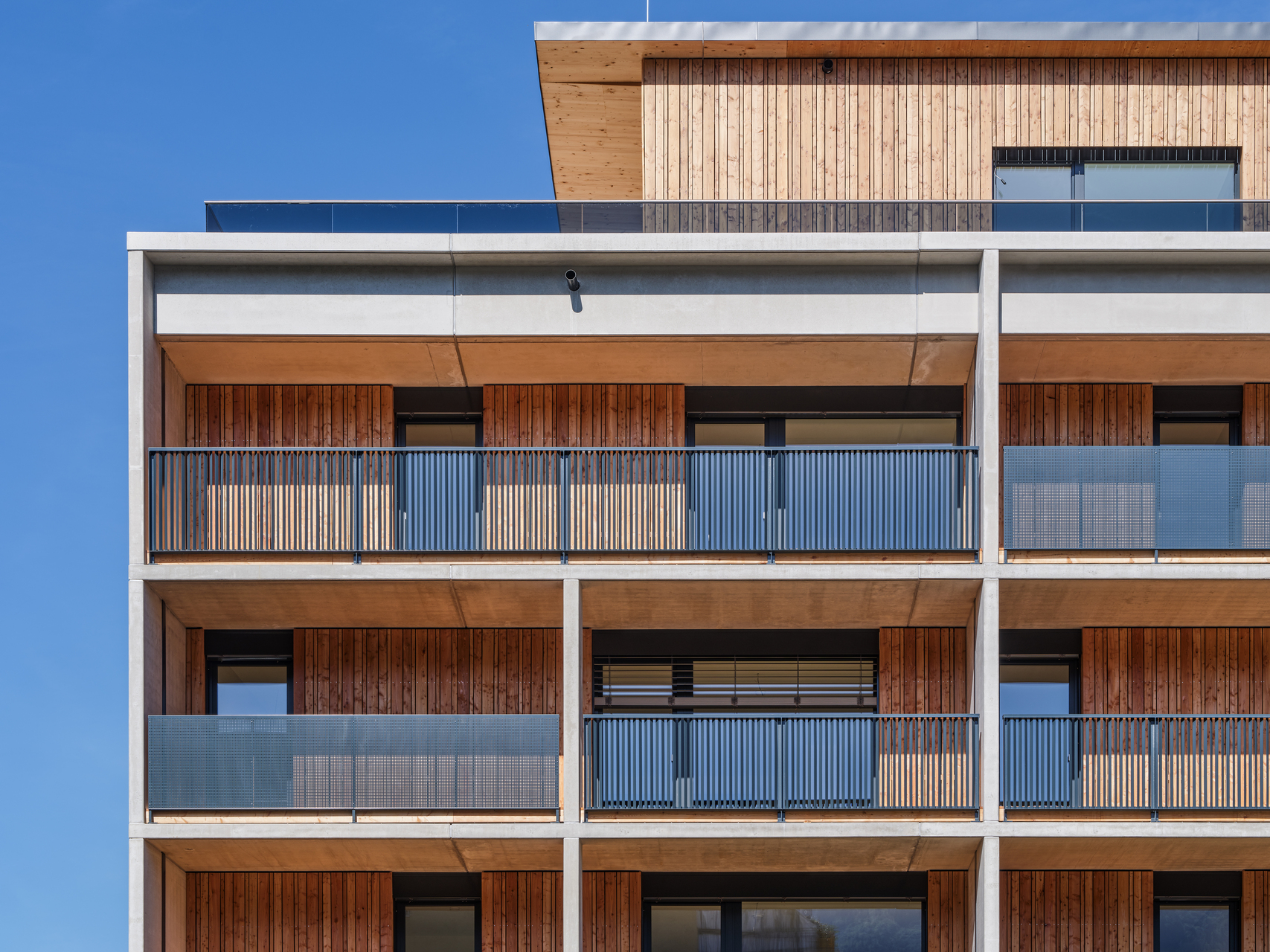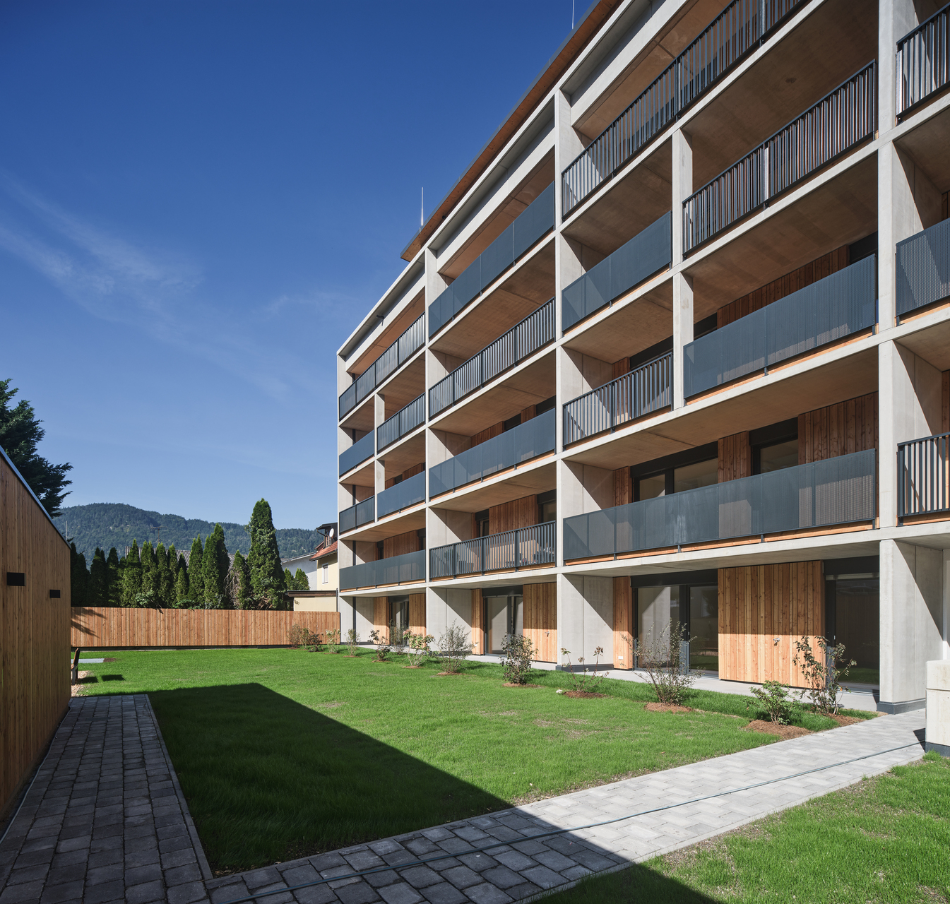 Der Großteil der in den vier Geschoßen untergebrachten 2-Zimmer-Wohnungen ist zur ruhigen Gartenzone orientiert, wo mit den vorgelagerten Balkonen durch integrierte Blumentröge eine „grüne Fassade“ entstehen soll. Ganz oben, im zurückgesetzten Dachgeschoß, befindet sich eine großzügige Penthouse-Wohnung mit Rundumblick und entsprechenden Dachterrassen. (Text: Architekt:innen, bearbeitet)