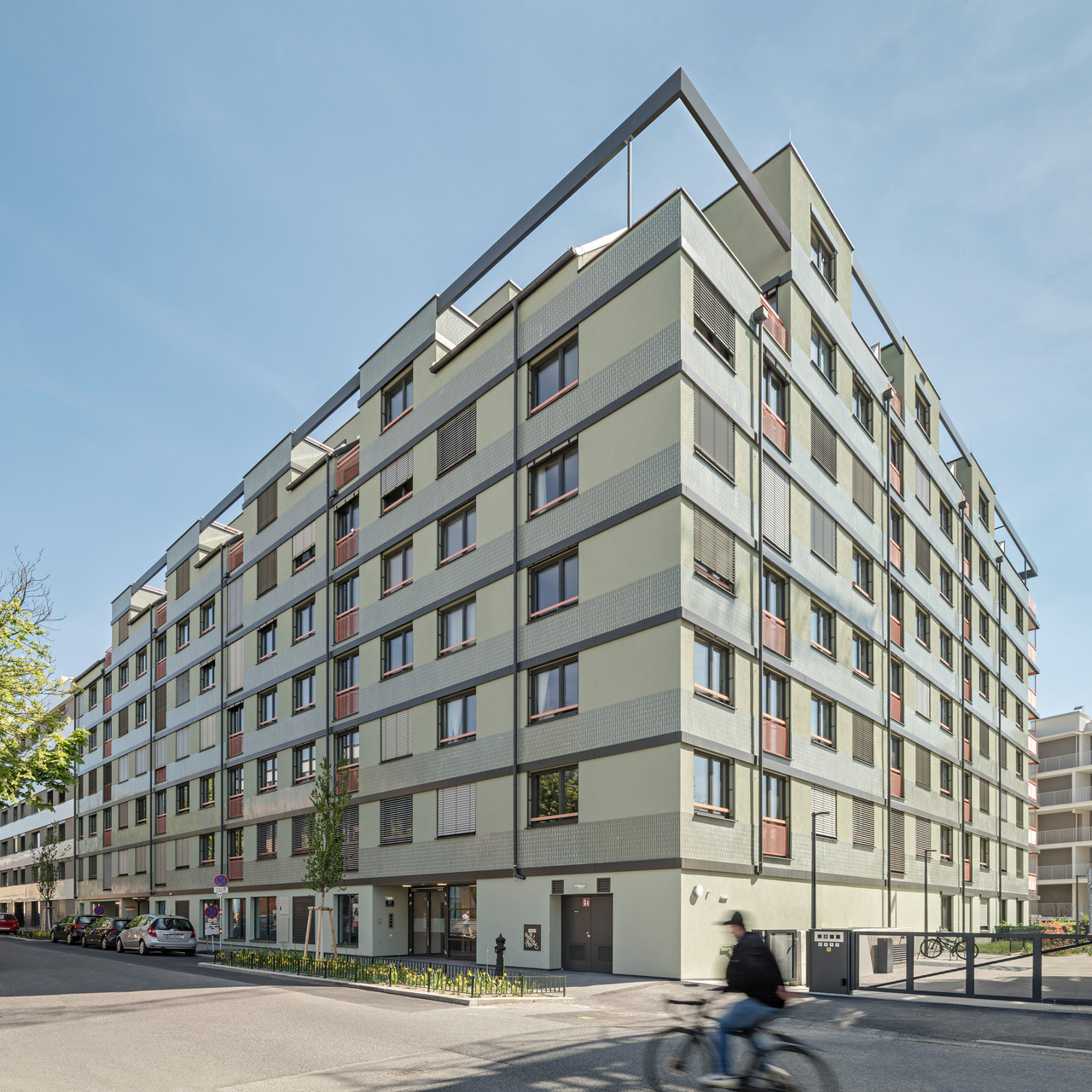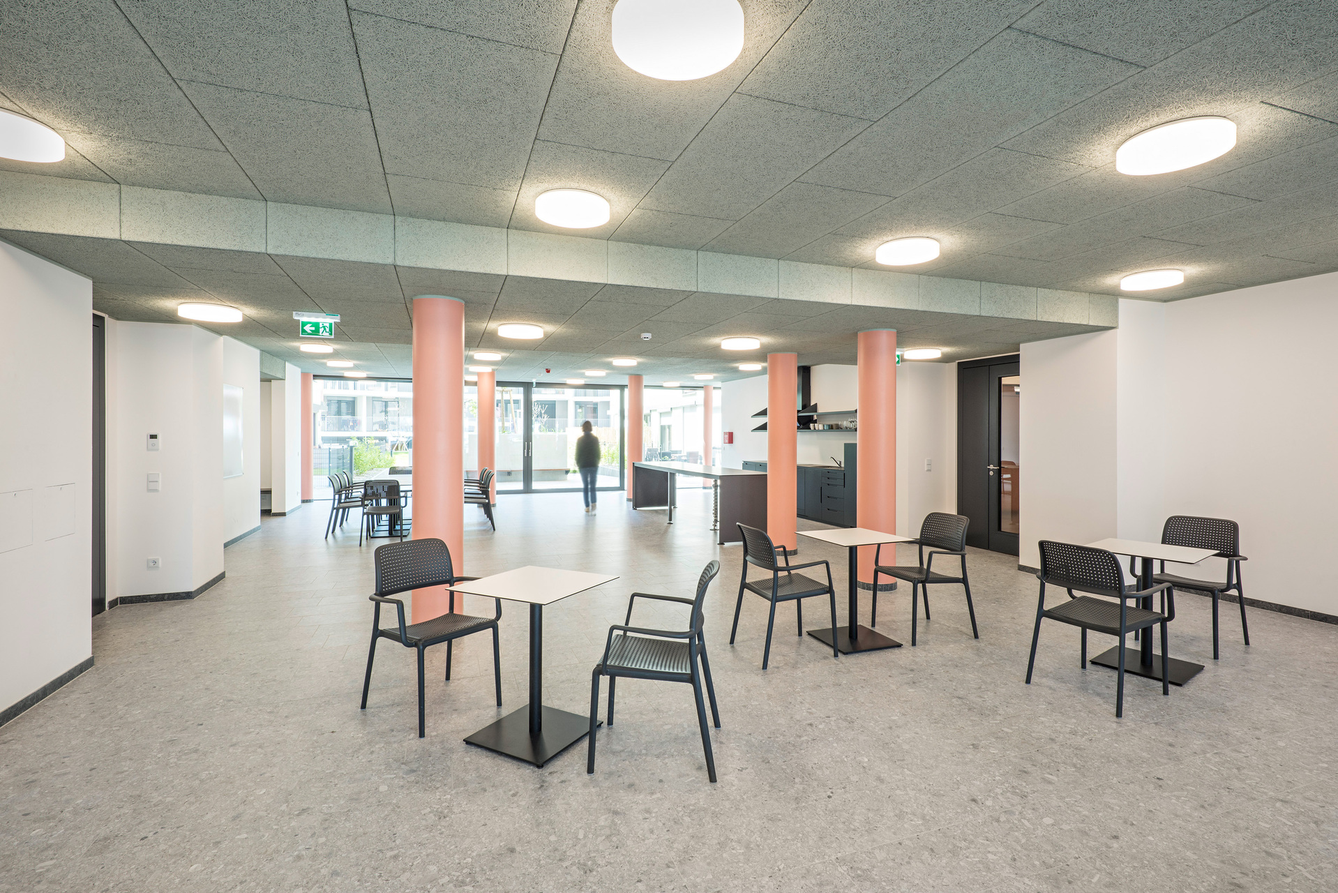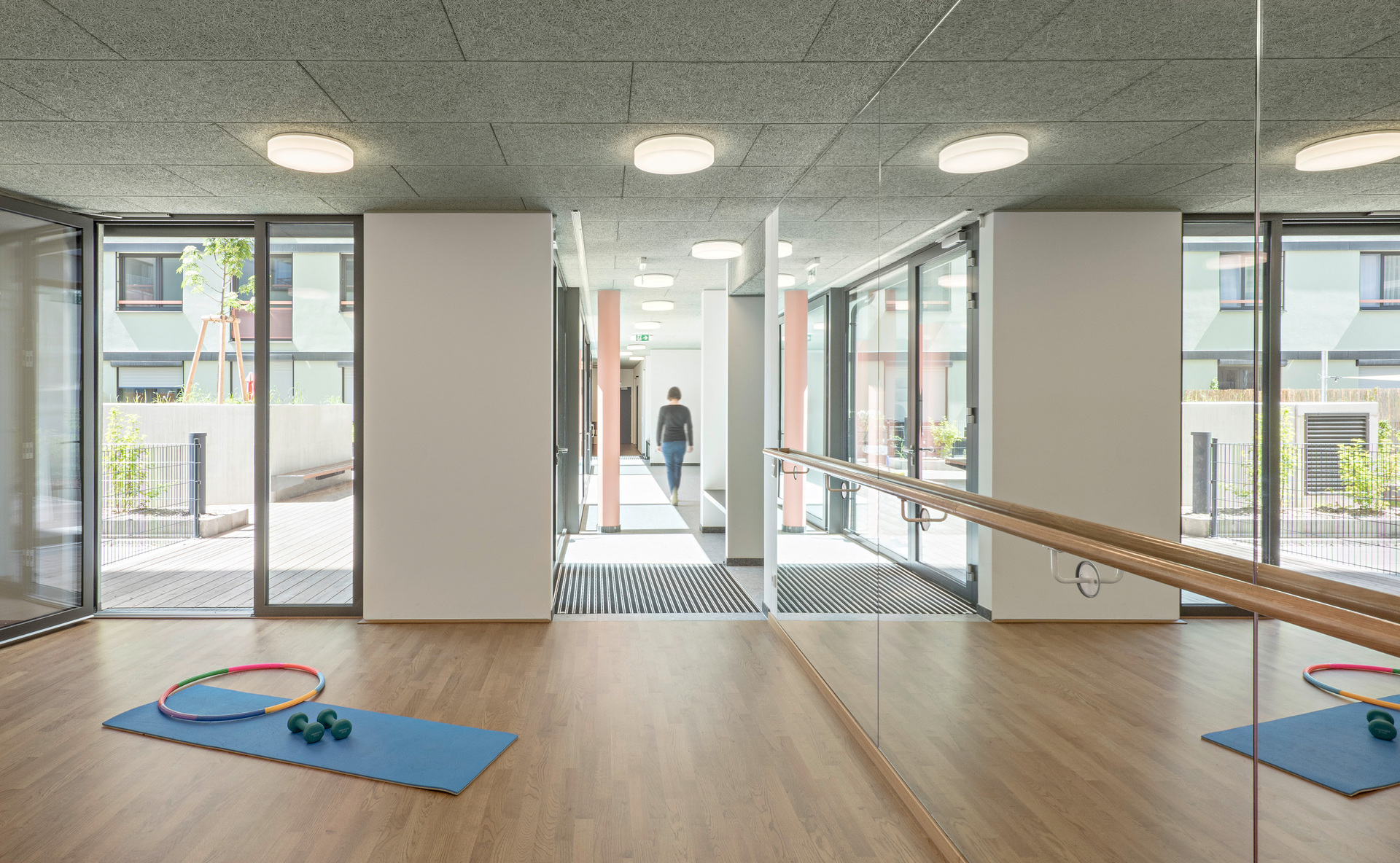 Um den besonderen Bedarf Alleinerziehender an guter Nachbarschaft und Möglichkeiten für den sozialen Austausch abzudecken, gibt es im EG einen durchgesteckten BewohnerInnentreff mit Teeküche, einen Bewegungsraum und eine Waschküche.