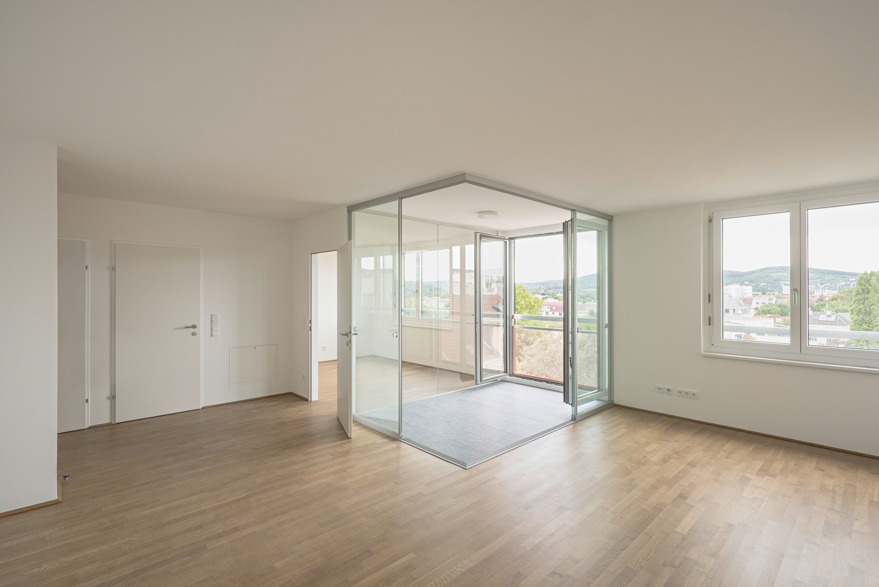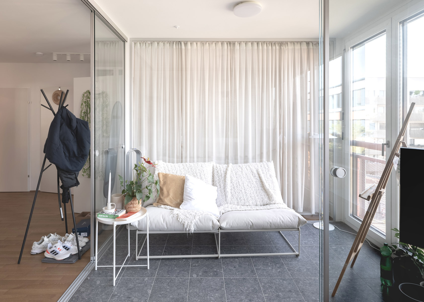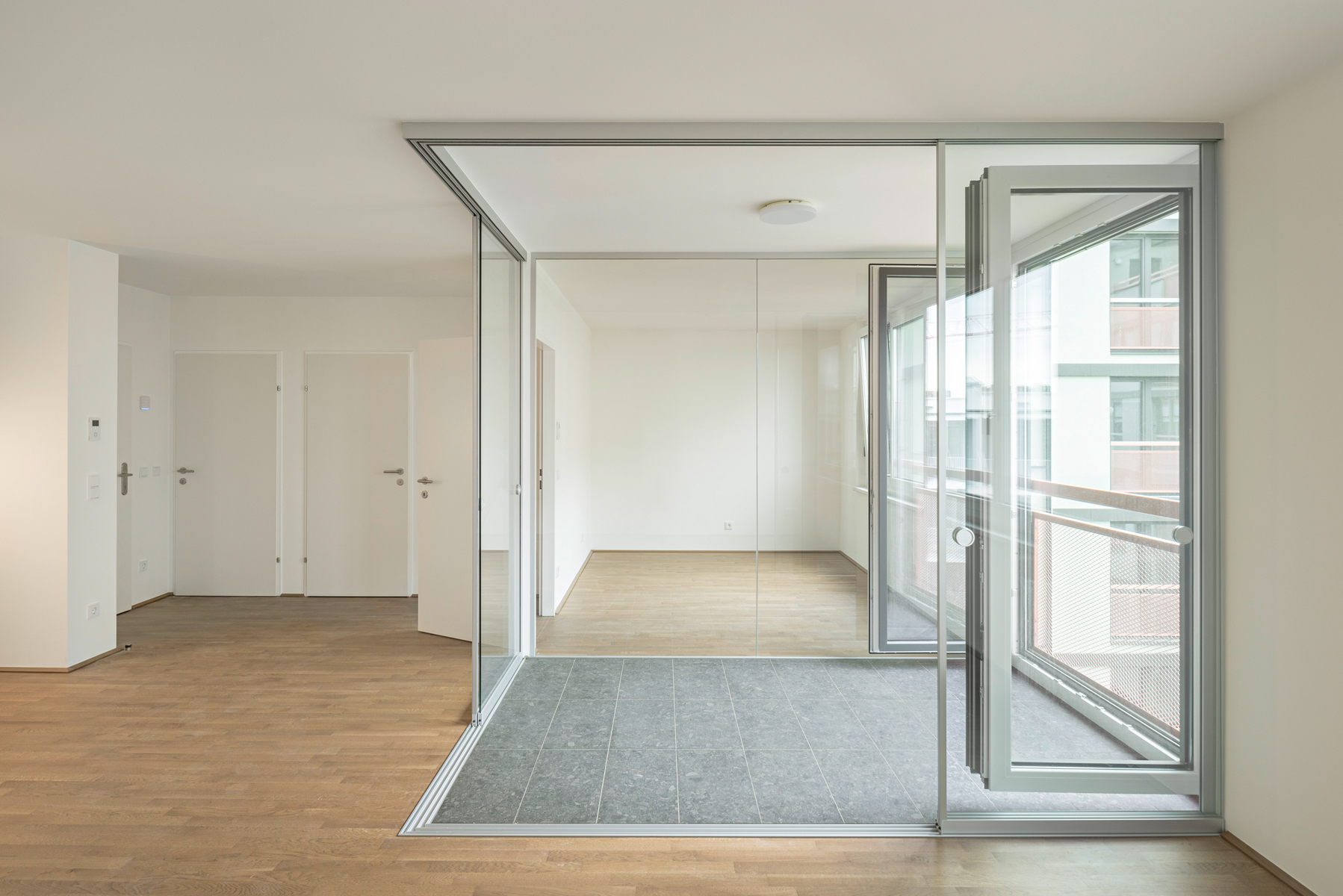 Mindestens ebenso wichtig ist Übersichtlichkeit: Die Wohnungen sind so geschnitten, dass man beim Kochen, Homeworking oder Entspannen den Nachwuchs im Blick behalten kann. Dabei hilft die zimmertief in das Wohnungsvolumen eingeschnittene vollverglaste Loggia, durch die hindurch sich alle Bereiche überblicken lassen. Der Raum ist als zusätzlicher Aufenthaltsraum (Wintergarten, Büro, etc.) ganzjährig nutzbar. Um bei Bedarf die benötigte Privatheit sicherzustellen, lassen sich einzelne Zimmer und Raumbereiche durch Vorhänge visuell abtrennen. (Autor: Achim Geissinger, nach einem Text der Architekten)