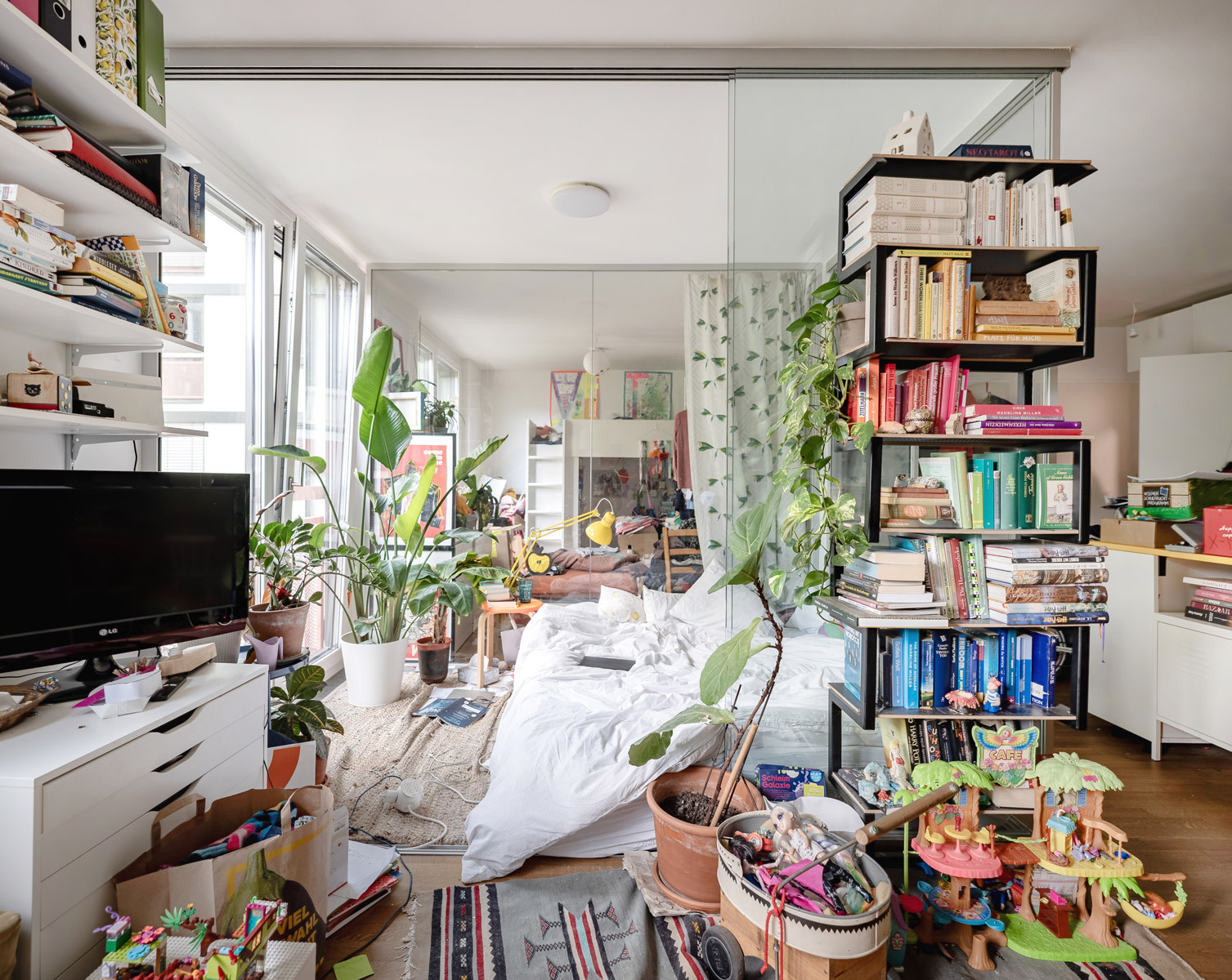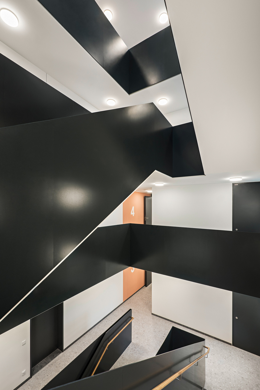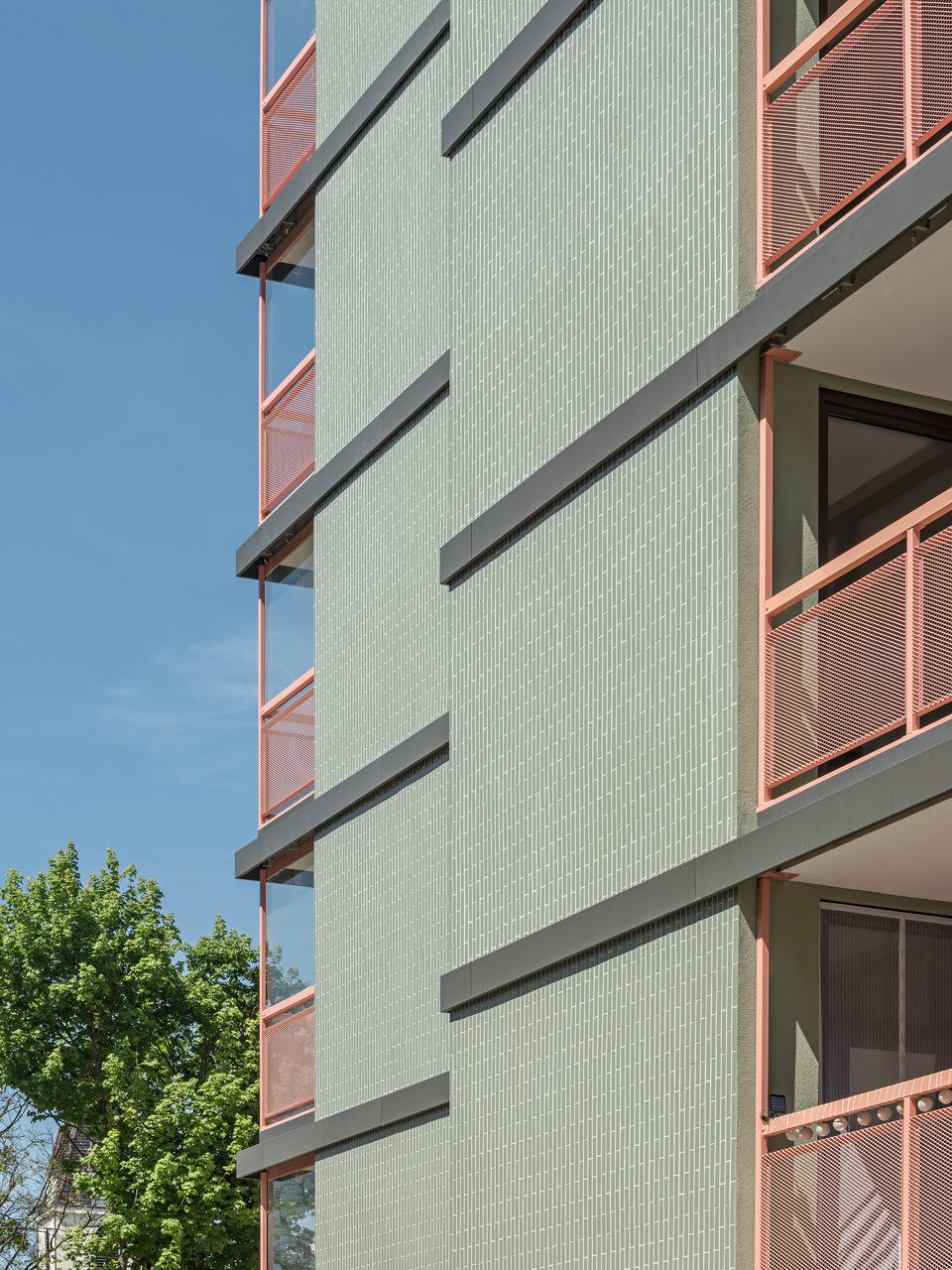 Mindestens ebenso wichtig ist Übersichtlichkeit: Die Wohnungen sind so geschnitten, dass man beim Kochen, Homeworking oder Entspannen den Nachwuchs im Blick behalten kann. Dabei hilft die zimmertief in das Wohnungsvolumen eingeschnittene vollverglaste Loggia, durch die hindurch sich alle Bereiche überblicken lassen. Der Raum ist als zusätzlicher Aufenthaltsraum (Wintergarten, Büro, etc.) ganzjährig nutzbar. Um bei Bedarf die benötigte Privatheit sicherzustellen, lassen sich einzelne Zimmer und Raumbereiche durch Vorhänge visuell abtrennen. (Autor: Achim Geissinger, nach einem Text der Architekten)